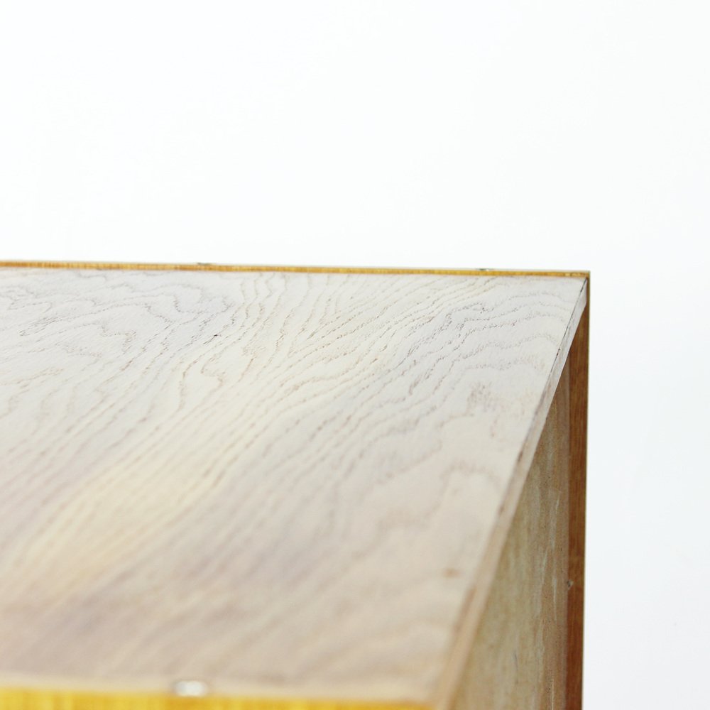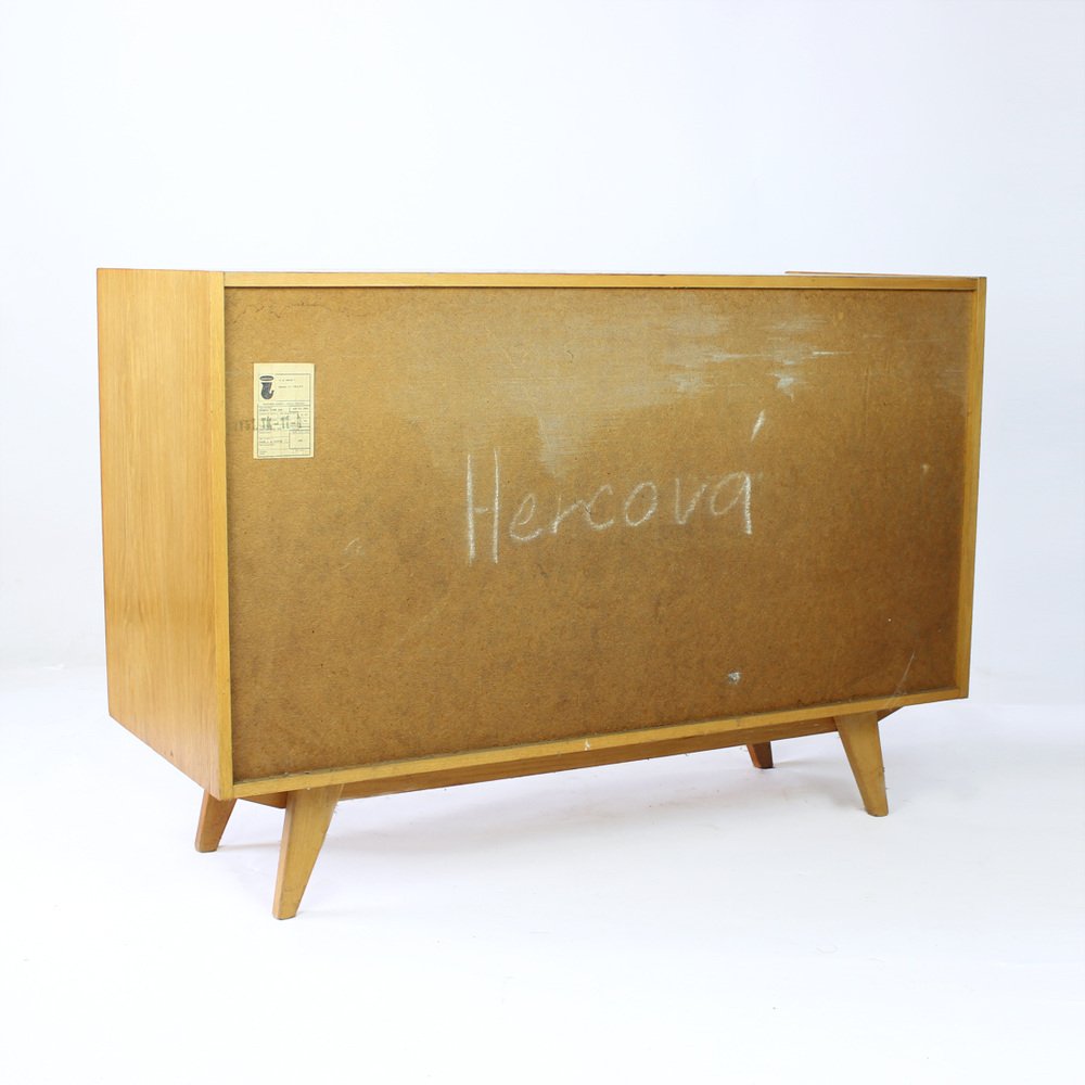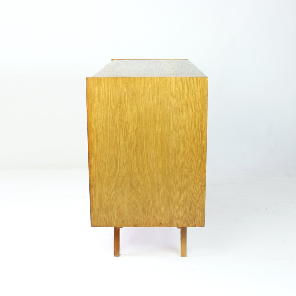 On the heels of early successes, Jiroutek became the head of design at Interier Praha in 1958 and soon after began work on the U-450 series. The designs were heavily inspired by the watershed ’58 Expo in Brussels, which moved Czech postwar design generally toward a “softer” modernism—one characterized by pastel colors, new geometries, and the use of modern materials like engineered composites, glass, and concrete. Jiroutek became know especially for the simple morphologies of oak-veneered sideboards and cabinets with sleekly color-blocked sliding doors and drawers.