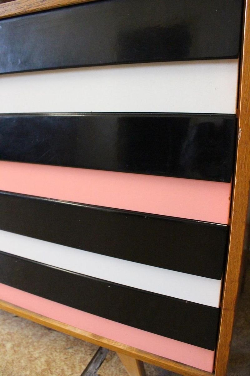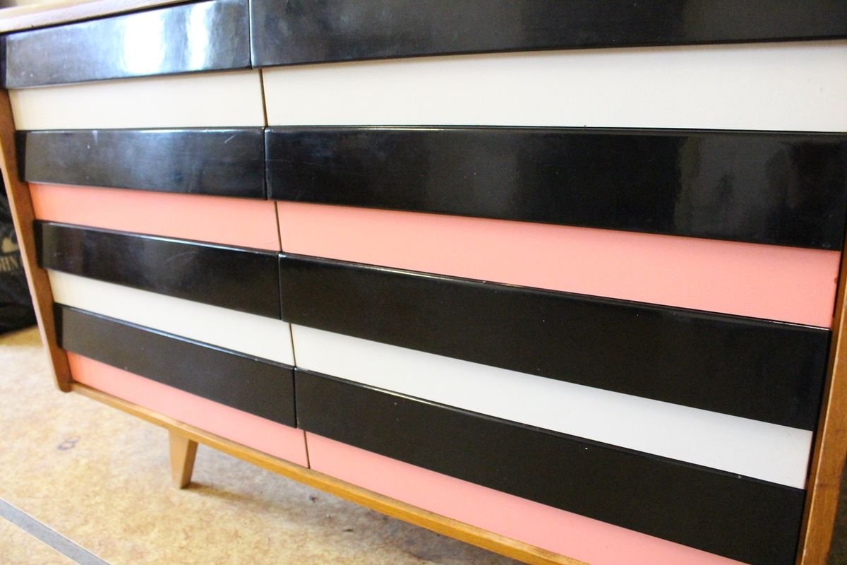 On the heels of early successes, Jiroutek became the head of design at Interier Praha in 1958 and soon after began work on the U-450 series. The designs were heavily inspired by the watershed ’58 Expo in Brussels, which moved Czech postwar design generally toward a “softer” modernism—one characterized by pastel colors, new geometries, and the use of modern materials like engineered composites, glass, and concrete. Jiroutek became know especially for the simple morphologies of oak-veneered sideboards and cabinets with sleekly color-blocked sliding doors and drawers.