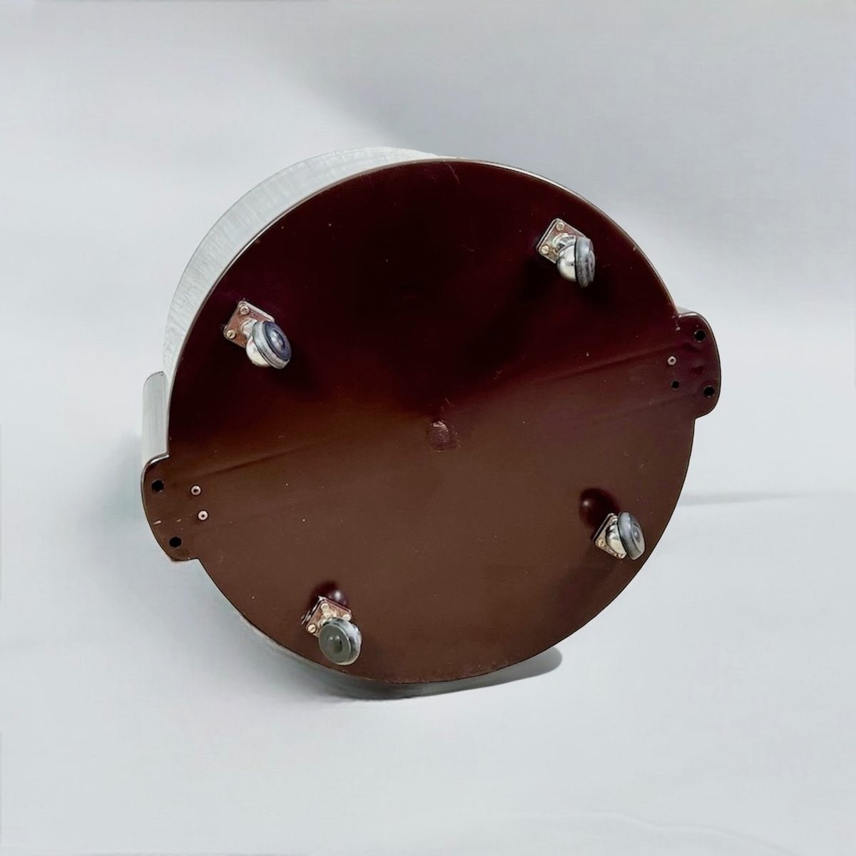 Inside the round body there is a compartment for four bottles and a compartment for magazines.