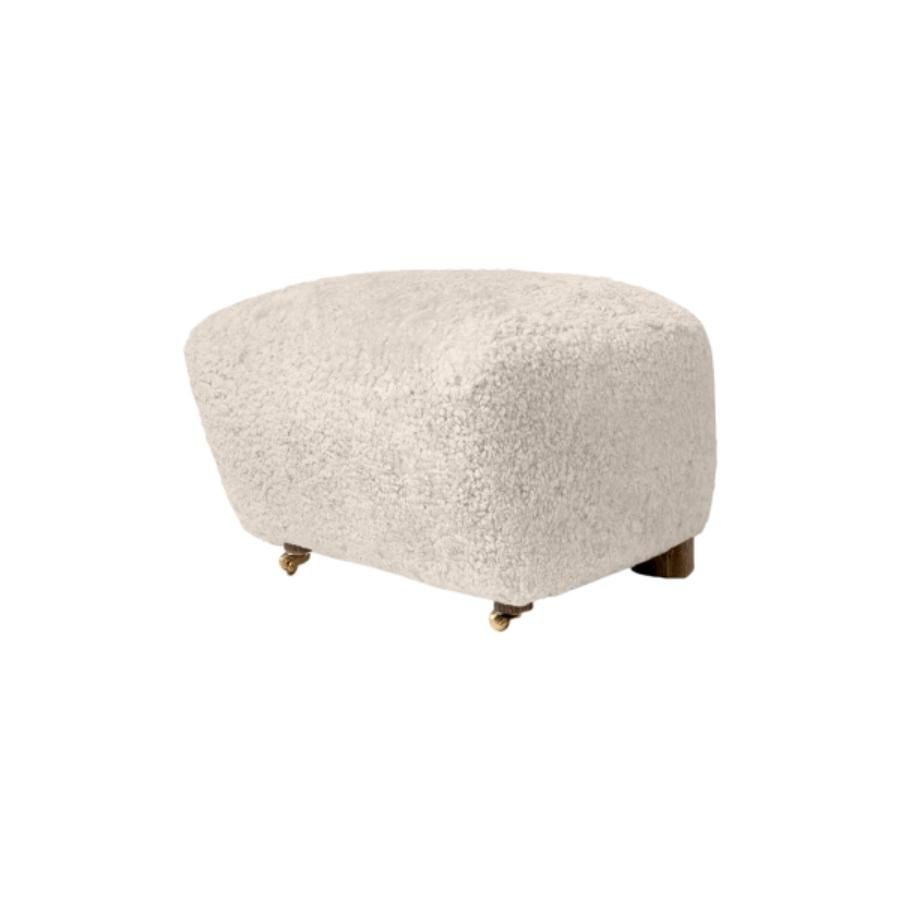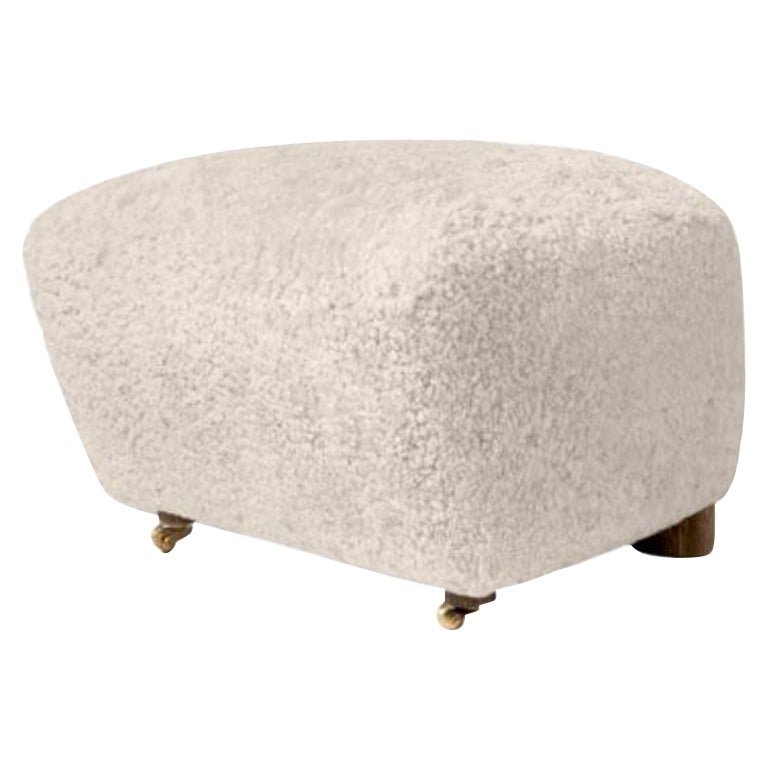 Moonlight smoked Oak Sheepskin the Tired Man footstool by Lassen Dimensions: W 55 x D 53 x H 36 cm Materials: Sheepskin Flemming Lassen designed the overstuffed easy chair, The Tired Man, for The Copenhagen Cabinetmakers’ Guild Competition in 1935. It is characterised by organic, bearlike shapes and then as now it created a sensation with its curved form and voluminous armrests. Sitting in the chair should, in Flemming Lassen’s own ords, be ”as warm and safe as a polar bear cub in the arms of its mother in the middle of the ice cap”. The family man Flemming Lassen valued intimate relationships - with its warm exterior, The Tired Man invokes domestic cosiness and socialising by candlelight.
