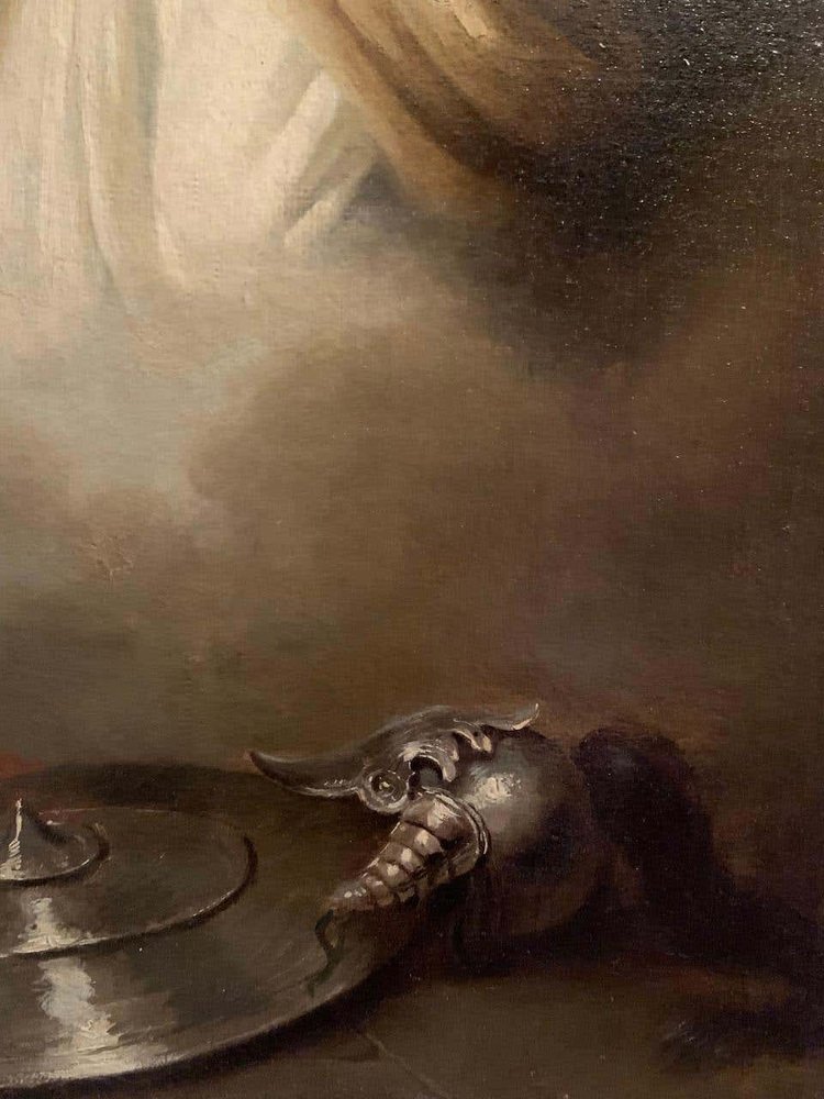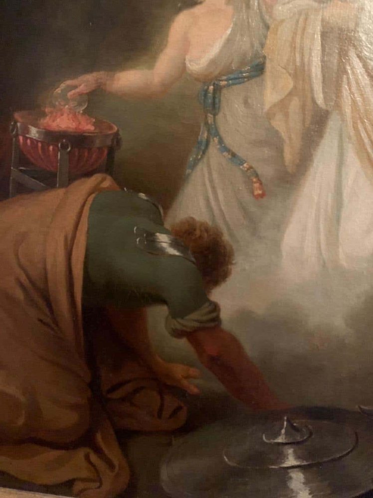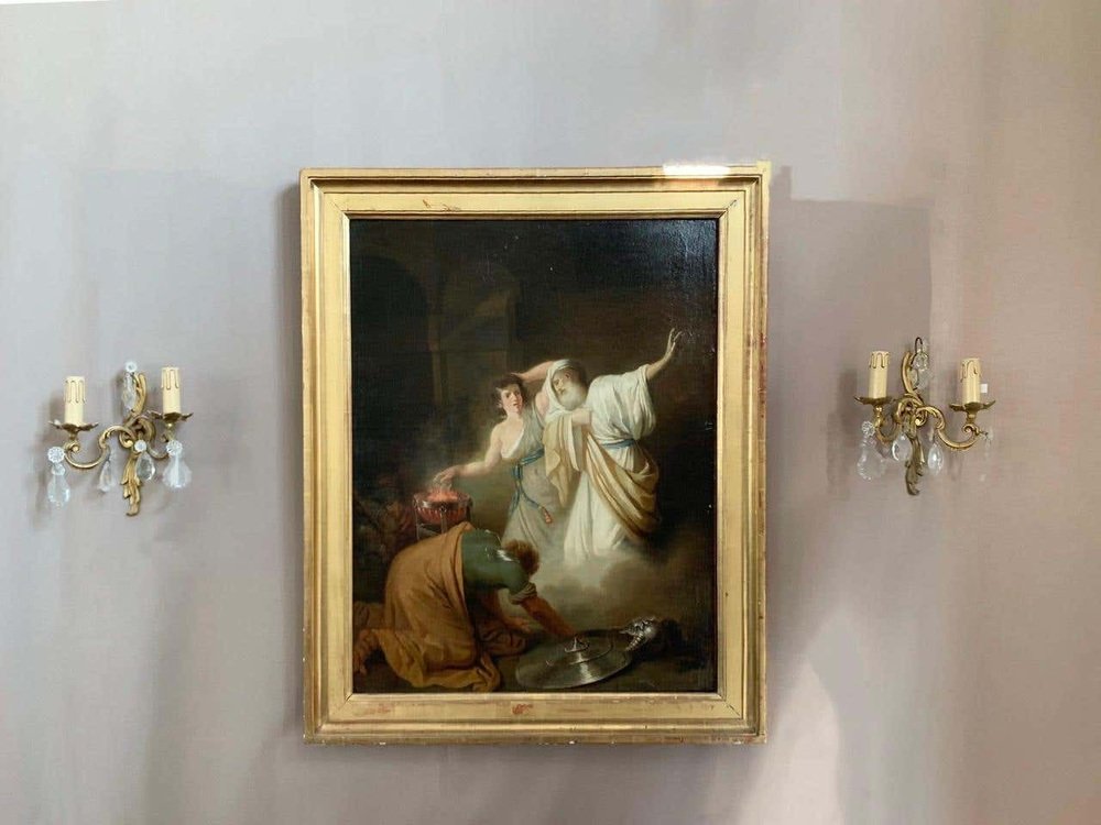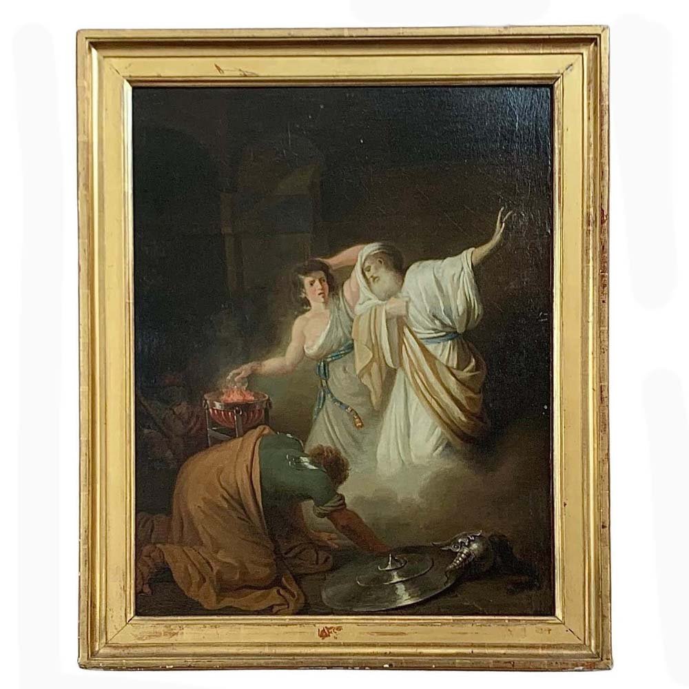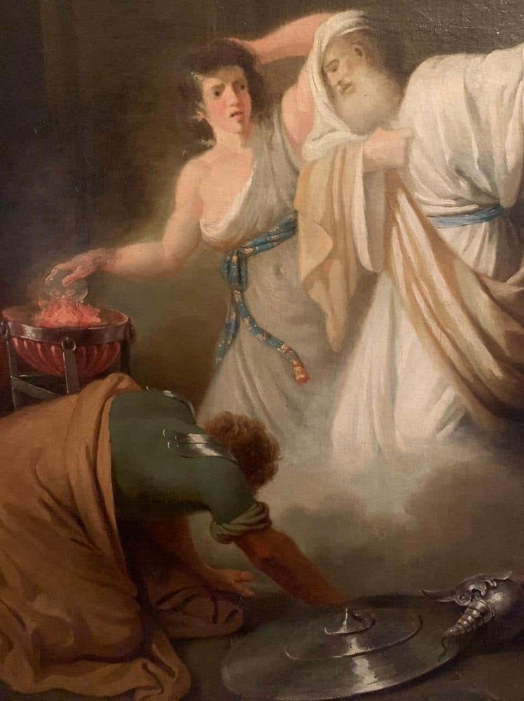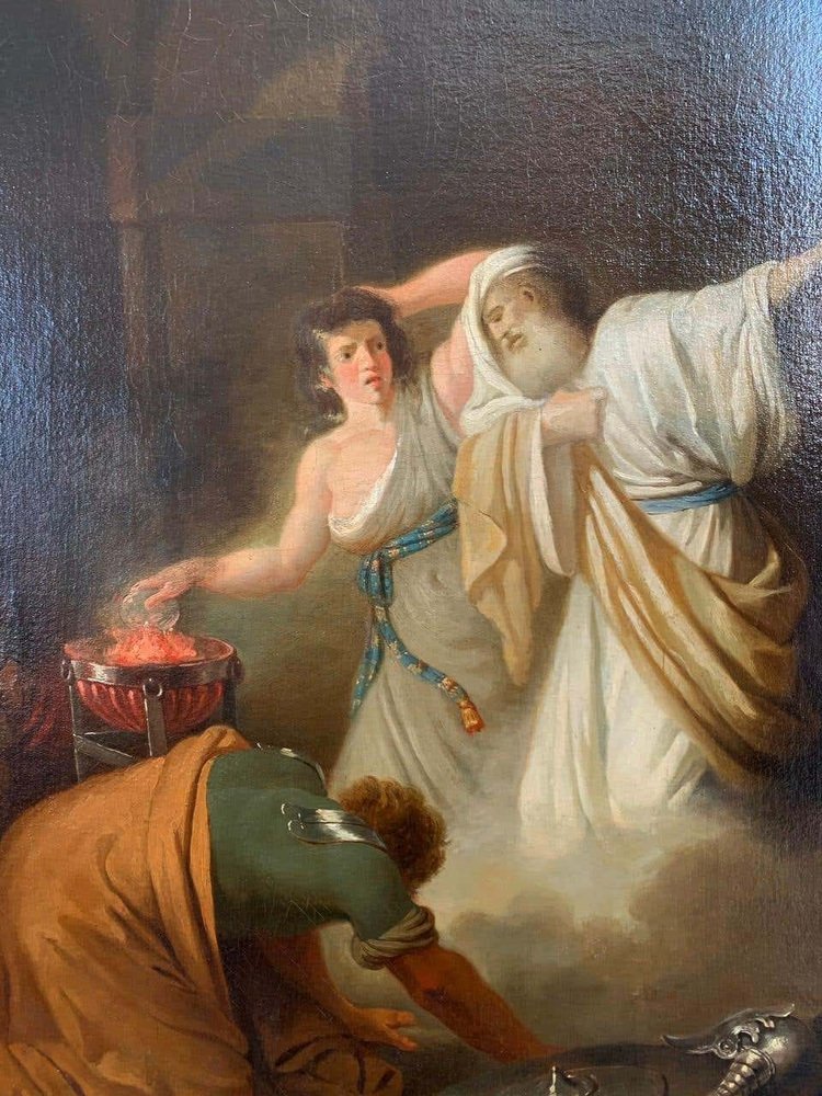 Dieses Öl auf Leinwand stellt eine biblische Szene dar. Die Hexe von Endor ruft den kürzlich verstorbenen Propheten Samuel auf Bitten von Saul, dem König von Israel, an. Saul wollte mit dem Toten Kontakt aufnehmen, um ihm angesichts der Gefahr zu helfen und um etwas über die Prophezeiung zu erfahren. Samuel verkündet wütend den baldigen Sturz des Königs Saul und seines Reiches und stirbt einige Tage später.