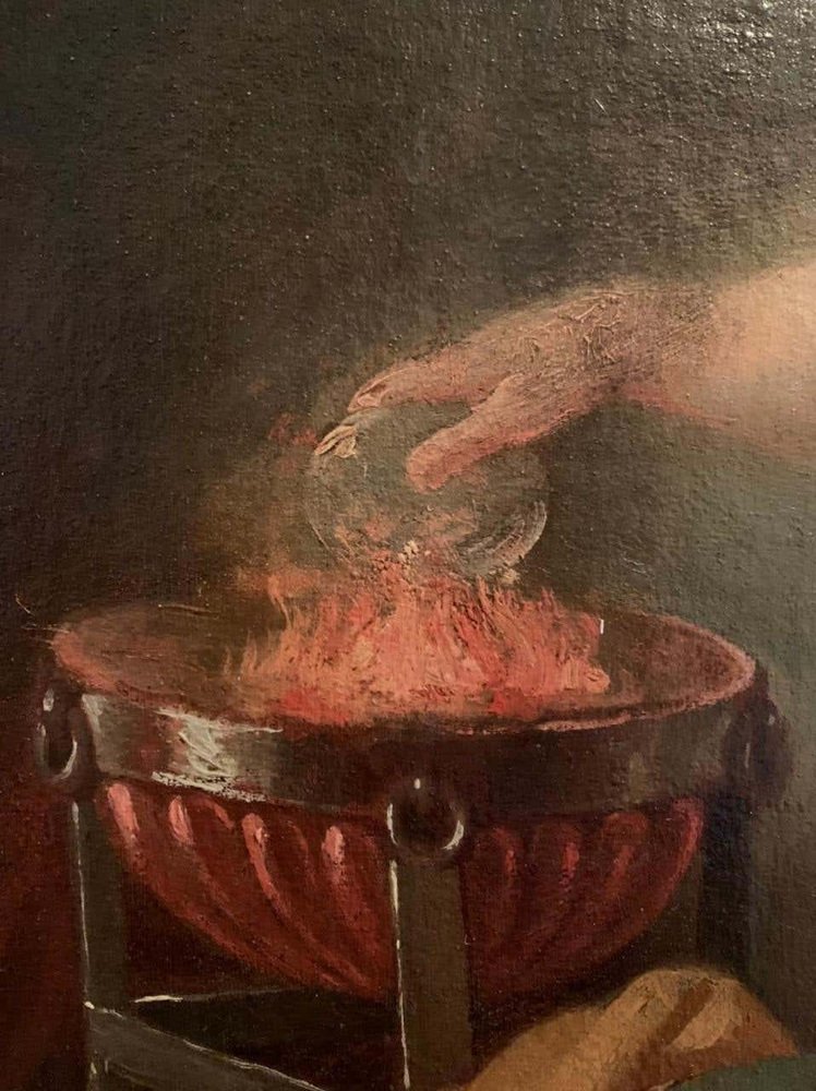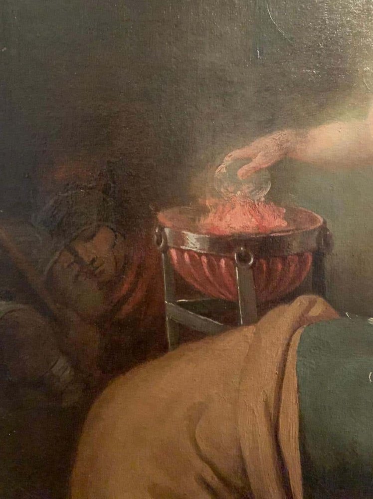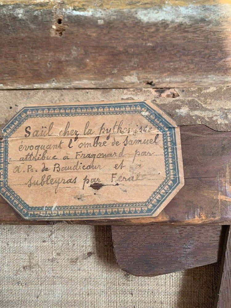 This oil on canvas represents a biblical scene. The witch of Endor calls the recently deceased prophet Samuel at the request of Saul, king of Israel. Saul wanted to contact the dead to help him in the face of danger and to learn about the prophecy. Samuel, furious, announces the imminent fall of King Saul and his kingdom and dies a few days later.
