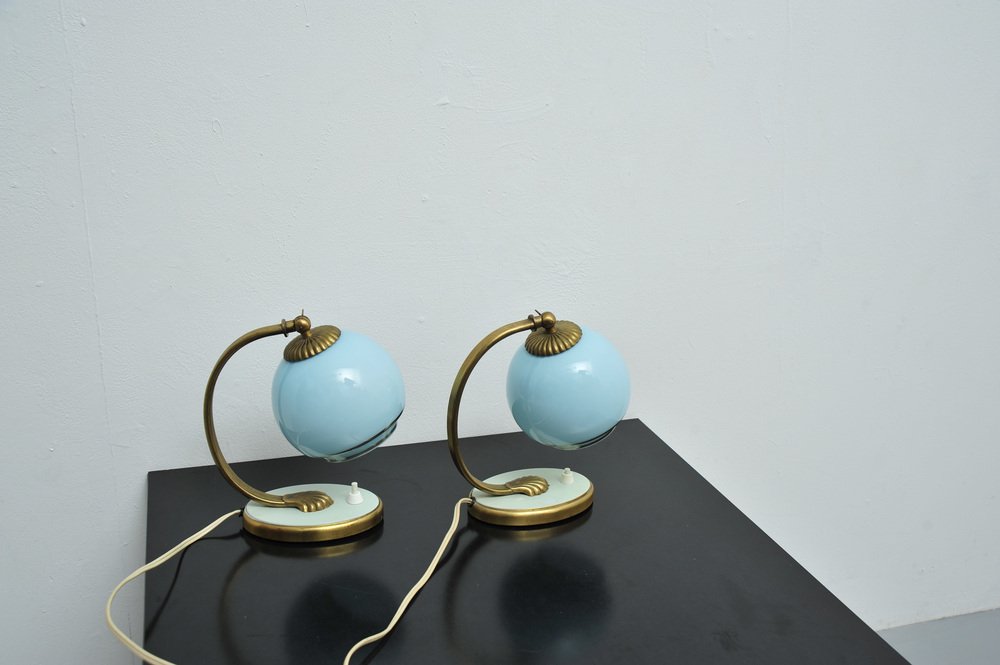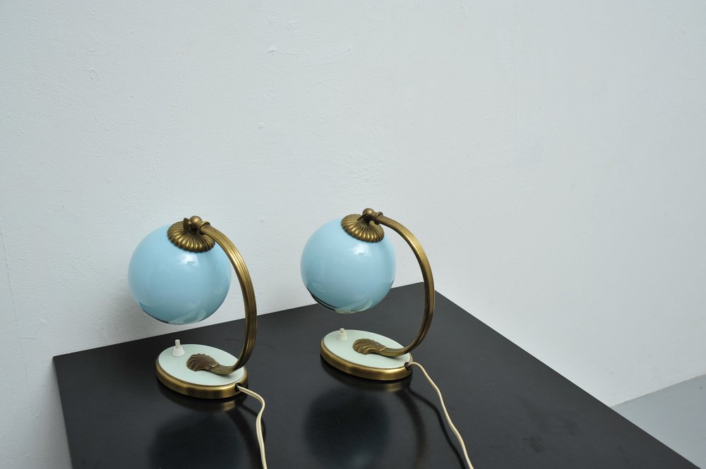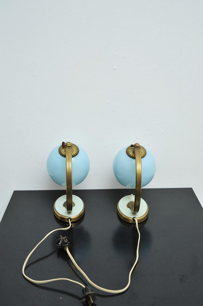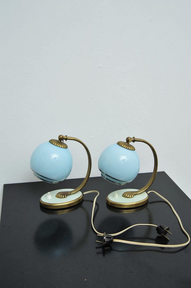 Nachttischlampen mit blauem Glas und Bronzefüßen, 2er Set