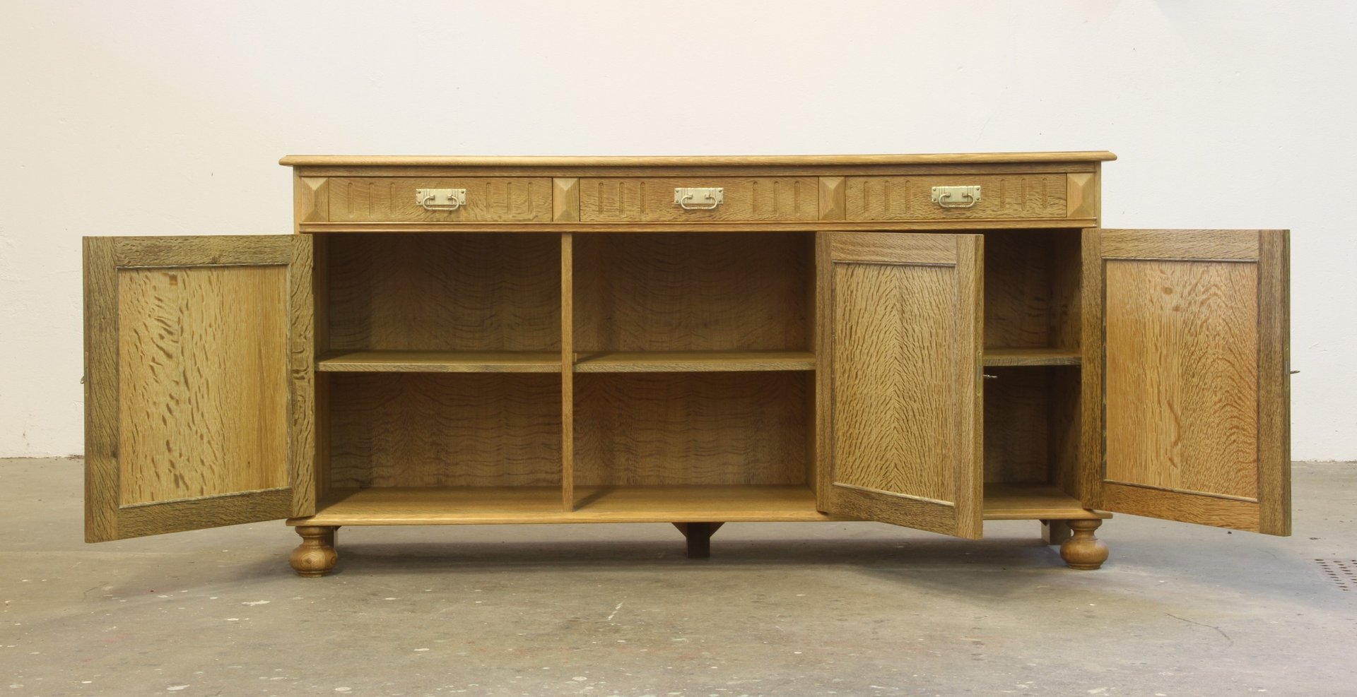 In excellent original condition with a gentle patina, the sideboard shows minor marks on the top where a previous addition once sat. Please refer to the photos for details. Despite its size, the piece maintains an elegant, slim profile, offering ample storage while preserving a sense of calm and warmth.