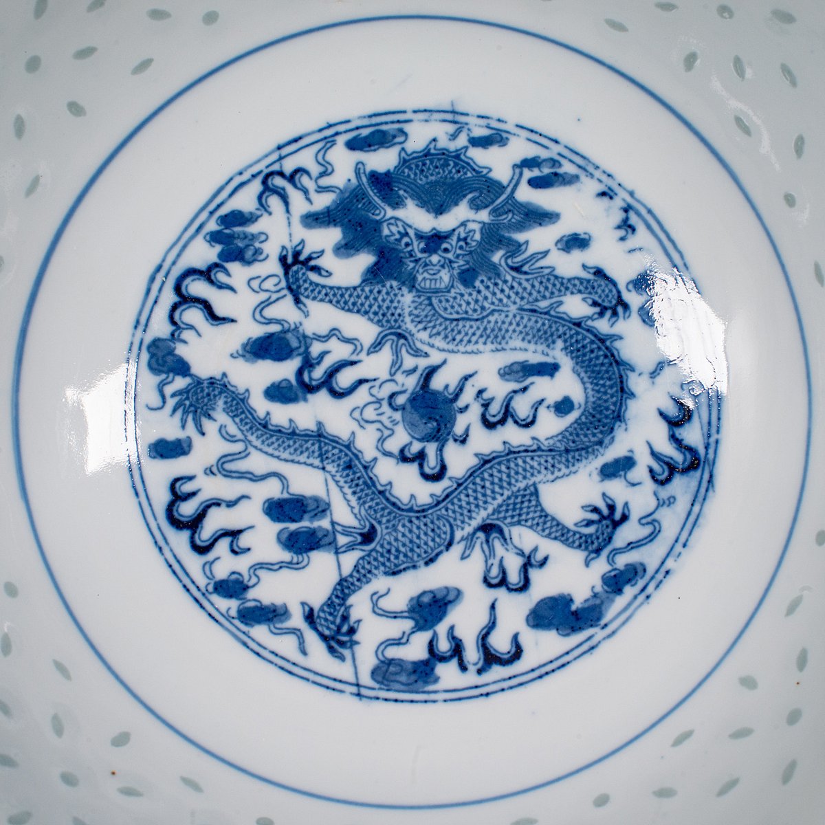 Zentrales Drachenmotiv mit ausdrucksstarken, klassisch orientalischen Details in klassischer blauer und weißer Farbgebung