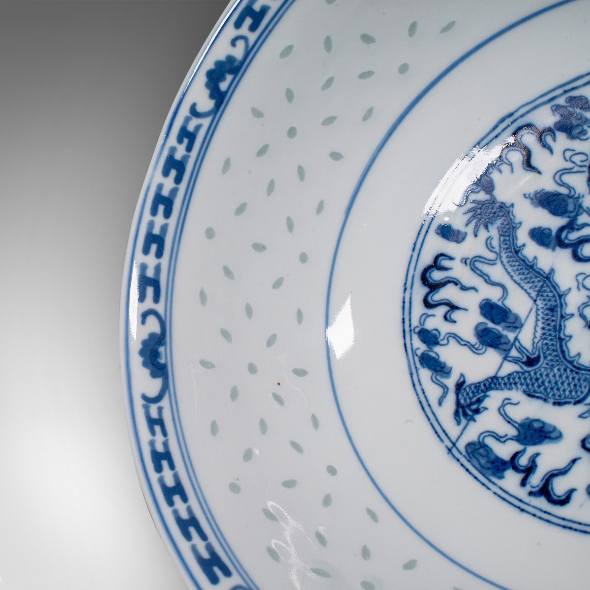 This is a vintage display bowl. An Oriental, ceramic decorative serving dish, dating to the Art Deco period, circa 1930. A charming example of early 20th century craftsmanship, showcasing traditional blue on white artistry and refined translucence.