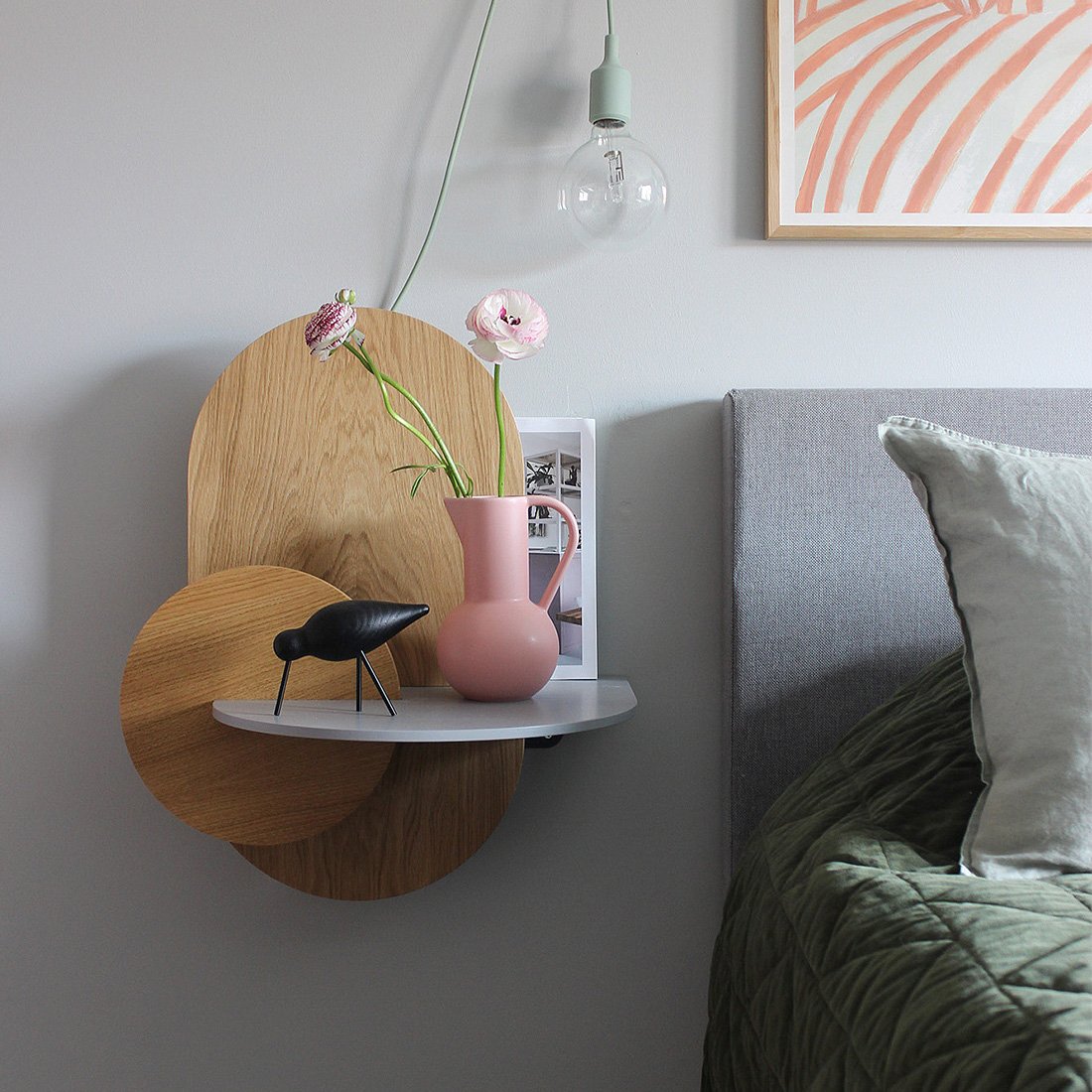 Alba besteht im Wesentlichen aus 3 flachen Sperrholzstücken und einem Metallbügel, der an der Wand befestigt wird. Die Anordnung dieser Stücke im Raum gibt dem Produkt die Möglichkeit, Objekte hinter den vertikalen Stücken zu verstecken, da es eine Trennung zwischen ihnen gibt. In der Nachttischversion (L) haben wir einen Rückraum hinter dem unteren Stück, der es uns ermöglicht, größere Gegenstände wie Bücher, Tablets usw. zu verstecken. Außerdem gibt es ein verstecktes Loch in der Basis, durch das wir das Kabel zum Aufladen unserer Geräte führen können.