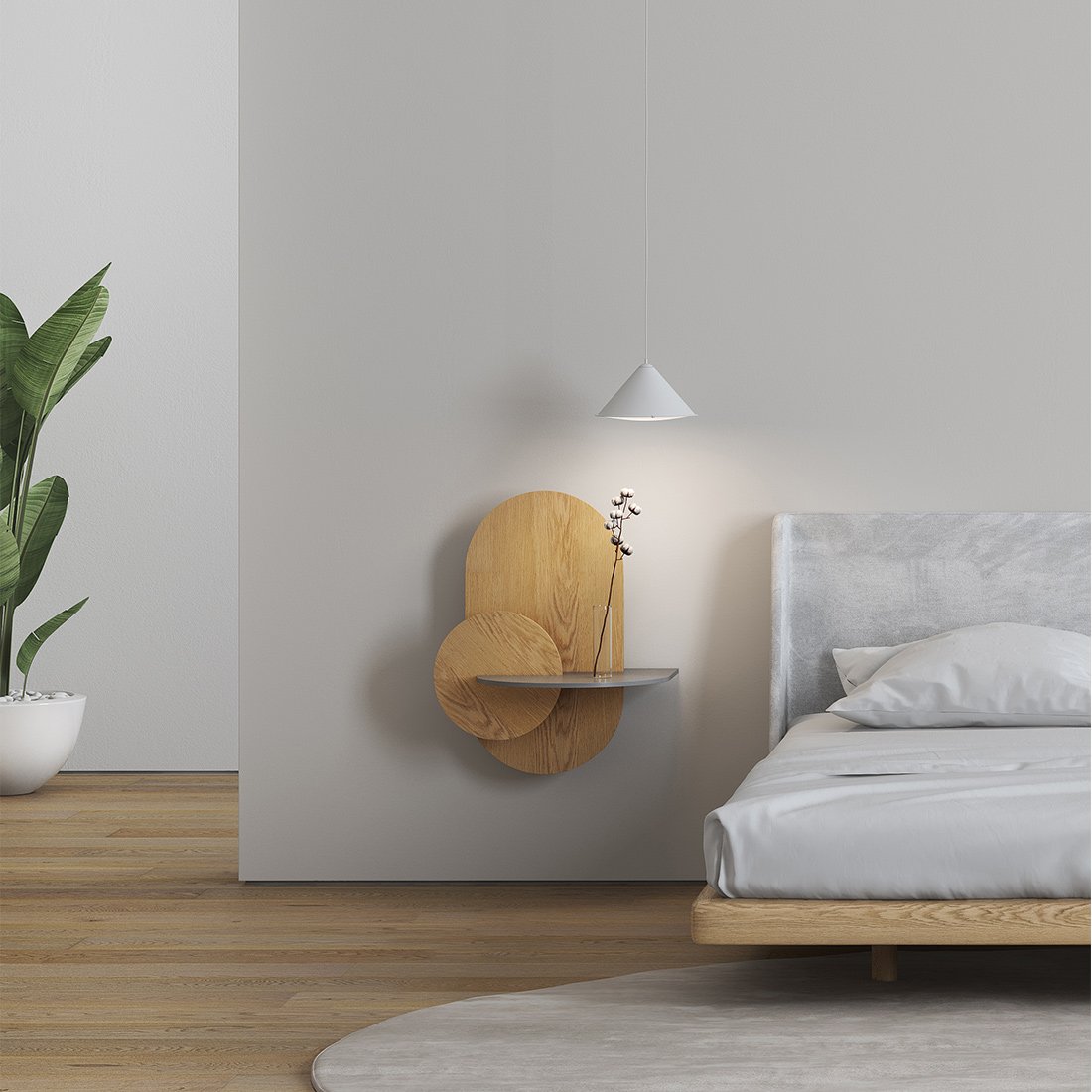 Alba is basically composed of 3 flat pieces of Plywood and a metal bracket that is fixed on the wall. The arrangement of these pieces in the space gives the product the ability to hide objects behind the vertical pieces since there is a separation between them. In the night table version (L), we have a backspace, behind the bottom piece, which allows us to hide larger objects such as books, tablets, etc. Also, there is a hidden hole in the base that allows us to feed the cable to charge our devices.