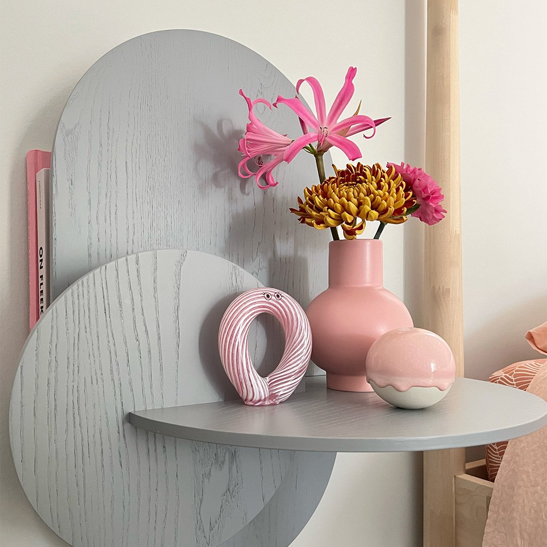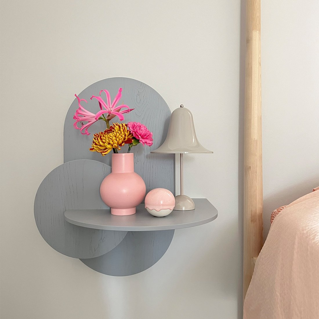 Alba is a versatile product that can be used as a wall shelf with hidden storage and as a bedside table with concealed storage. Alba means “sunrise” in Spanish, hence its name, since the two front pieces of the product simulate the sun and the moon reflecting in the water when a new day dawns.