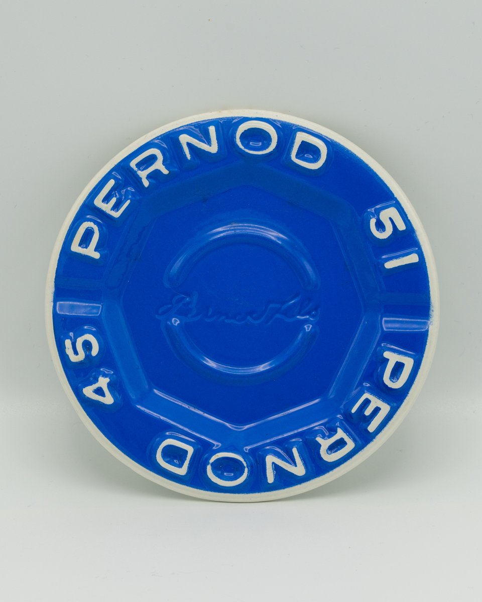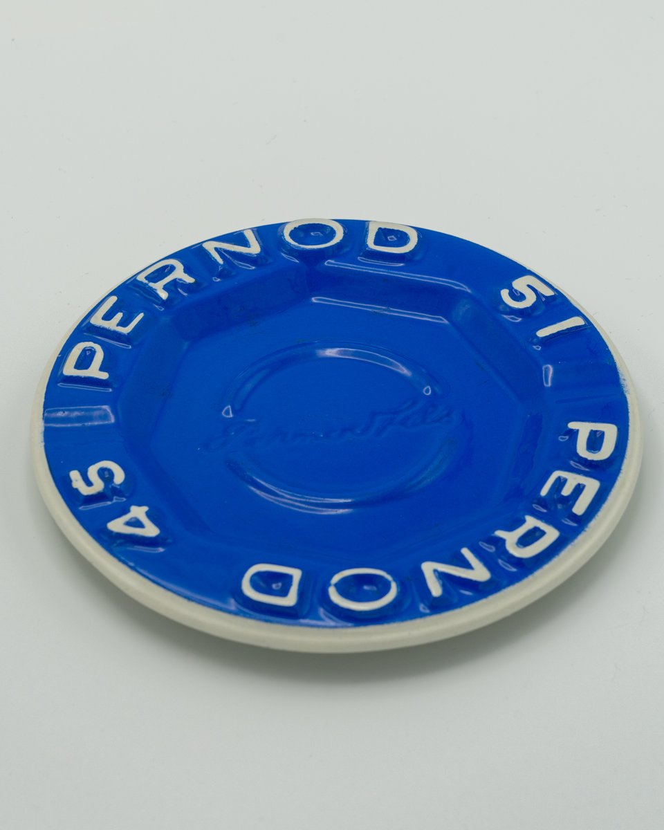 Crafted from earthenware by Moulin des Loups for Pernod, a well-regarded French ceramics manufacturer, this ashtray exemplifies their high-quality craftsmanship. Measuring 15 cm in width, it is compact yet substantial, perfect for practical use or as a decorative conversation piece. The vivid cobalt blue, combined with the raised lettering, evokes the charm and nostalgia of mid-20th century French café culture, where Pernod was a ubiquitous presence.
