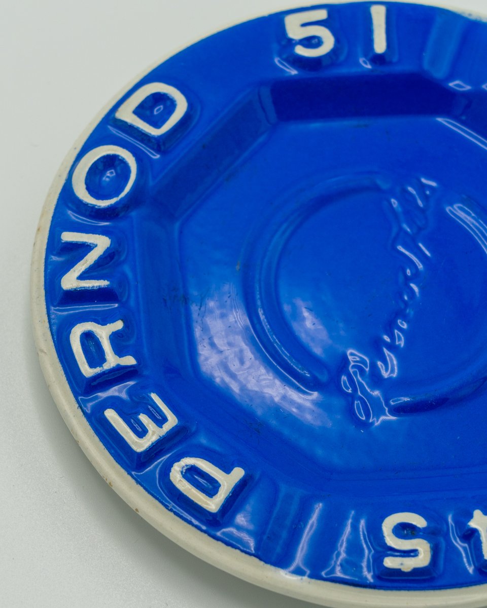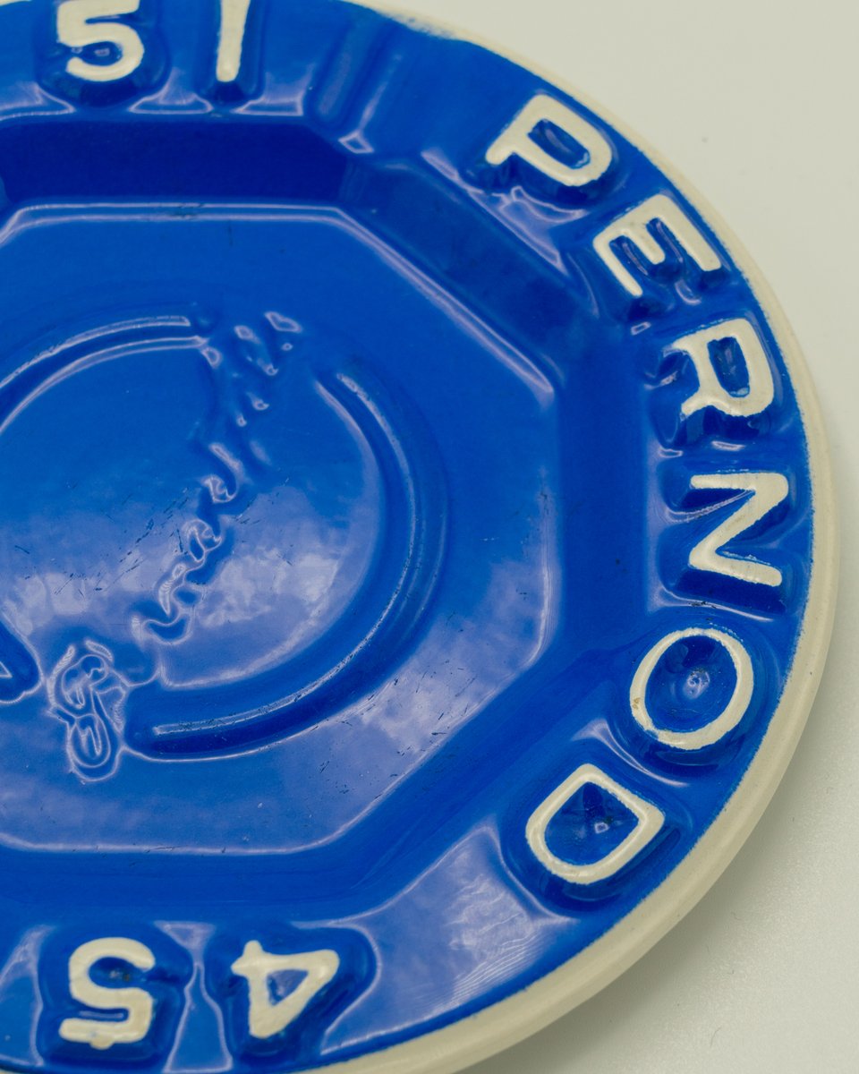 Dieser Aschenbecher wurde von Moulin des Loups für Pernod, einen renommierten französischen Keramikhersteller, aus Steingut hergestellt und ist ein Beispiel für dessen hochwertige Handwerkskunst. Mit einer Breite von 15 cm ist er kompakt, aber dennoch solide und eignet sich perfekt für den praktischen Gebrauch oder als dekorativer Blickfang. Das leuchtende Kobaltblau in Kombination mit dem erhabenen Schriftzug erinnert an den Charme und die Nostalgie der französischen Café-Kultur Mitte des 20. Jahrhunderts, in der Pernod allgegenwärtig war.
