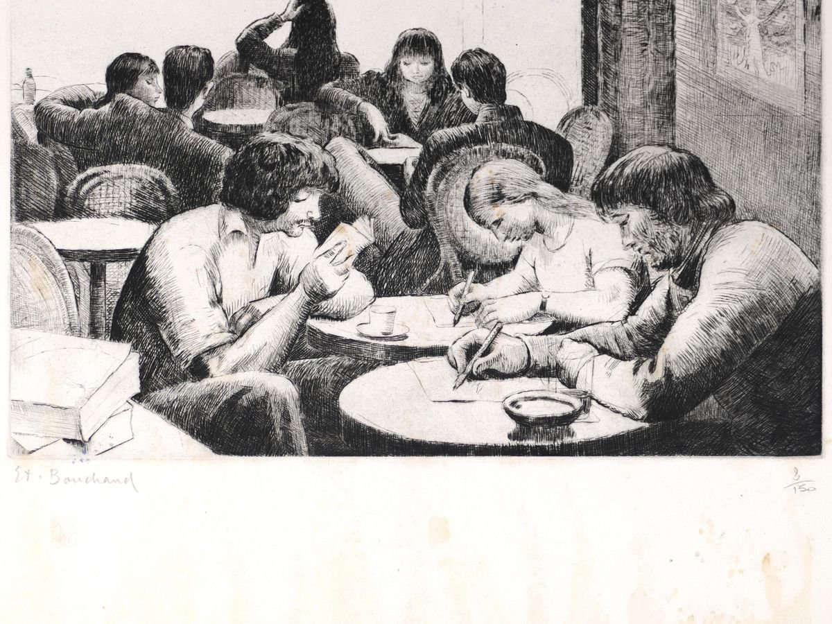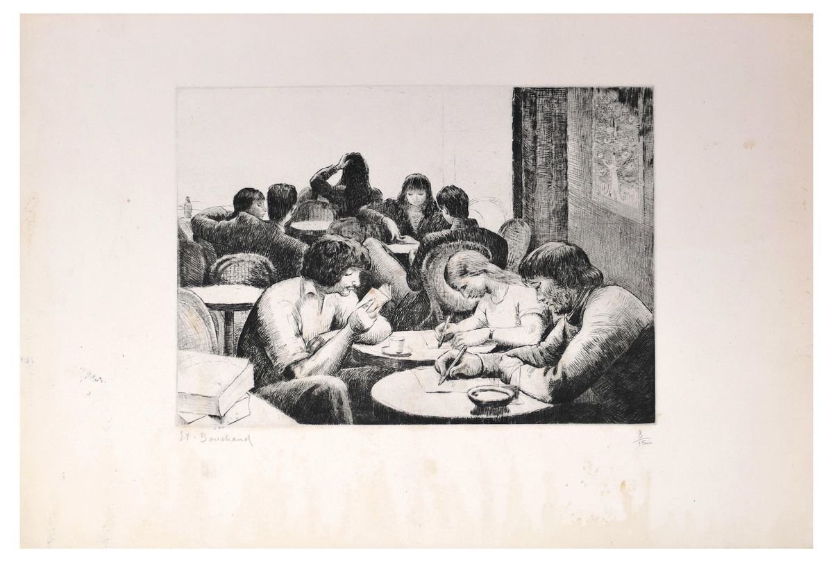 Personnes Attablées au Café - Radierung und Kaltnadel von E. Bouchaud Mid 20th Century