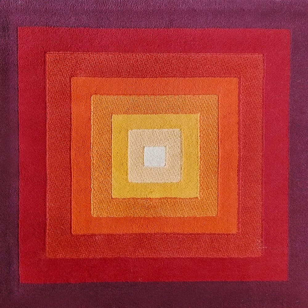 Optik und Stil Er besteht aus sechs großen, quadratischen Modulen, die in zwei Dreierreihen angeordnet sind. Innerhalb jedes Moduls erzeugt eine Reihe konzentrischer Quadrate in warmen, leuchtenden Farben – von tiefem Purpur und Pflaume an den Rändern bis hin zu leuchtendem Orange und einem blassen, fast weiß-gelben Farbton in der Mitte – eine starke optische Täuschung von Tiefe und zurückweichendem Raum.
