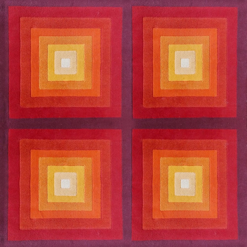 Das Design ist im Handel als „Quadrat” oder eine ähnliche Variante innerhalb seiner Kollektion bekannt. Panton wollte mit Farbe und Form immersive Umgebungen schaffen, und dieser Teppich ist ein perfektes, reichhaltiges Beispiel für diese Philosophie.