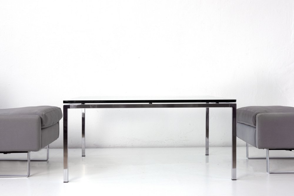 Beistelltisch mit Glasplatte Designer: Fabrikdesign Jahr: um 1968 Hersteller: unbekannt Land: Deutschland Maße: H 47,5 cm, B 100 cm, T 100 cm, Glas 18 mm Material: Glas, Edelstahl poliert Zustand: guter Zustand Besondere Bemerkungen: Ecken leicht bestoßen. Transparent, leicht und doch präsent durch die erlesenen Materialien, so präsentiert sich der quadratische Couchtisch. Gekauft wurde er bei der COR Conseta Gruppe im Markenfachhandel in Berlin. Die COR Sitzmöbel sind hier zu finden.