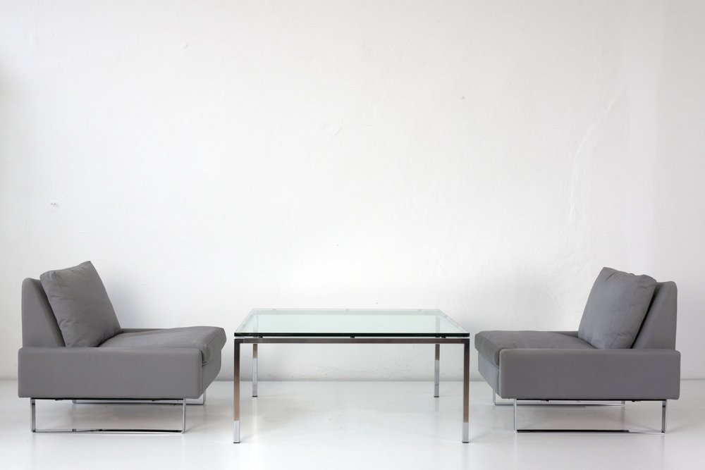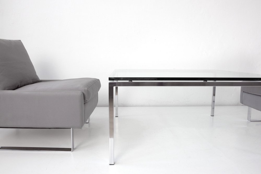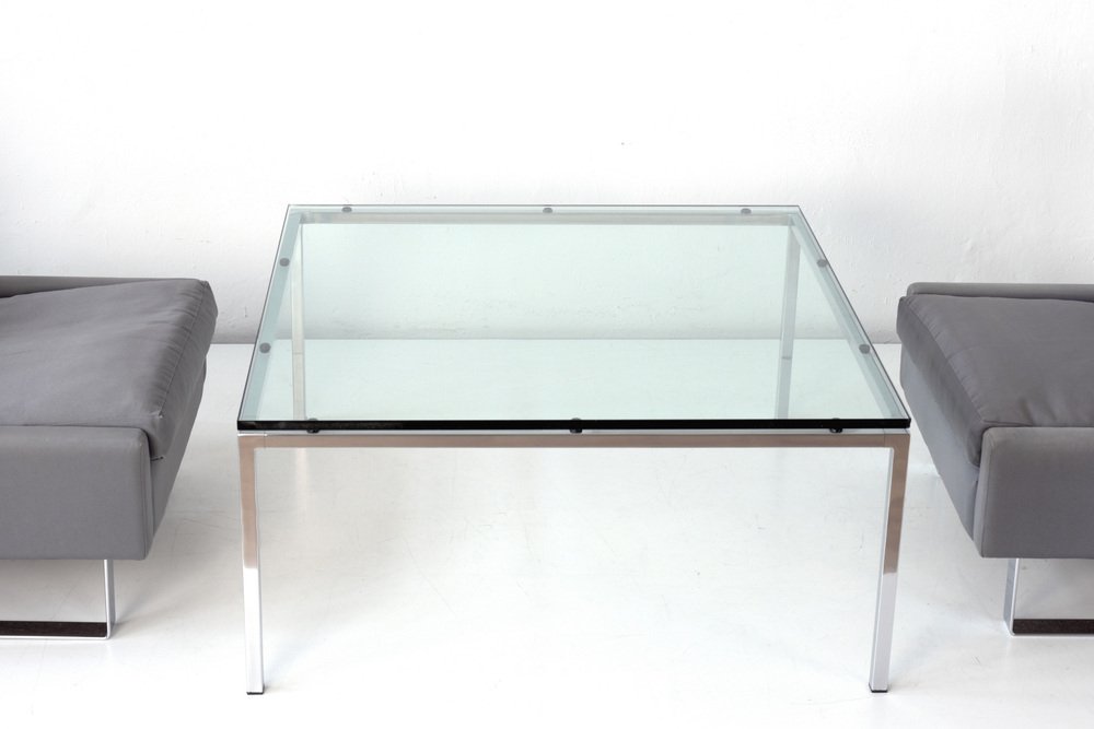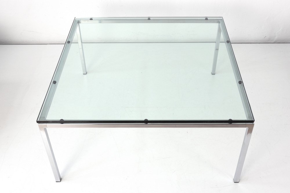 Side Table with Glass Plate Designer: Factory design Year: around 1968 Manufacturer: unknown Country: Germany Measurements: H 47,5 cm, W 100 cm, D 100 cm, Glass 18 mm Material: Glas, stainless steel polished Condition: good condition Special Remarks: Corners slightly bumped. Transparent, light and yet present through the exquisite materials, this is how the square coffee table presents itself. He was bought with the COR Conseta group in the brand specialized trade in Berlin. The COR seating furniture can be found here.