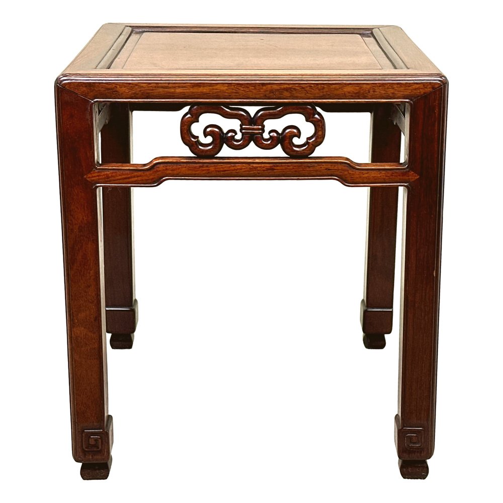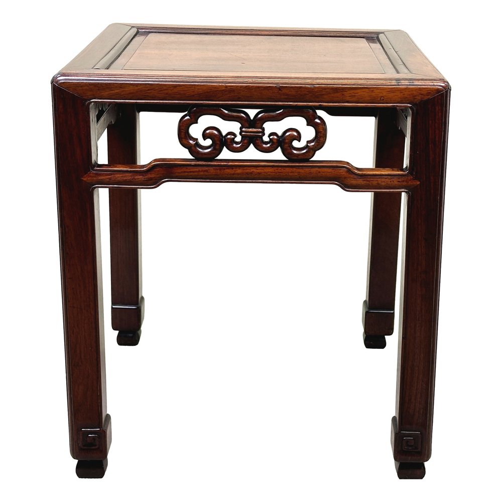 Eine sehr attraktive späten 19. Jahrhundert, orientalischen Hartholz, Chinesisch Export, quadratische Couchtisch, oder Topf Stand, mit getäfelten hölzernen Top über elegante Fries mit durchbohrt und geschnitzt Dekoration, auf quadratischen Beinen und geformten Füßen erhöht.