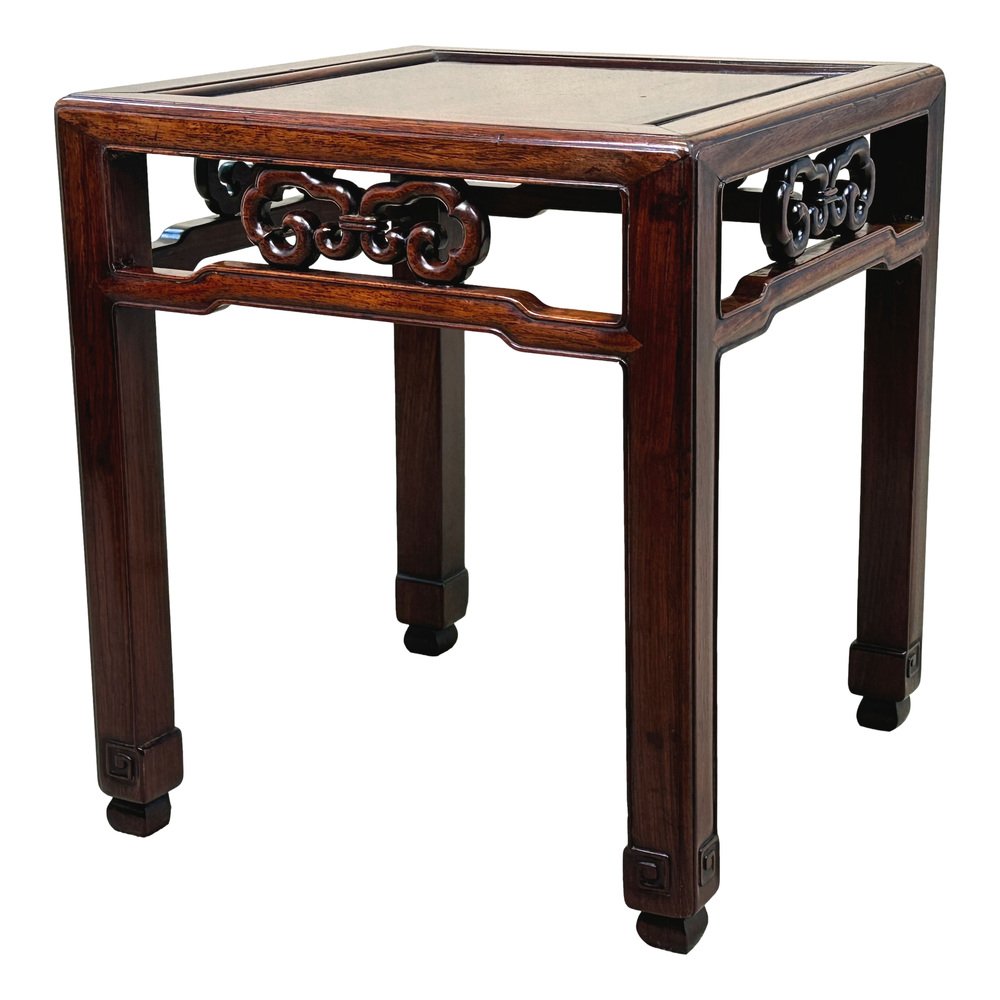 A Very Attractive Late 19th Century, Oriental Hardwood, Chinese Export, Square Coffee Table, Or Pot Stand, Having Panelled Wooden Top Over Elegant Frieze with Pierced & Carved Decoration, Raised On Square Legs And Shaped Feet.