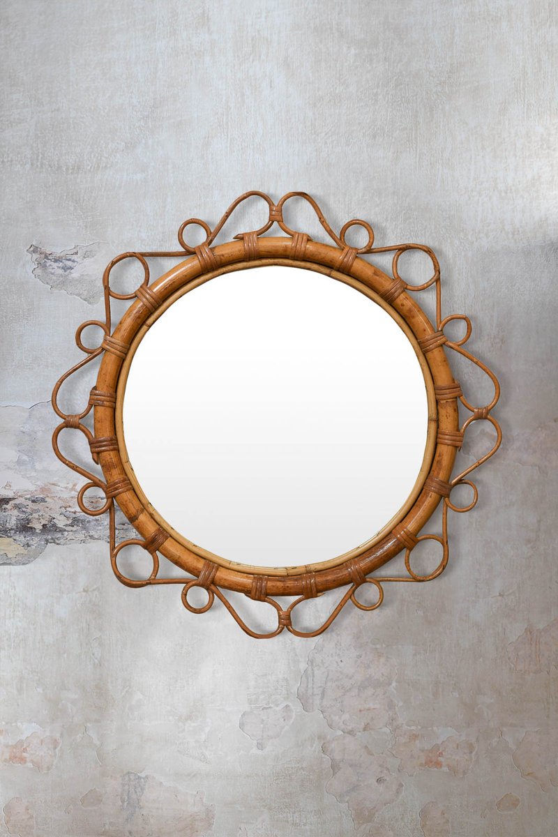 Runder Mid-Century Rattan Spiegel mit handgewebten dünnen Mustern, 1950er