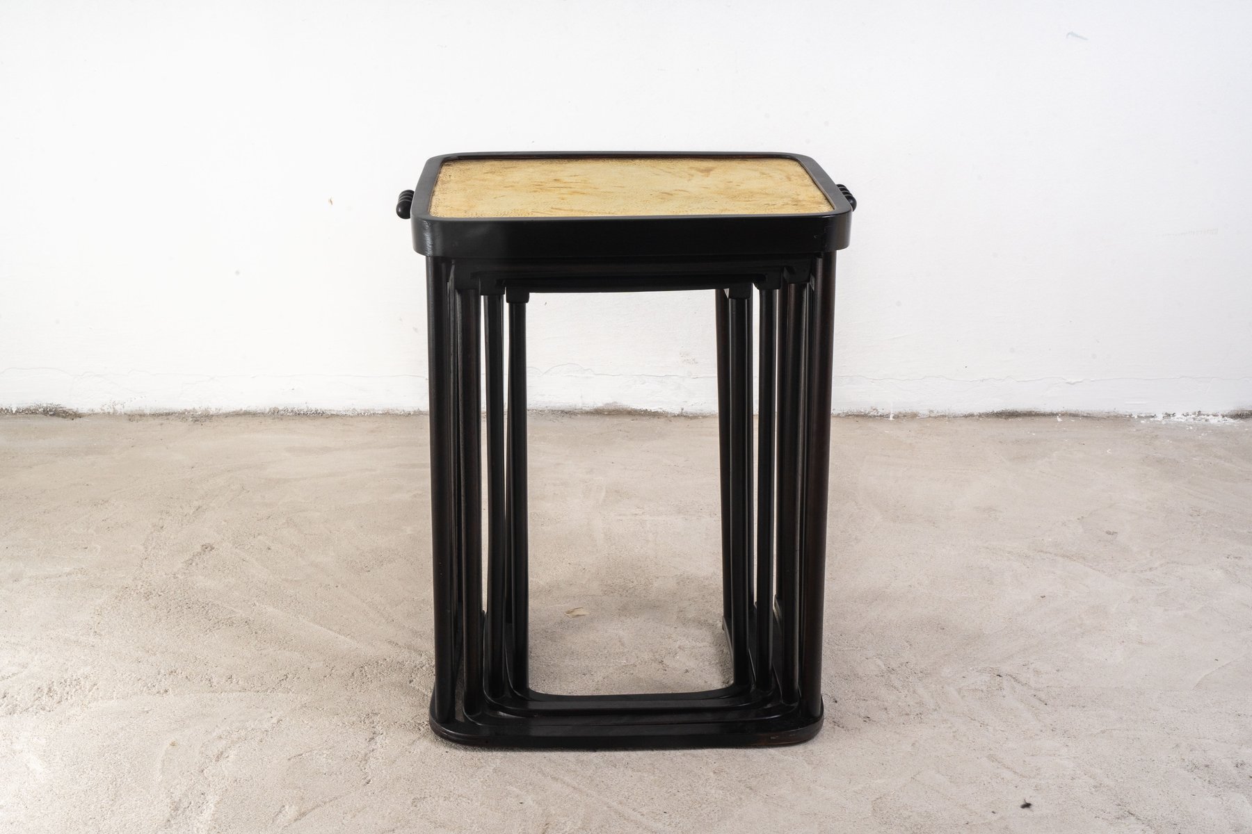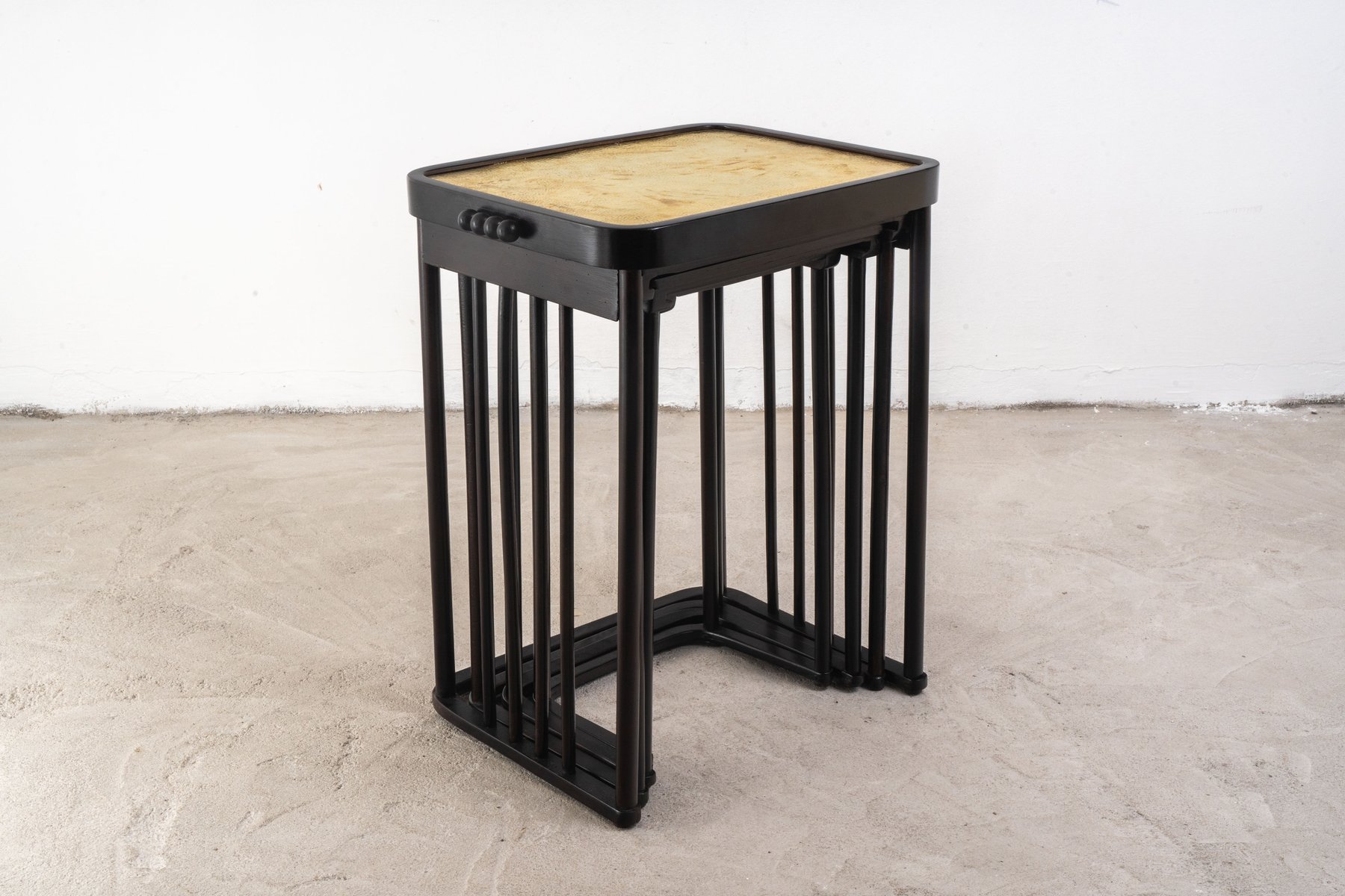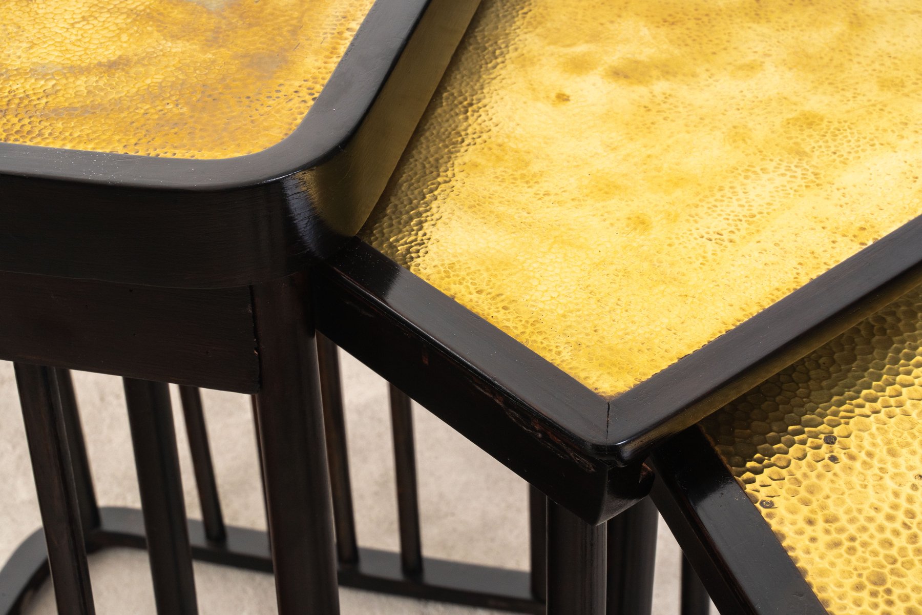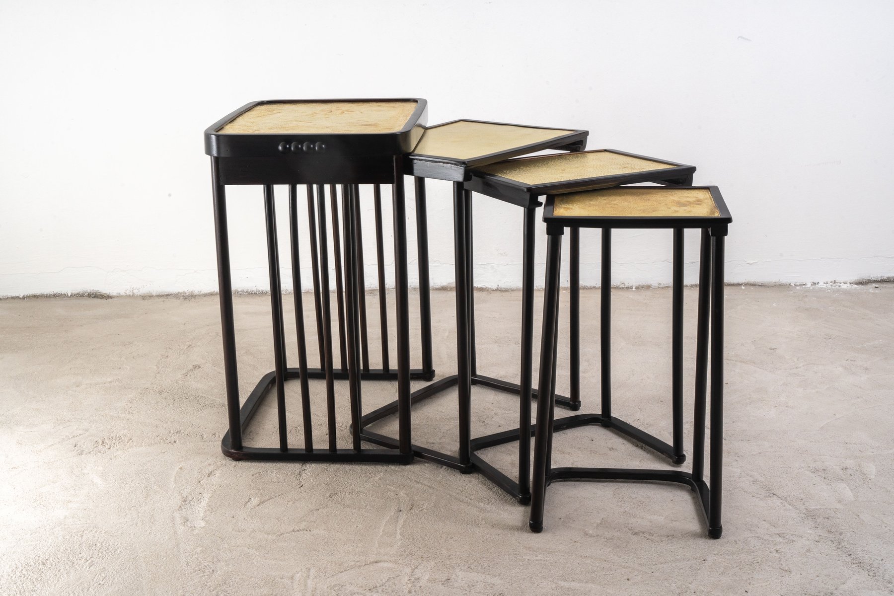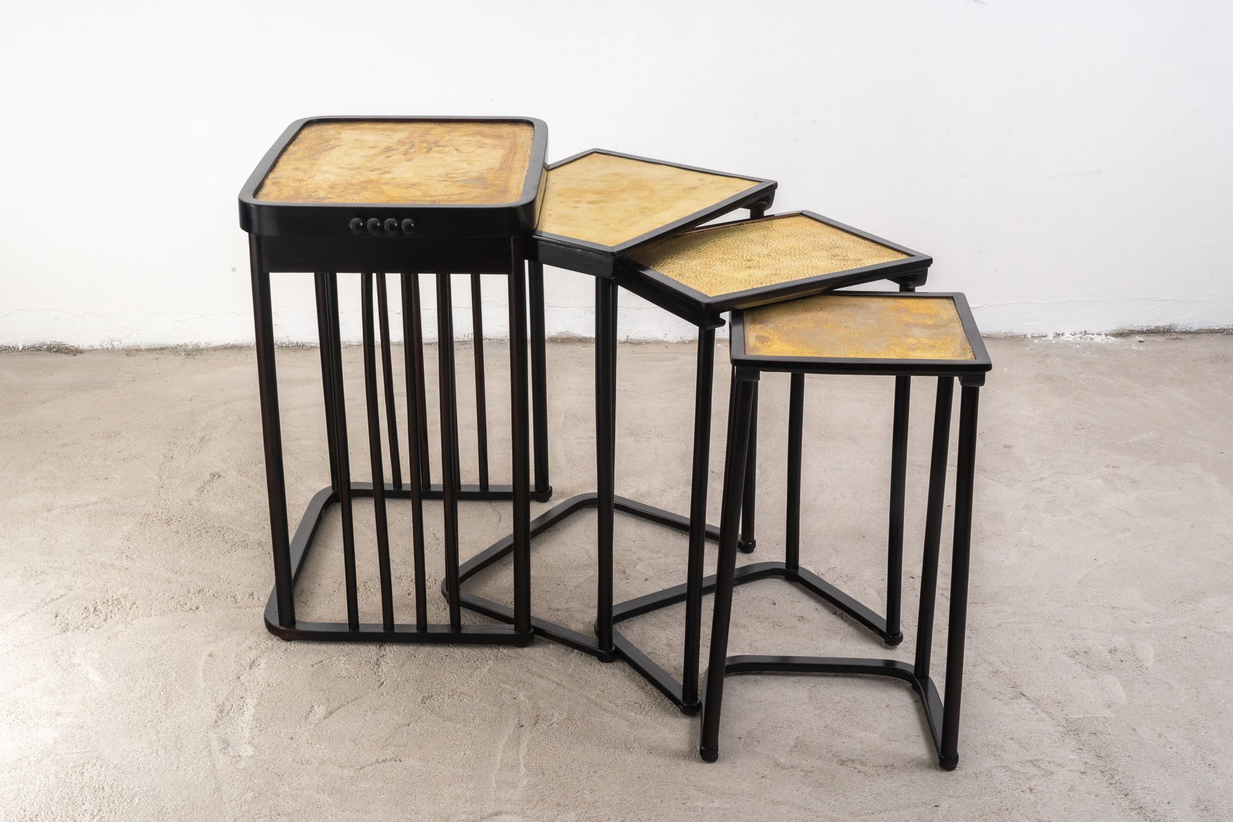 This exquisite set of nesting tables, designed by the renowned Josef Hoffmann and produced by Jacob & Josef Kohn in Vienna around 1905/06, is a testament to the Art Nouveau movement. Crafted from beech wood and featuring inlaid hammered brass tops, these tables are particularly rare with brass tops on all pieces. The smallest table bears a paper label marked "JACOB & JOSEF KOHN," affirming its authenticity. In excellent condition, these tables show minimal signs of wear. Referenced in several significant works, including the J. & J. Kohn factory catalogues of 1906 and 1916, G. Renzi's "Il mobile moderno, Gebrüder Thonet Wien, Jacob & Josef Kohn" (Milan 2008), "Gebogenes Holz. Konstruktive Entwürfe Wien 1840–1910" (Vienna 1979), and D. Baroni and A. d’Auria's "Josef Hoffmann e la Wiener Werkstätte" (Milan 1981), these tables stand as a noteworthy example of Jugendstil design. with dimensions of 75 cm in height, 62 cm in width, and 45 cm in depth, they represent a rare and valuable find for collectors and connoisseurs of early 20th-century furniture.
