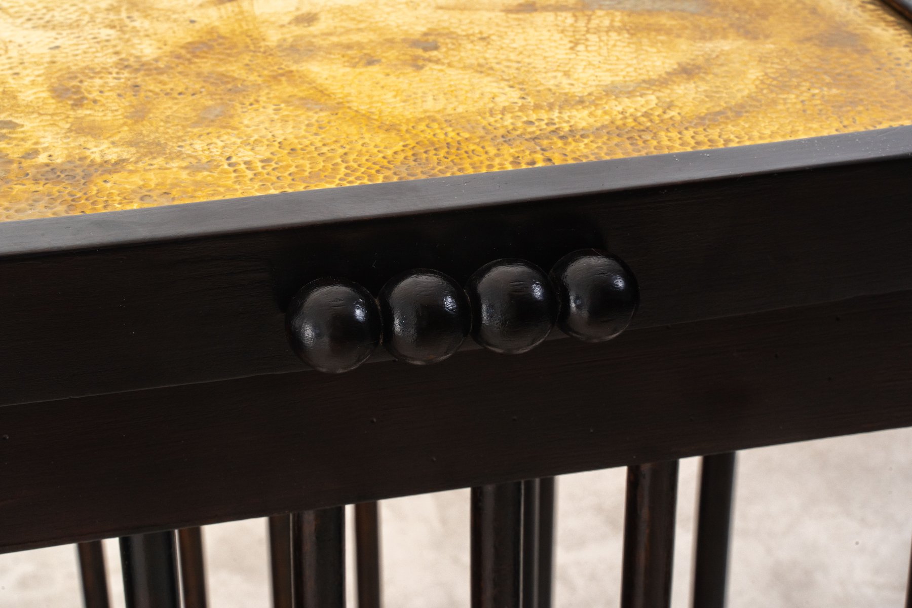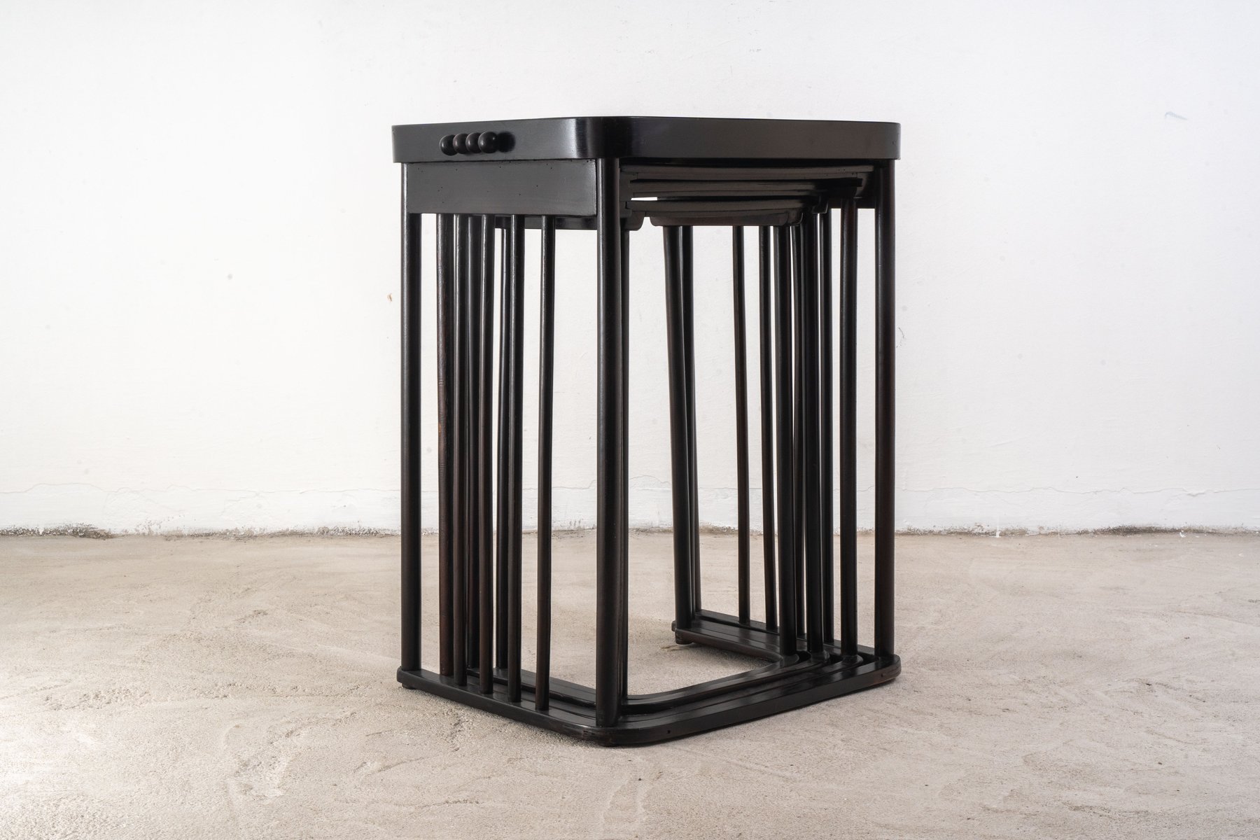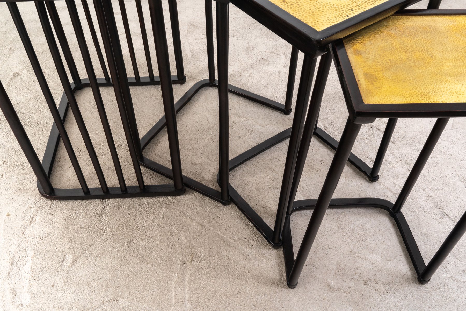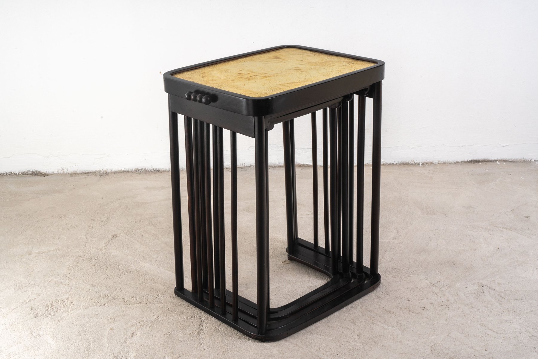 This exquisite set of nesting tables, designed by the renowned Josef Hoffmann and produced by Jacob & Josef Kohn in Vienna around 1905/06, is a testament to the Art Nouveau movement. Crafted from beech wood and featuring inlaid hammered brass tops, these tables are particularly rare with brass tops on all pieces. The smallest table bears a paper label marked "JACOB & JOSEF KOHN," affirming its authenticity. In excellent condition, these tables show minimal signs of wear. Referenced in several significant works, including the J. & J. Kohn factory catalogues of 1906 and 1916, G. Renzi's "Il mobile moderno, Gebrüder Thonet Wien, Jacob & Josef Kohn" (Milan 2008), "Gebogenes Holz. Konstruktive Entwürfe Wien 1840–1910" (Vienna 1979), and D. Baroni and A. d’Auria's "Josef Hoffmann e la Wiener Werkstätte" (Milan 1981), these tables stand as a noteworthy example of Jugendstil design. with dimensions of 75 cm in height, 62 cm in width, and 45 cm in depth, they represent a rare and valuable find for collectors and connoisseurs of early 20th-century furniture.