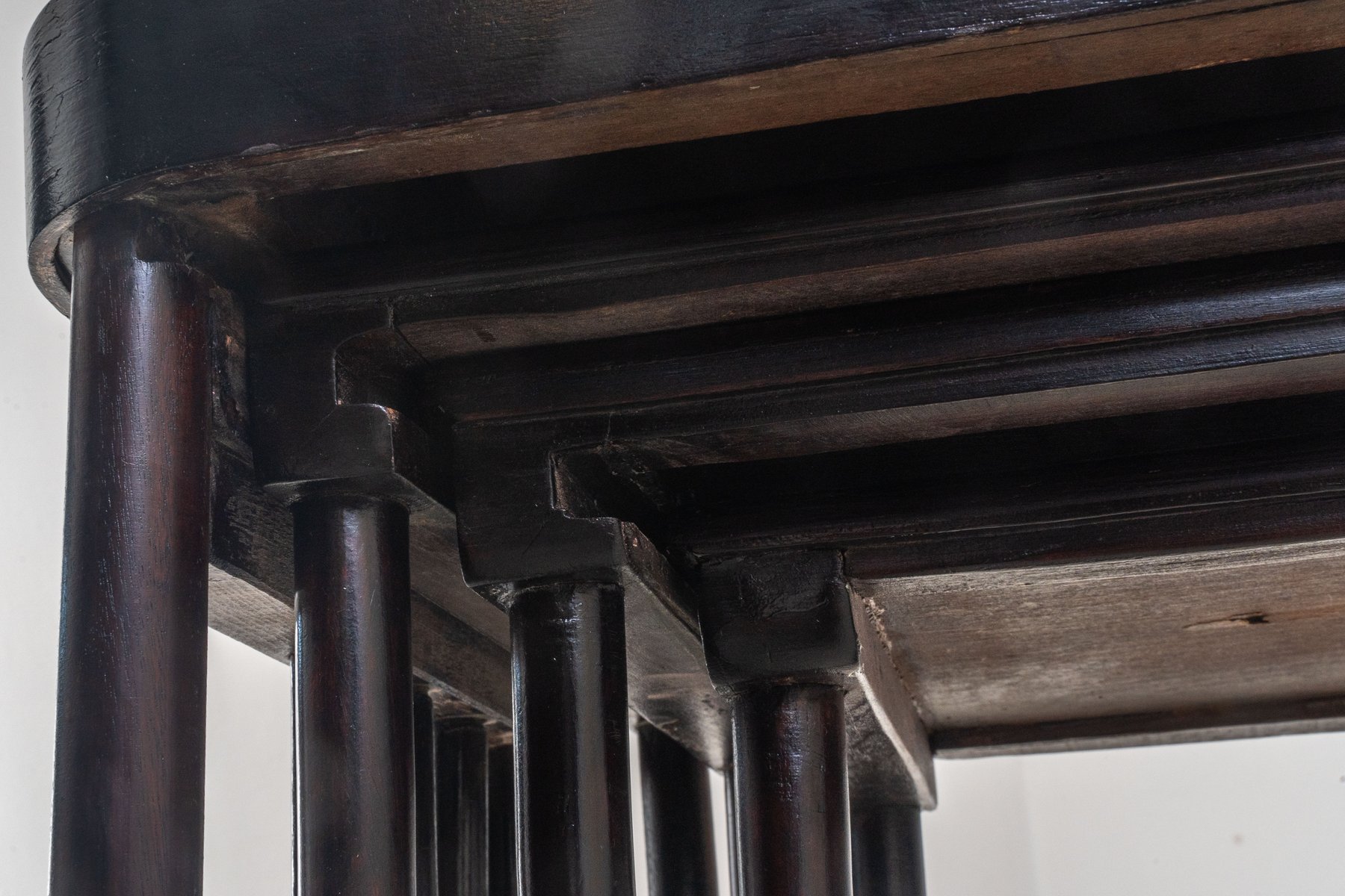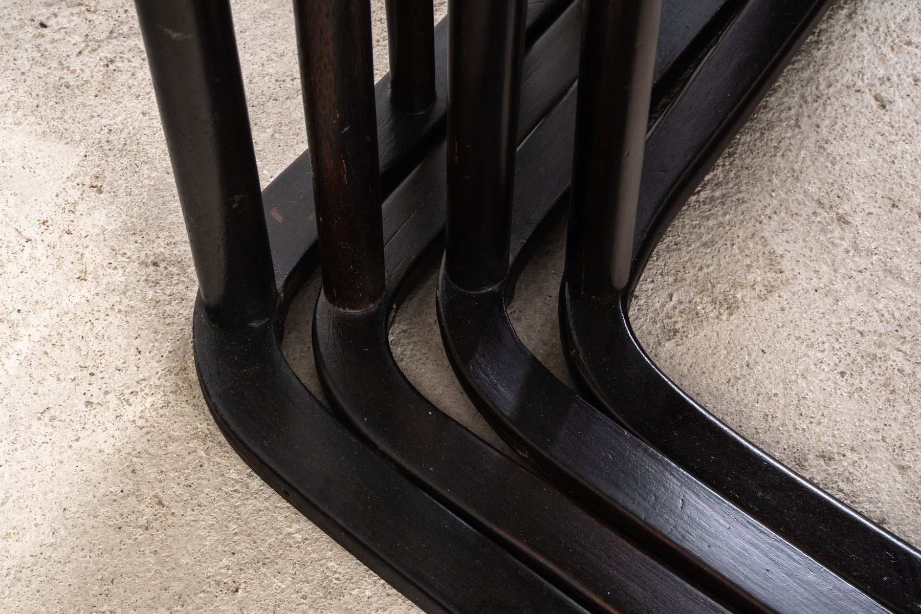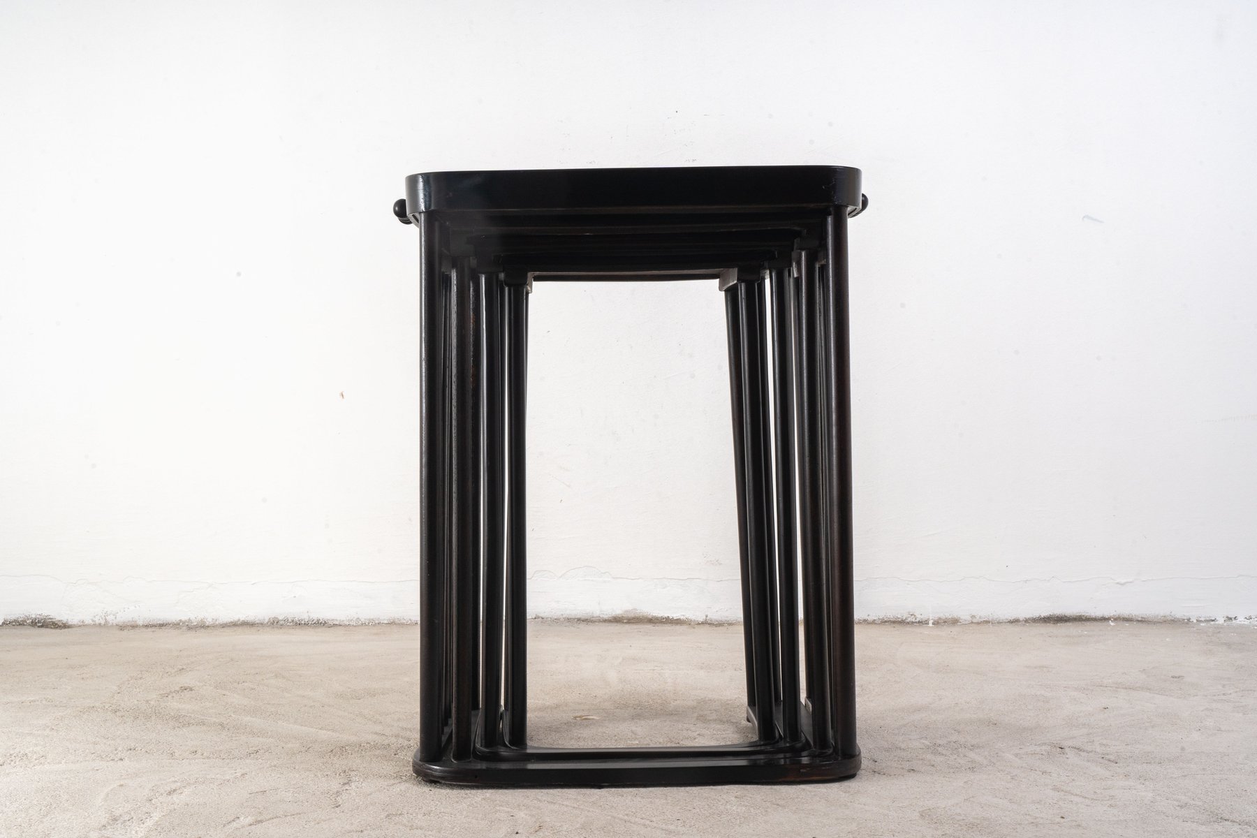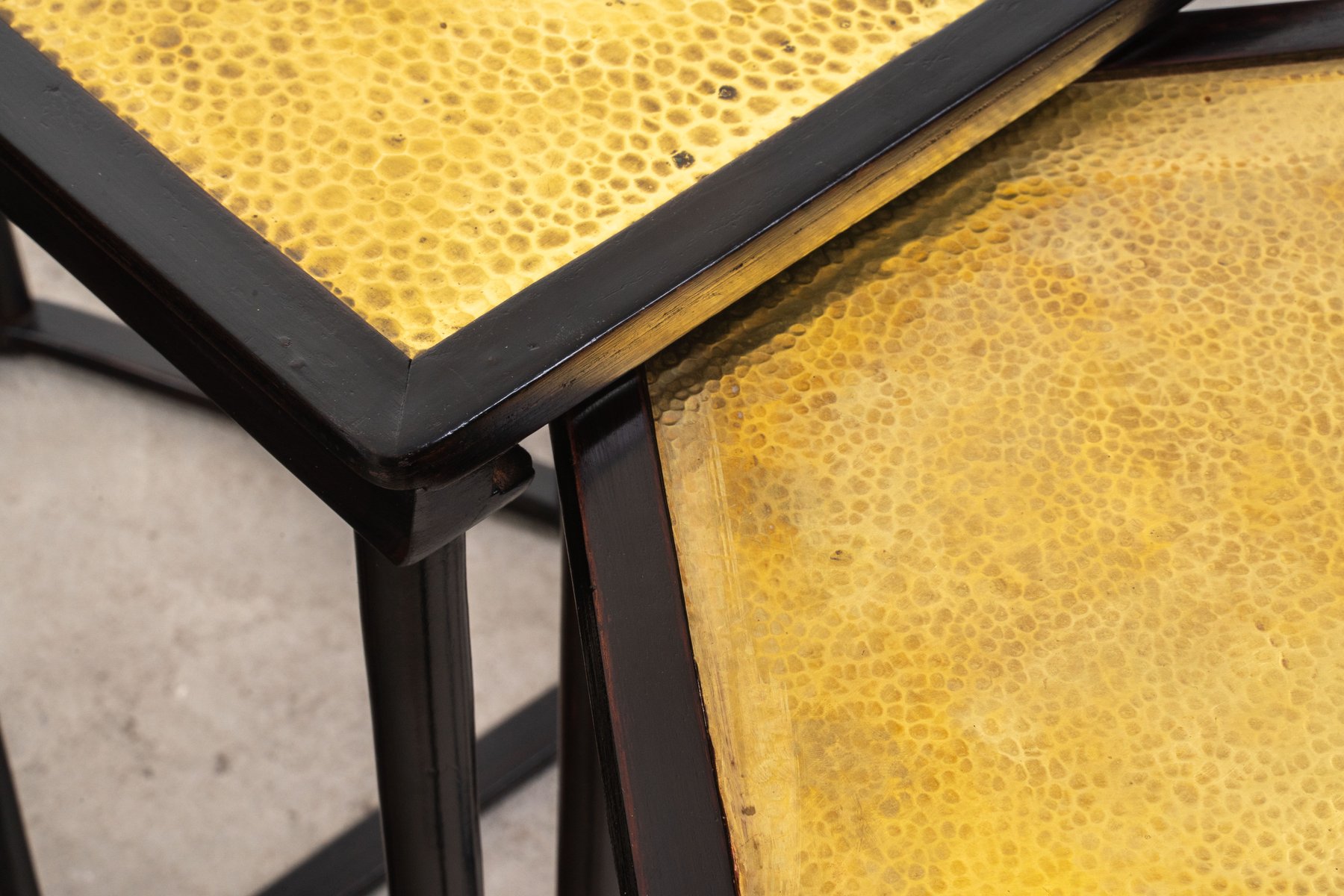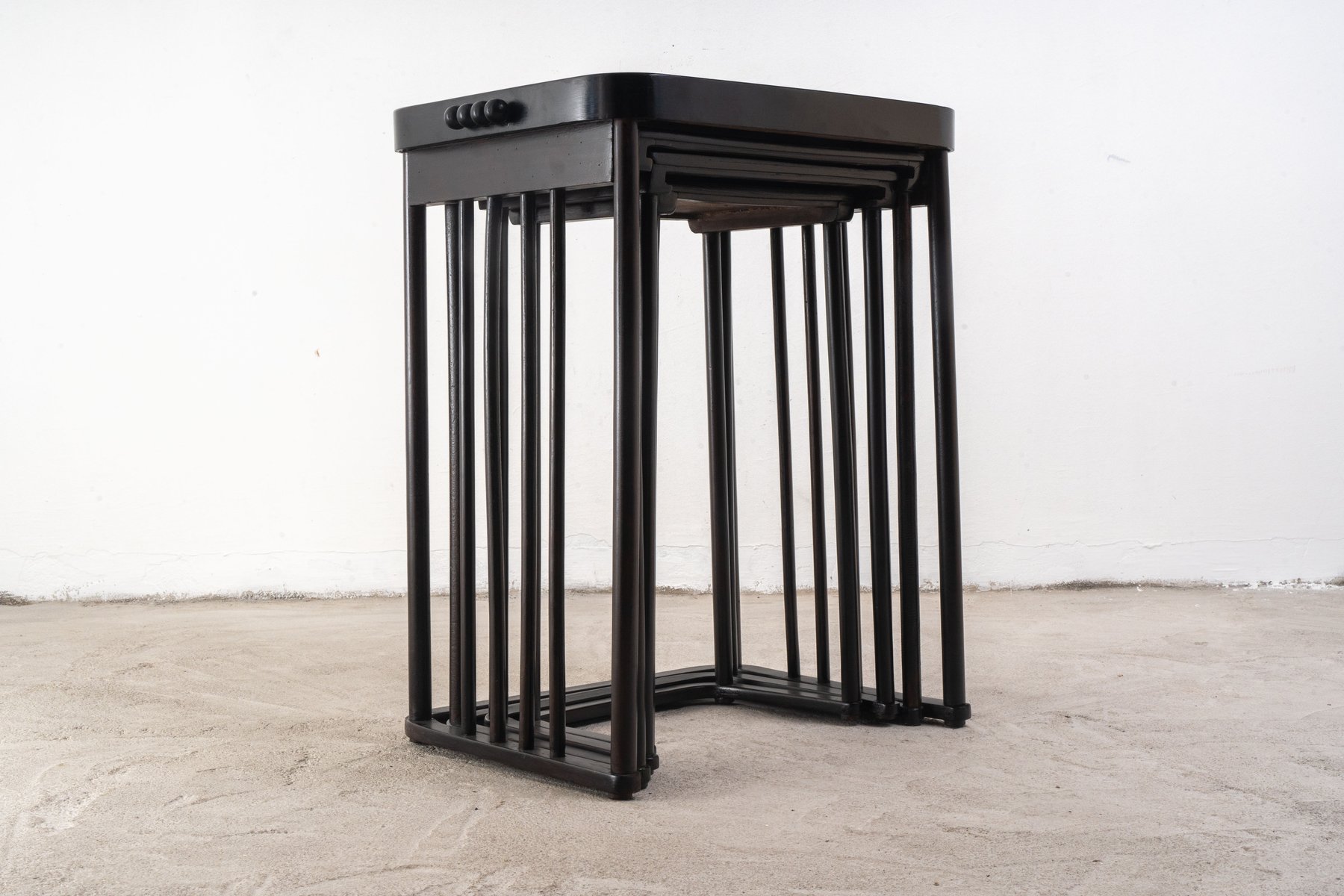 This exquisite set of nesting tables, designed by the renowned Josef Hoffmann and produced by Jacob & Josef Kohn in Vienna around 1905/06, is a testament to the Art Nouveau movement. Crafted from beech wood and featuring inlaid hammered brass tops, these tables are particularly rare with brass tops on all pieces. The smallest table bears a paper label marked "JACOB & JOSEF KOHN," affirming its authenticity. In excellent condition, these tables show minimal signs of wear. Referenced in several significant works, including the J. & J. Kohn factory catalogues of 1906 and 1916, G. Renzi's "Il mobile moderno, Gebrüder Thonet Wien, Jacob & Josef Kohn" (Milan 2008), "Gebogenes Holz. Konstruktive Entwürfe Wien 1840–1910" (Vienna 1979), and D. Baroni and A. d’Auria's "Josef Hoffmann e la Wiener Werkstätte" (Milan 1981), these tables stand as a noteworthy example of Jugendstil design. with dimensions of 75 cm in height, 62 cm in width, and 45 cm in depth, they represent a rare and valuable find for collectors and connoisseurs of early 20th-century furniture.