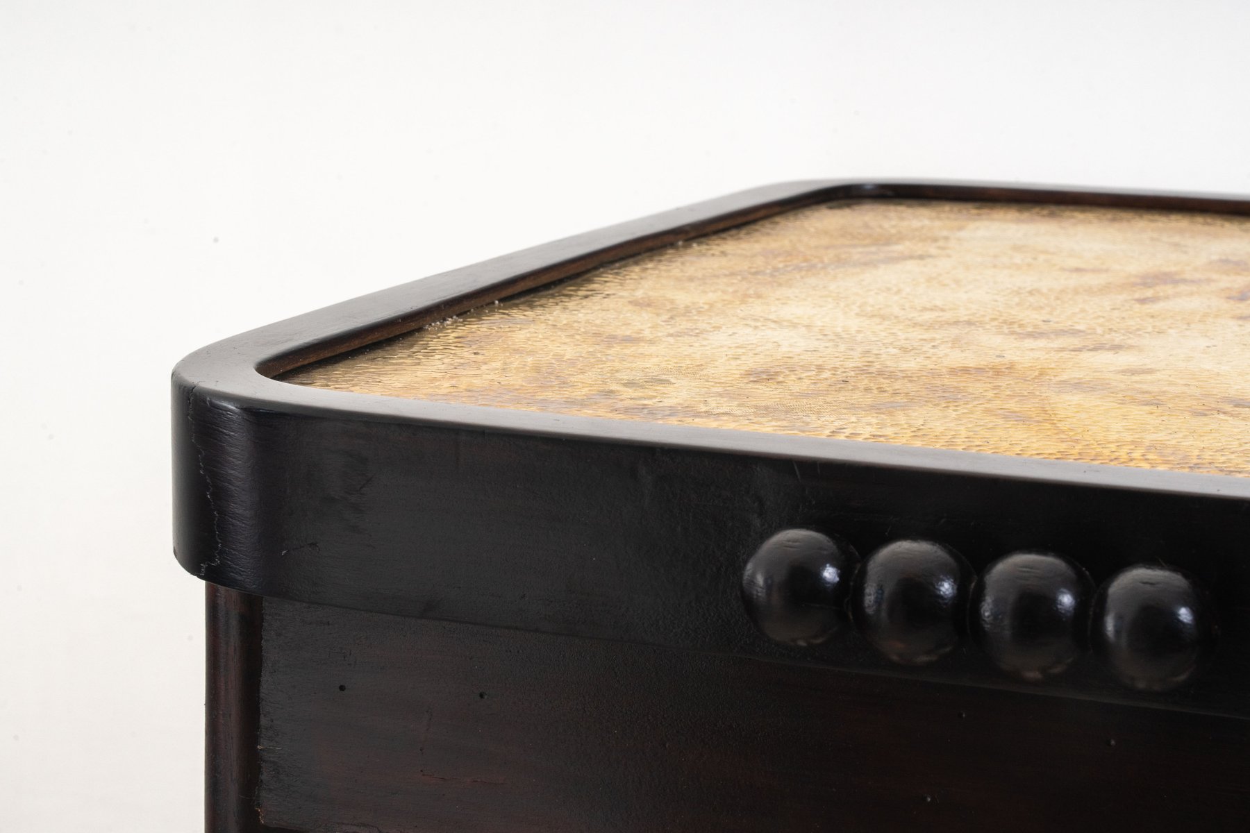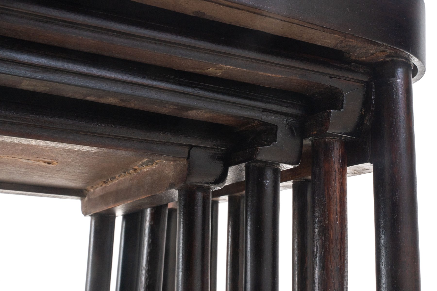 Dieses exquisite Set von Schachteltischen, entworfen von dem berühmten Josef Hoffmann und hergestellt von Jacob & Josef Kohn in Wien um 1905/06, ist ein Zeugnis des Jugendstils. Die aus Buchenholz gefertigten Tische mit eingelegten, gehämmerten Messingplatten sind besonders selten, da alle Stücke mit Messingplatten versehen sind. Der kleinste Tisch trägt ein Papieretikett mit der Aufschrift "JACOB & JOSEF KOHN", das seine Echtheit bestätigt. Die Tische sind in ausgezeichnetem Zustand und weisen nur minimale Gebrauchsspuren auf. Sie werden in mehreren bedeutenden Werken erwähnt, darunter die Kataloge der Fabrik J. & J. Kohn von 1906 und 1916, G. Renzis "Il mobile moderno, Gebrüder Thonet Wien, Jacob & Josef Kohn" (Mailand 2008), "Gebogenes Holz. Konstruktive Entwürfe Wien 1840-1910" (Wien 1979) sowie "Josef Hoffmann e la Wiener Werkstätte" von D. Baroni und A. d'Auria (Mailand 1981) sind diese Tische ein bemerkenswertes Beispiel für das Design des Jugendstils. Mit ihren Maßen von 75 cm Höhe, 62 cm Breite und 45 cm Tiefe sind sie ein seltenes und wertvolles Fundstück für Sammler und Liebhaber von Möbeln des frühen 20.