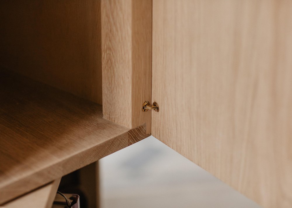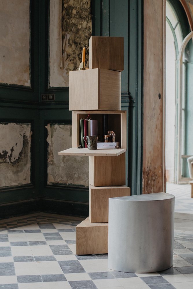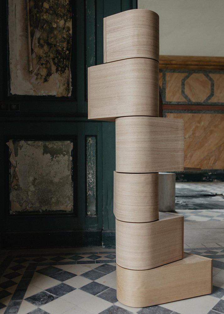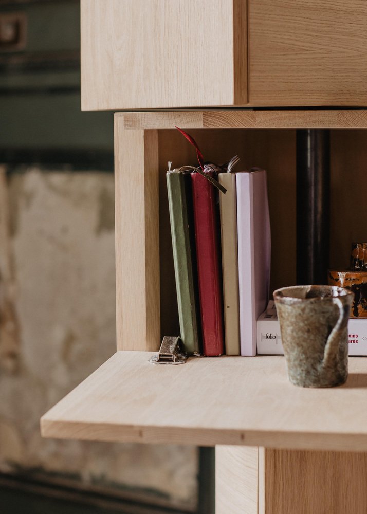 Secretary with Drawer by Mylene Niedzialkowski Dimensions: W 59 x H 160. Materials: Solid oak and solid steel. A rotating secretary with engaged curves on a solid steel axis. Combinable as desired, the secretary has door compartments and a flap compartment suitable for writing. The secretary with drawers is made up of 5 boxes, 4 of which have side doors and 1 of which has a flap shelf. The secretary with drawers is handcrafted in the South-West from solid French oak and oak veneer for its curved back. French-made steel frame. All our collections start from an exploration, from a curiosity for the material, from the discovery of the gesture to work it, from the application to master it and finally, from the care to arrive at the object that you discover while browsing these pages. Georges adorns himself with rare fibers and raw materials to carefully manufacture, entirely by hand, sincere objects and other numbered masterpieces, always in a reasoned approach. All our objects and lights are handmade in our factory in Béarn, in Méritein. In this castle, our teams use simple and raw materials sourced as close as possible and transformed on site. A manufacturing process that is economical in resources, generous in know-how and respectful of the environment. At the basis of each object, there is a permanent desire to experiment. To understand matter, its constraints, its properties. And to transform it, taking care to only work on it as minimally as possible. from this desire to leave the raw material as raw as possible, Mylene Niedzialkowski draws and designs pieces with minimal lines, with singular and assertive irregularities. Sailing between the South West of France and Paris, fascinated by arte povera and popular arts, Mylene Niedzialkowski strives to accumulate local raw materials in her workshop, from neighboring regions, basic and common materials, ordinary and daily, both household and industrial or even from production residues. from this collection which oscillates between material library and cabinet of curiosities, simple objects with clean lines are created, sometimes everyday, sometimes with an essentially decorative function.
