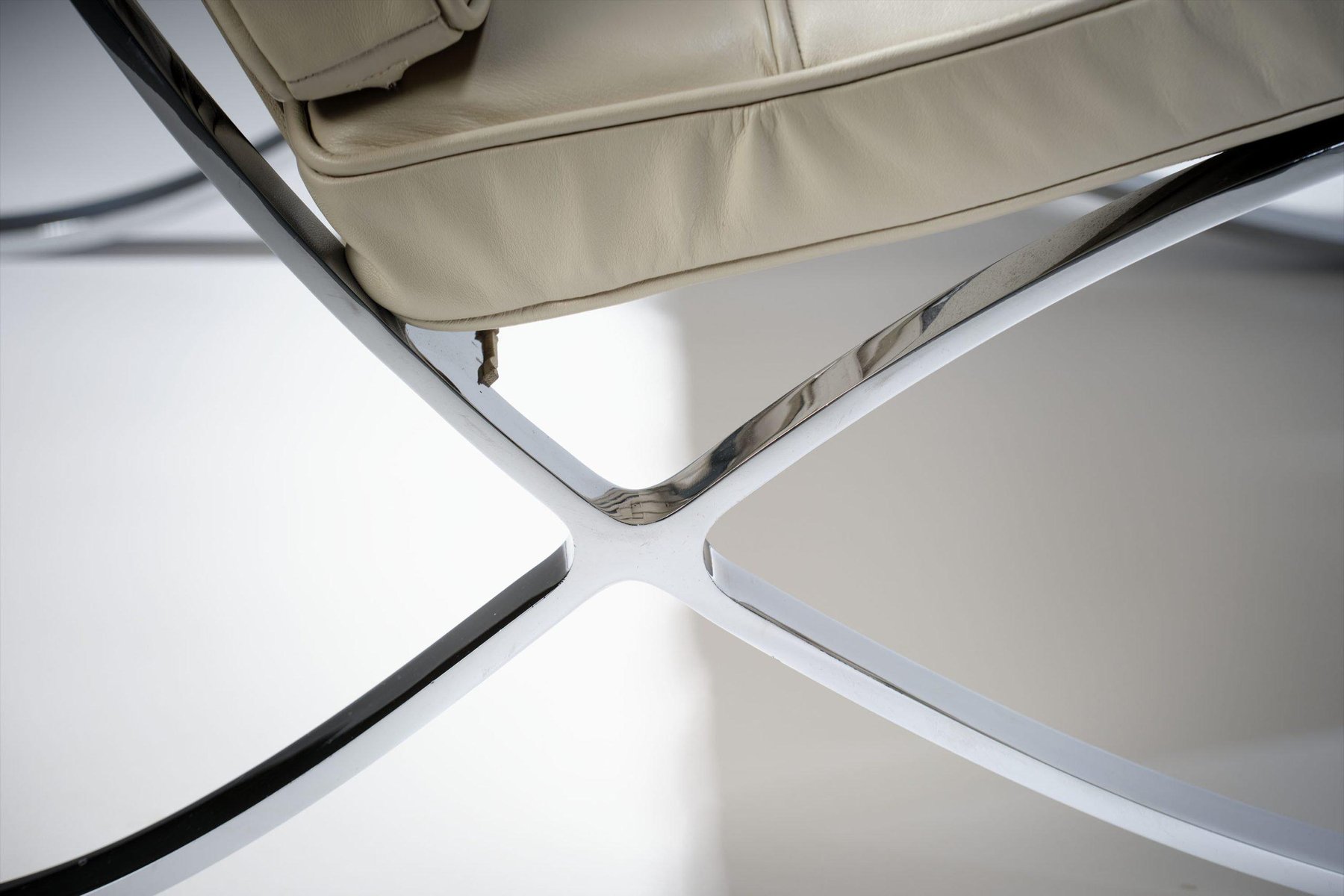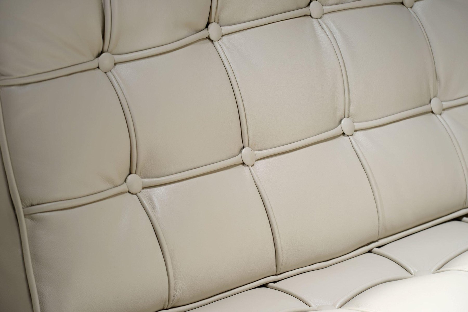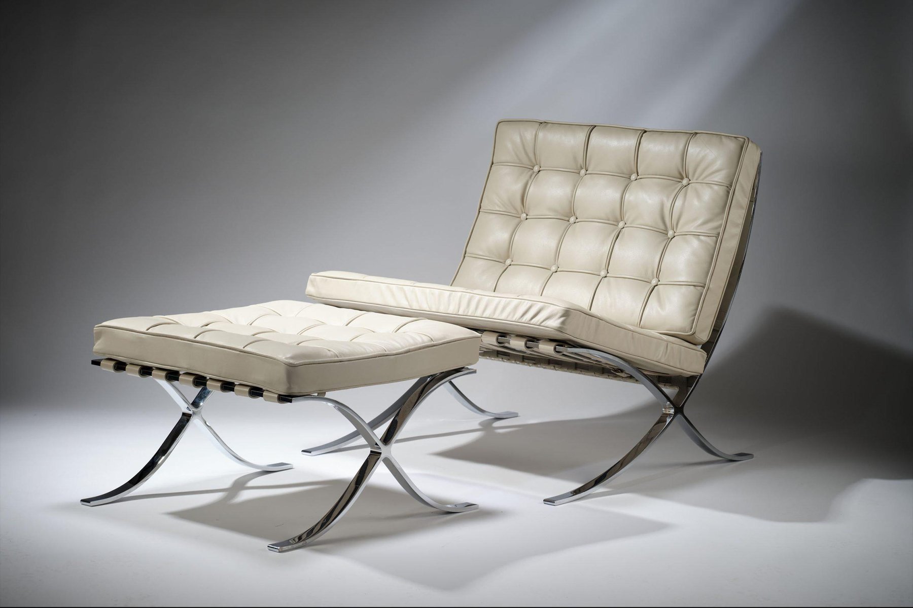 Barcelona Chair & Ottoman Exquisite, Fully Restored Iconic Genuine Barcelona Chair & Ottoman By Mies Van Der Rohe For Knoll Inc, Stunning Italian Ivory Leather, USA Circa 2001. Stunning and original Barcelona Chair and Ottoman dating back from 2001, designed by Ludwig Mies Van Der Rohe for Knoll Studio USA. This iconic piece of furniture has been fully restored by the best craftsmen, fully restored chromed steel frame still showing patina of age, fully reupholstered seat and backrest with correct Knoll under cloth and covered buttons, matching hand dyed matching ivory leather strap supports with correct buckles to retain seat and seat cushion in place. Looks incredible in the finest Italian ivory leather with correct square panelled segments with piped detail. Makers signature to chair and ottoman frame legs with original studio manufacture date labels. Dimensions 77 x 77 x 75 ( W x D x H ) cm (seat height 43cm) Ottoman 59 x 59.5 x 39 ( W x D x H ) cm Weight 25kg Materials Leather, Steel Styles 1990s, United States of America Lead Time