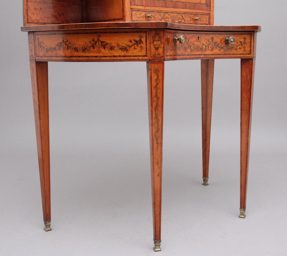19. Jahrhundert Sheraton Wiederbelebung Satinholz und Intarsien Schreibtisch / Kabinett zugeschrieben Edwards & Roberts, die eingelegten geformten Fries mit Schachbrettlinie eingelegten Viertel Runde Regale unten flankieren den Fall reichlich eingelegt, einschließlich eines Paares von Vögeln trinken aus einem Brunnen, der Fall nach unten fallen, um verschiedene Fächer Räume mit einem schönen geformten Fries und zwei Schubladen mit Original-Messing Löwenmaske Ring Griffe zu offenbaren, unterhalb des Sturzes befindet sich eine weitere, mit Eichenholz ausgekleidete Schublade. Im unteren Bereich befindet sich in der Mitte eine gebogene, mit Eichenholz ausgekleidete Schublade mit originalen, gedrechselten Messinggriffen, die Schubladenfront und die Seiten des Schranks haben dekorative Blumenintarsien. Um 1880.