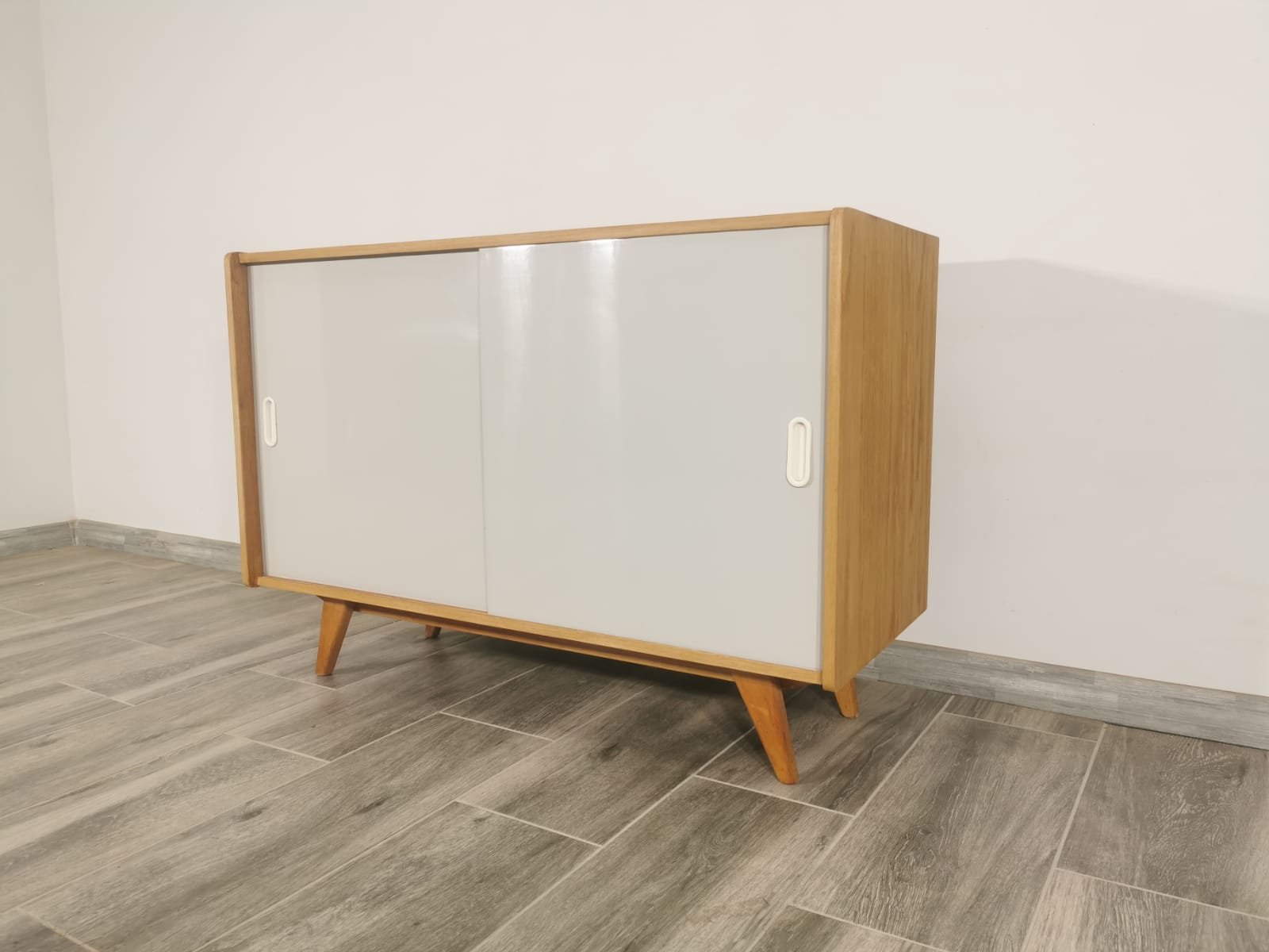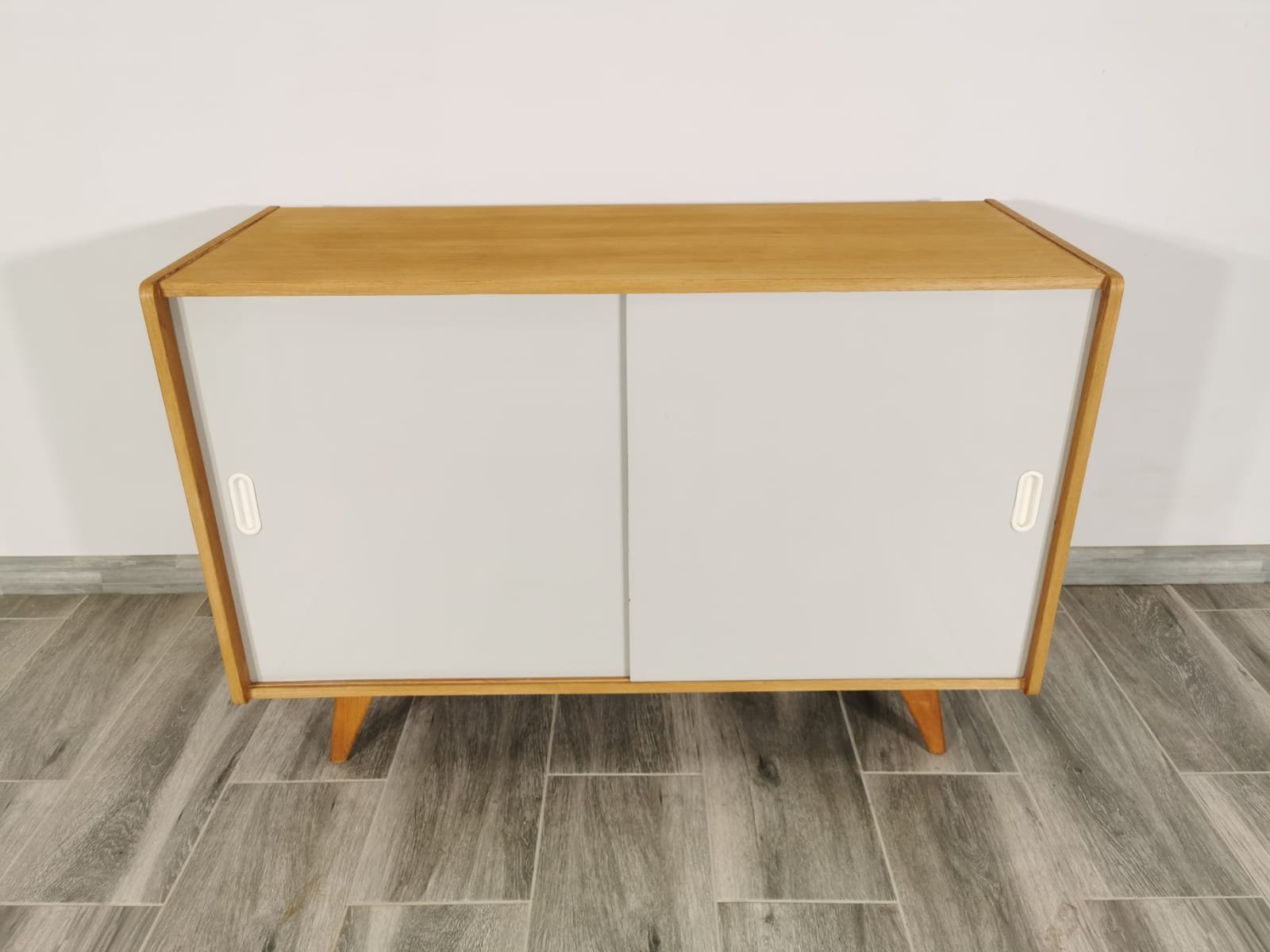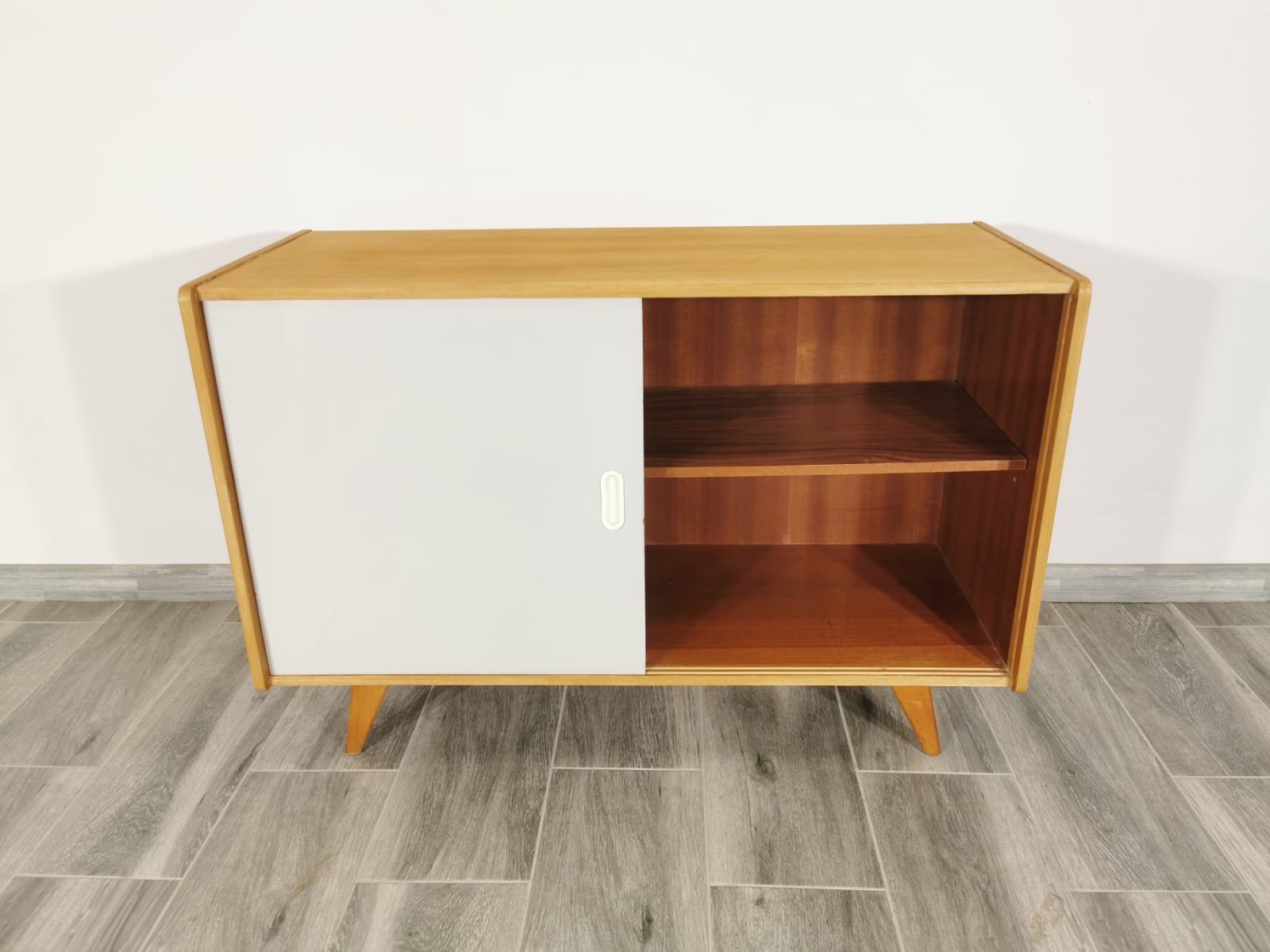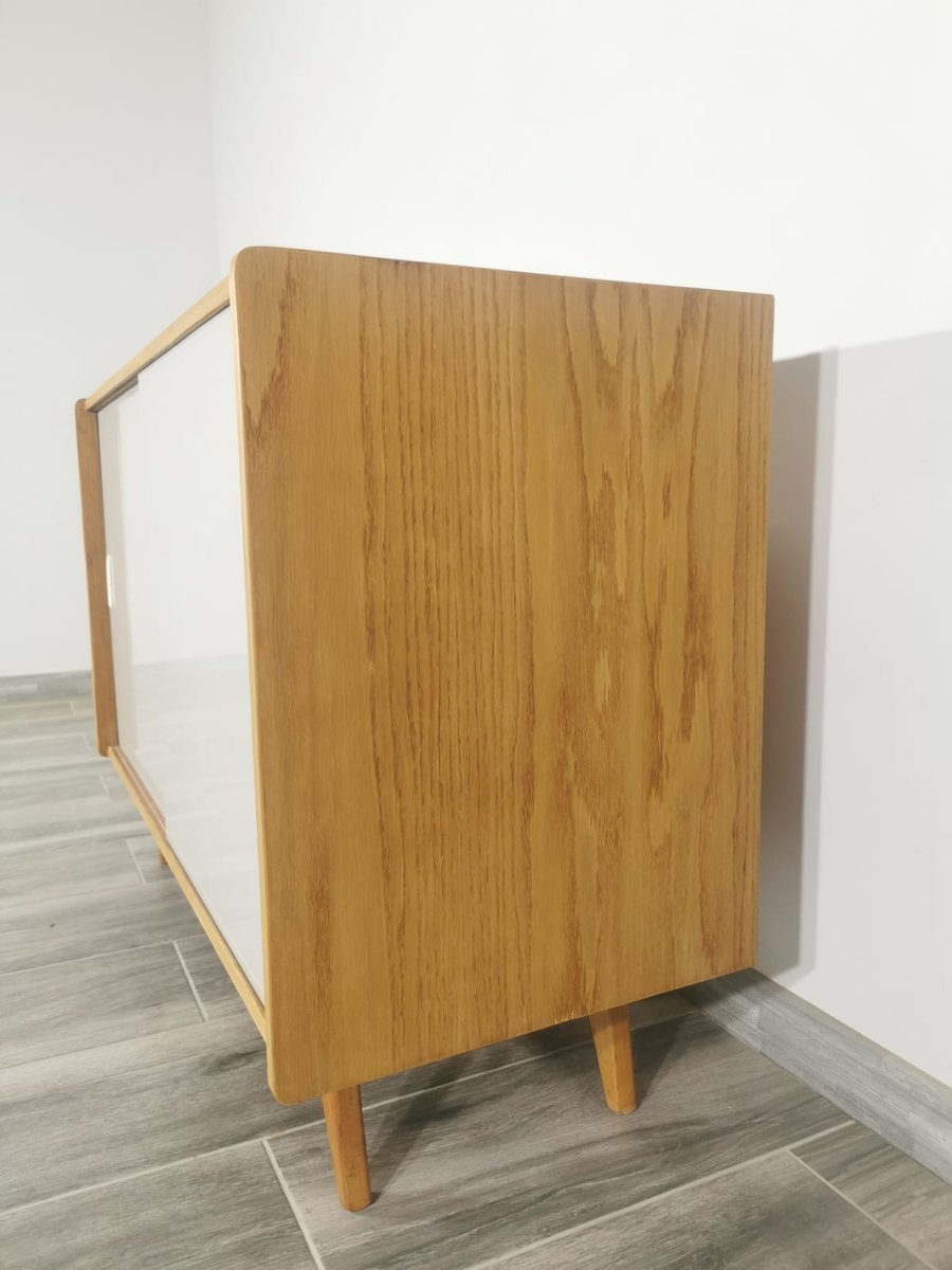 On the heels of early successes, Jiroutek became the head of design at Interier Praha in 1958 and soon after began work on the U-450 series. The designs were heavily inspired by the watershed ’58 Expo in Brussels, which moved Czech postwar design generally toward a “softer” modernism—one characterized by pastel colors, new geometries, and the use of modern materials like engineered composites, glass, and concrete. Jiroutek became know especially for the simple morphologies of oak-veneered sideboards and cabinets with sleekly color-blocked sliding doors and drawers.