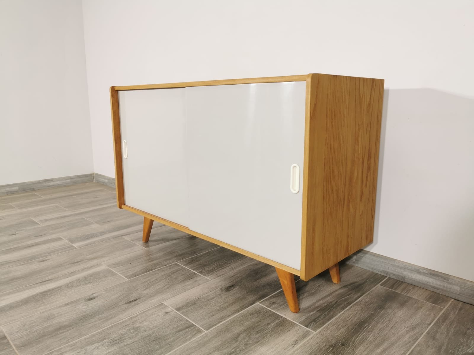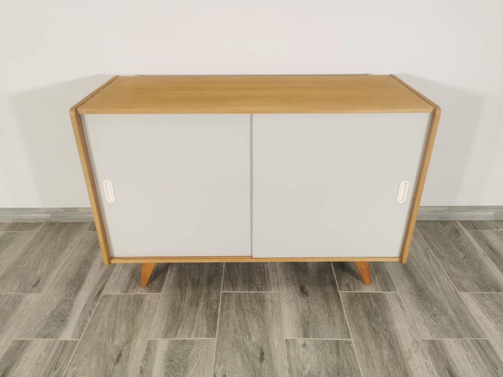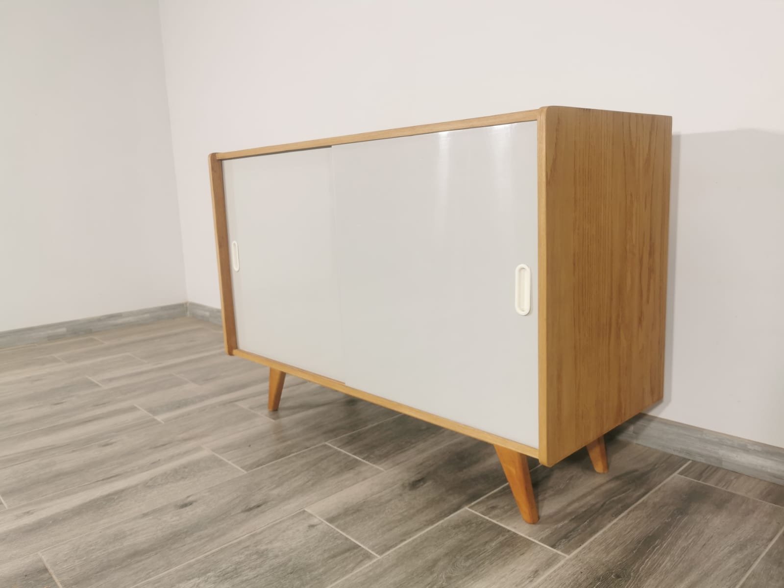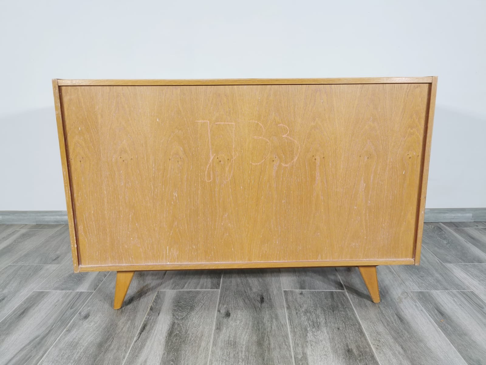 On the heels of early successes, Jiroutek became the head of design at Interier Praha in 1958 and soon after began work on the U-450 series. The designs were heavily inspired by the watershed ’58 Expo in Brussels, which moved Czech postwar design generally toward a “softer” modernism—one characterized by pastel colors, new geometries, and the use of modern materials like engineered composites, glass, and concrete. Jiroutek became know especially for the simple morphologies of oak-veneered sideboards and cabinets with sleekly color-blocked sliding doors and drawers.