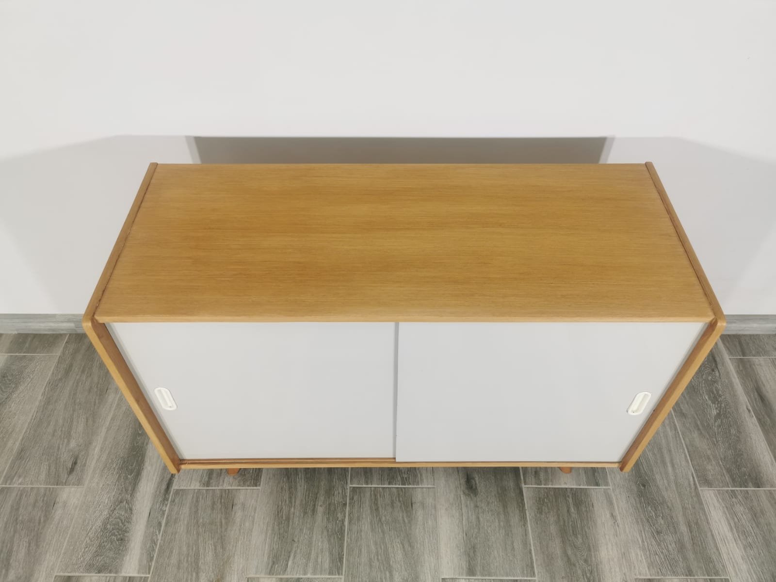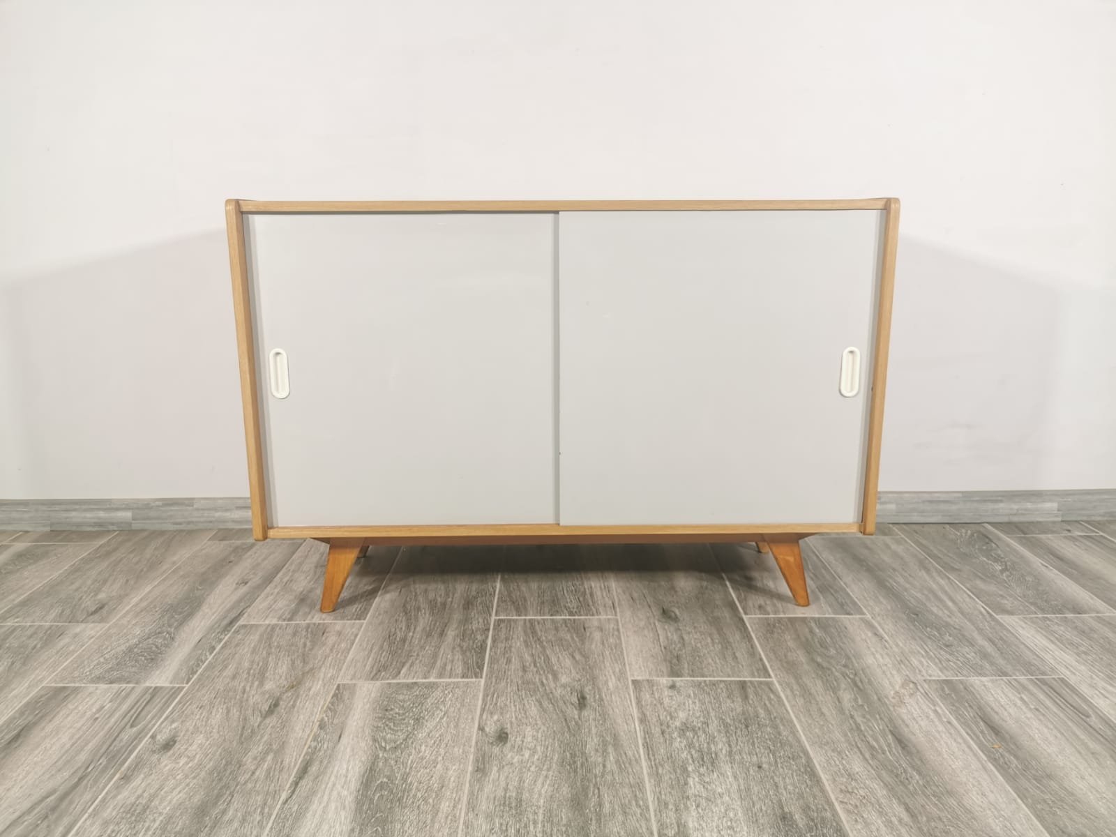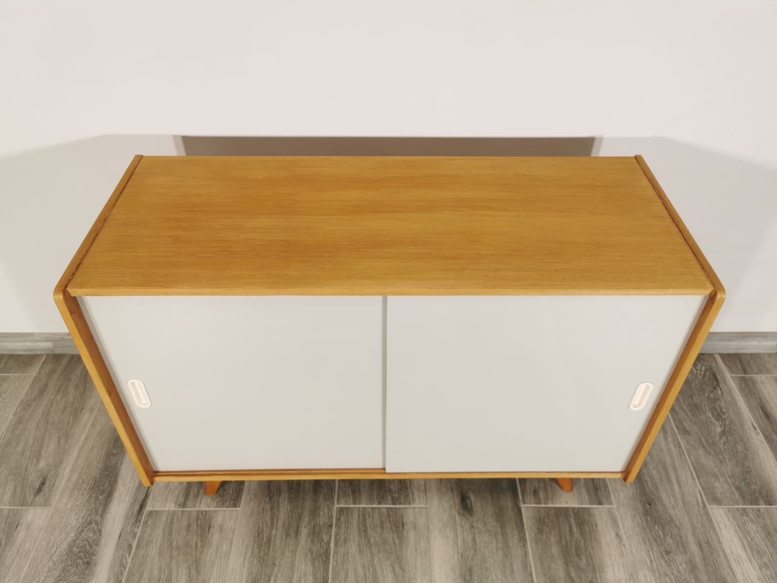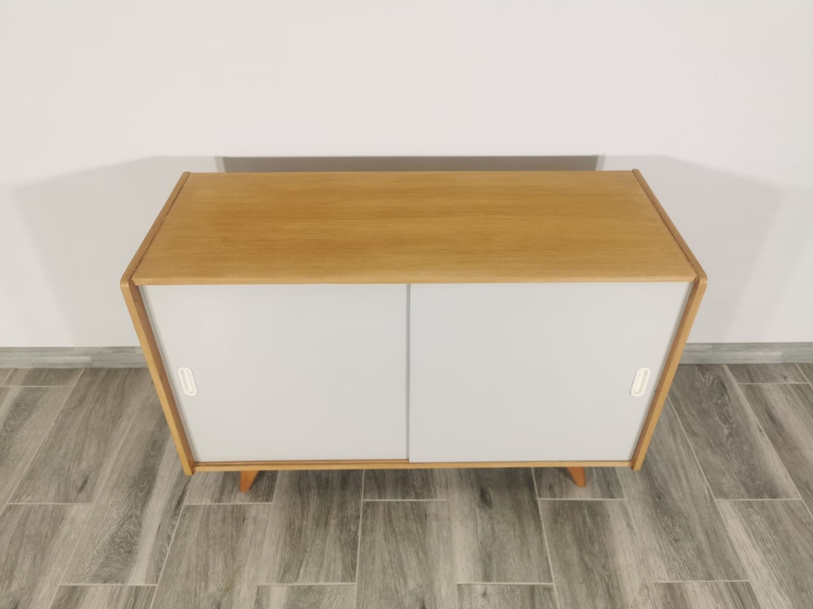 On the heels of early successes, Jiroutek became the head of design at Interier Praha in 1958 and soon after began work on the U-450 series. The designs were heavily inspired by the watershed ’58 Expo in Brussels, which moved Czech postwar design generally toward a “softer” modernism—one characterized by pastel colors, new geometries, and the use of modern materials like engineered composites, glass, and concrete. Jiroutek became know especially for the simple morphologies of oak-veneered sideboards and cabinets with sleekly color-blocked sliding doors and drawers.