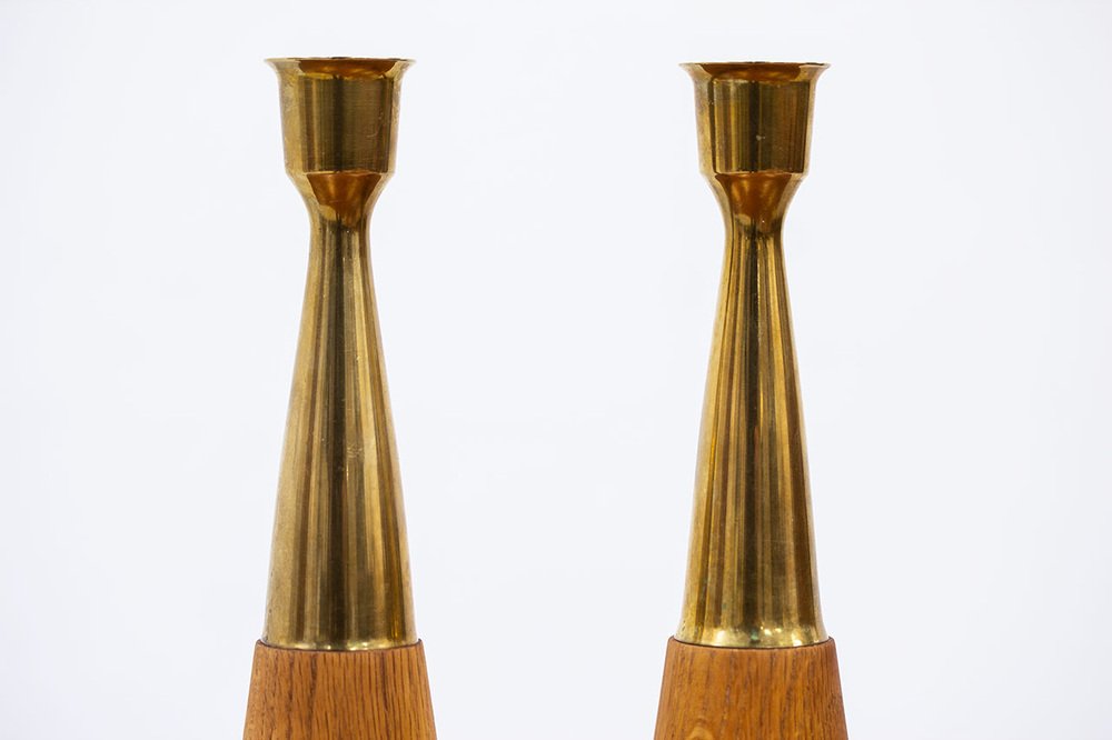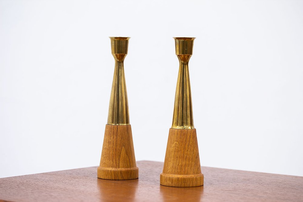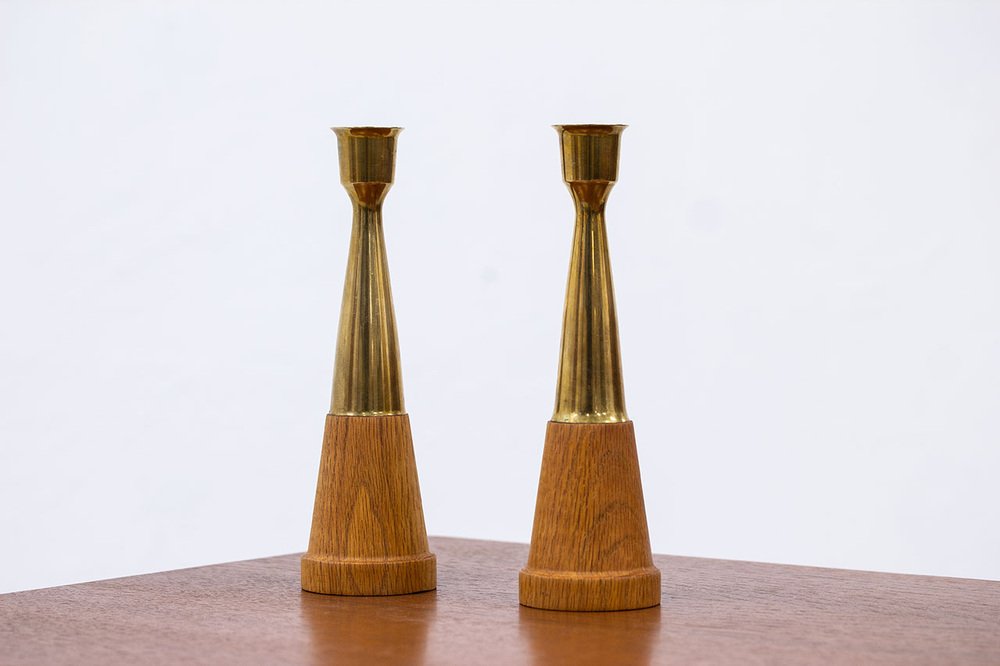 Skandinavische Vintage Kerzenständer aus Eiche & Messing, 1960er, 2er Set