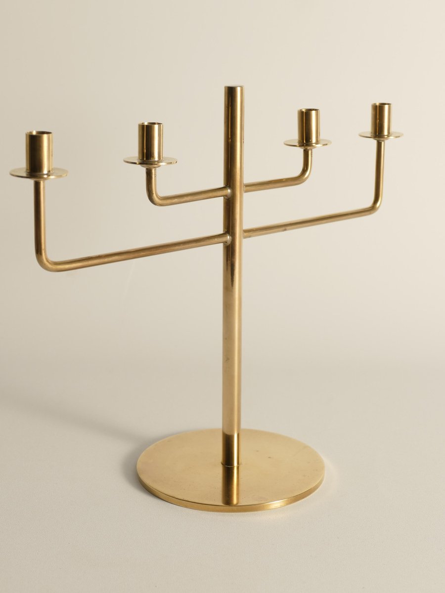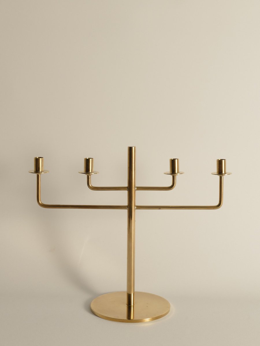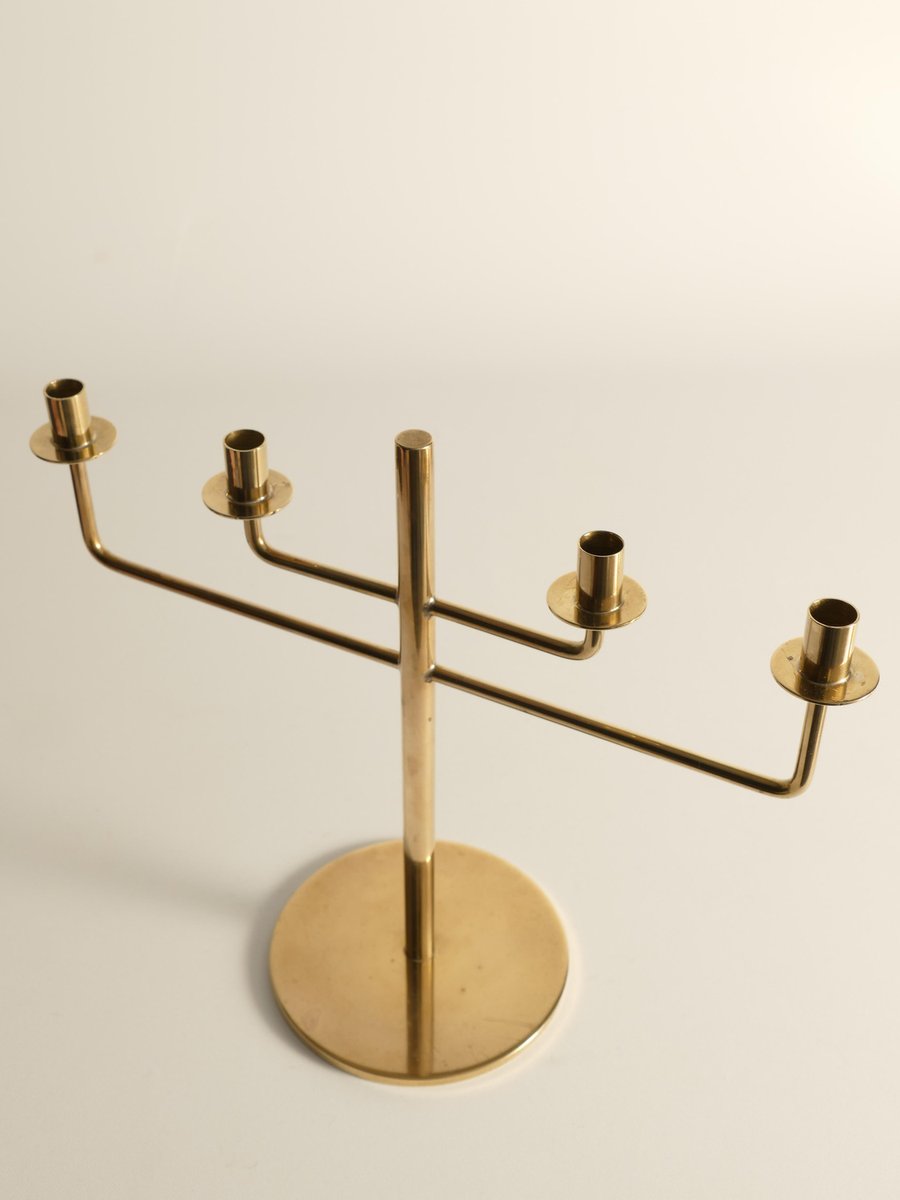 This rare candelabra, designed by the iconic Scandinavian modernist Hans-Agne Jakobsson, is a beautiful example of his work from the 1960s. Known for his innovative approach to lighting, Jakobsson created this brass candelabra, Model L29, a piece of minimalistic art that captures the essence of Scandinavian modern design. Made from brass, the candelabra stands at 20 cm and is designed to hold four thin candles. The piece is marked underneath, confirming its authenticity and origin. Despite its age, the candelabra remains in good condition, with only minor scratches and some tarnish, which are common in vintage brass items and add to its unique character. ABOUT HANS-AGNE JAKOBSSON Hans-Agne Jakobsson (1919-2009) was a Swedish interior architect and furniture designer, born in Havdhem, Gotland. He became famous in the 1950s and 1960s for his elegant and modern lamp designs. After completing his apprenticeship as a cabinetmaker at 18, Jakobsson earned an architecture degree in Gothenburg. He worked as an industrial designer for General Motors and assisted Carl Malmsten and Werner West. In 1951, he founded his own lighting company, Hans-Agne Jakobsson AB, in Småland. His brass lamps and the iconic wood veneer lamps from his subsidiary, Ellysett, became trademarks. Jakobsson's lighting fixtures are known for their soft, soothing light and meticulous design, embodying his unique lighting philosophy.