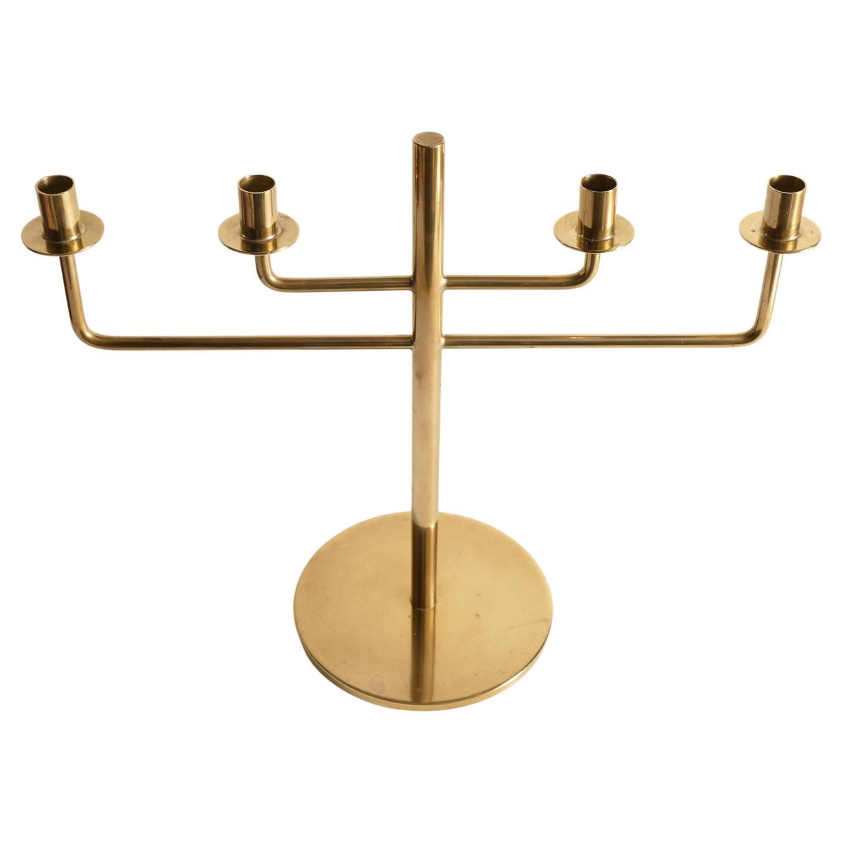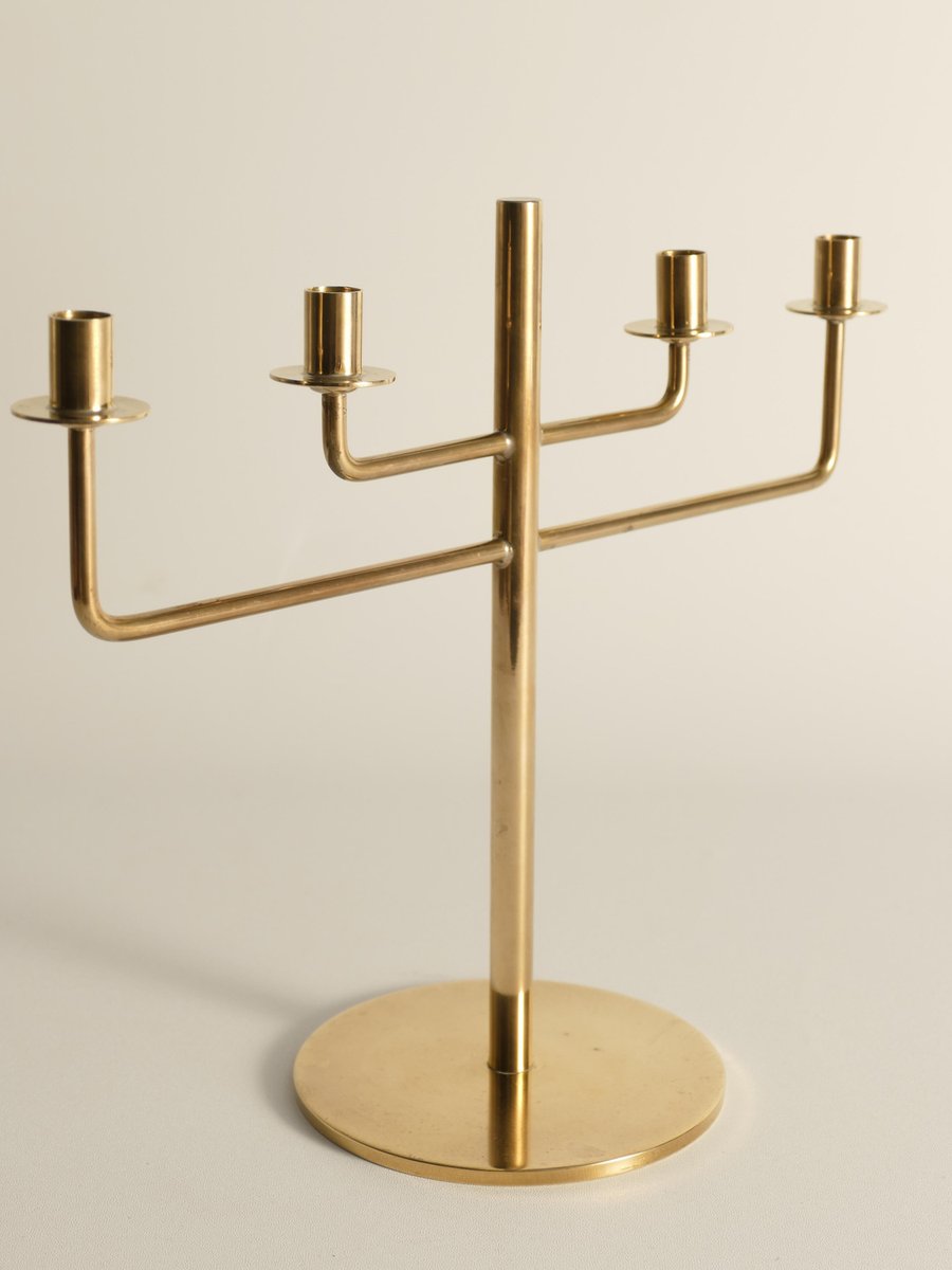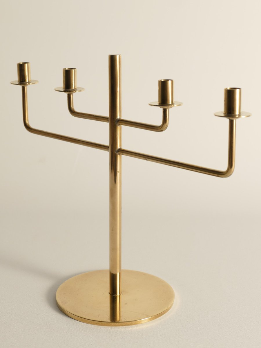 This rare candelabra, designed by the iconic Scandinavian modernist Hans-Agne Jakobsson, is a beautiful example of his work from the 1960s. Known for his innovative approach to lighting, Jakobsson created this brass candelabra, Model L29, a piece of minimalistic art that captures the essence of Scandinavian modern design. Made from brass, the candelabra stands at 20 cm and is designed to hold four thin candles. The piece is marked underneath, confirming its authenticity and origin. Despite its age, the candelabra remains in good condition, with only minor scratches and some tarnish, which are common in vintage brass items and add to its unique character. ABOUT HANS-AGNE JAKOBSSON Hans-Agne Jakobsson (1919-2009) was a Swedish interior architect and furniture designer, born in Havdhem, Gotland. He became famous in the 1950s and 1960s for his elegant and modern lamp designs. After completing his apprenticeship as a cabinetmaker at 18, Jakobsson earned an architecture degree in Gothenburg. He worked as an industrial designer for General Motors and assisted Carl Malmsten and Werner West. In 1951, he founded his own lighting company, Hans-Agne Jakobsson AB, in Småland. His brass lamps and the iconic wood veneer lamps from his subsidiary, Ellysett, became trademarks. Jakobsson's lighting fixtures are known for their soft, soothing light and meticulous design, embodying his unique lighting philosophy.