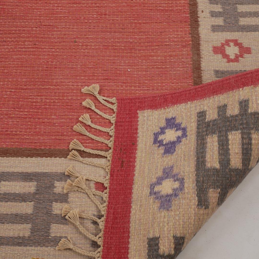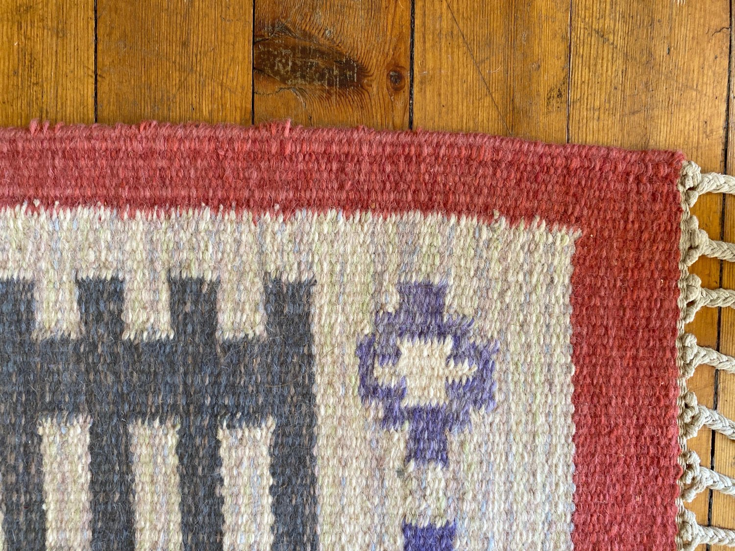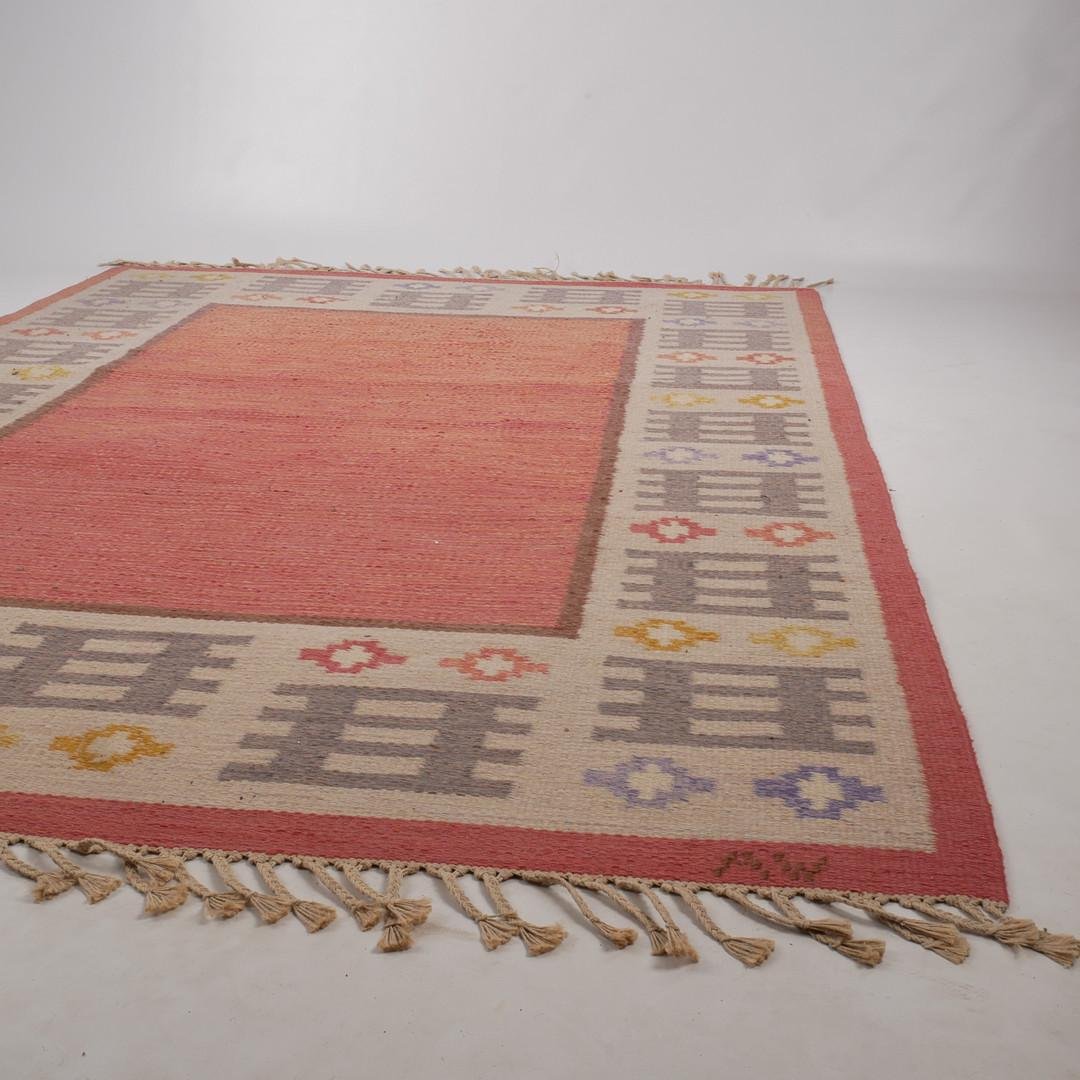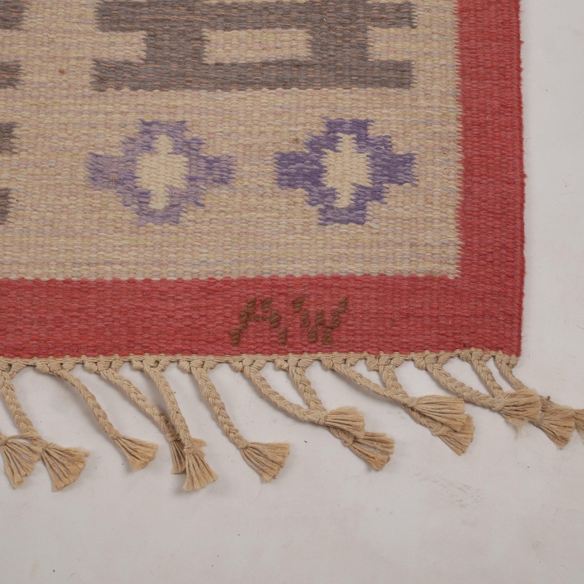 A beautiful vintage Swedish flat-woven wool rug by Alice Wallebäck from the 1960s, featuring her woven initials (AW) in the lower corner. This Scandinavian Modern Rölakan rug showcases a geometric floral design in two tones of purple, pink, and yellow, set against a white background. This design is framed by a brown inner border and a solid pink outer border, adding depth and structure. Expertly handwoven using high-quality wool and linen, this rug exemplifies the fine craftsmanship and tradition of Scandinavian design. The high quality braided fringe along the top and bottom edges adds a charming, finishing touch. Dimensions: 245 x 170 cm Monogram signed: AW CONDITION This vintage rug is in good condition with signs of use and some sun bleaching on the front. The uplifted corner in the photos and the video highlights the color difference between the sun-bleached front and the original, darker pink underside. Please note that the brown dots visible near the monogram are from the embroidery and are not stains. The rug is reversible, though the reverse side lacks the monogram. However, the rug looks as new when having the reverse side up. The video shows the reverse side up, and the rug pictures shows the front side up. The wear on the sides of the rug is shown in the last four photos.