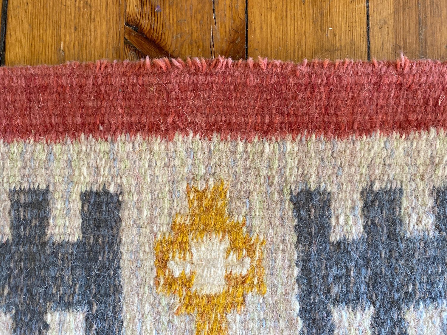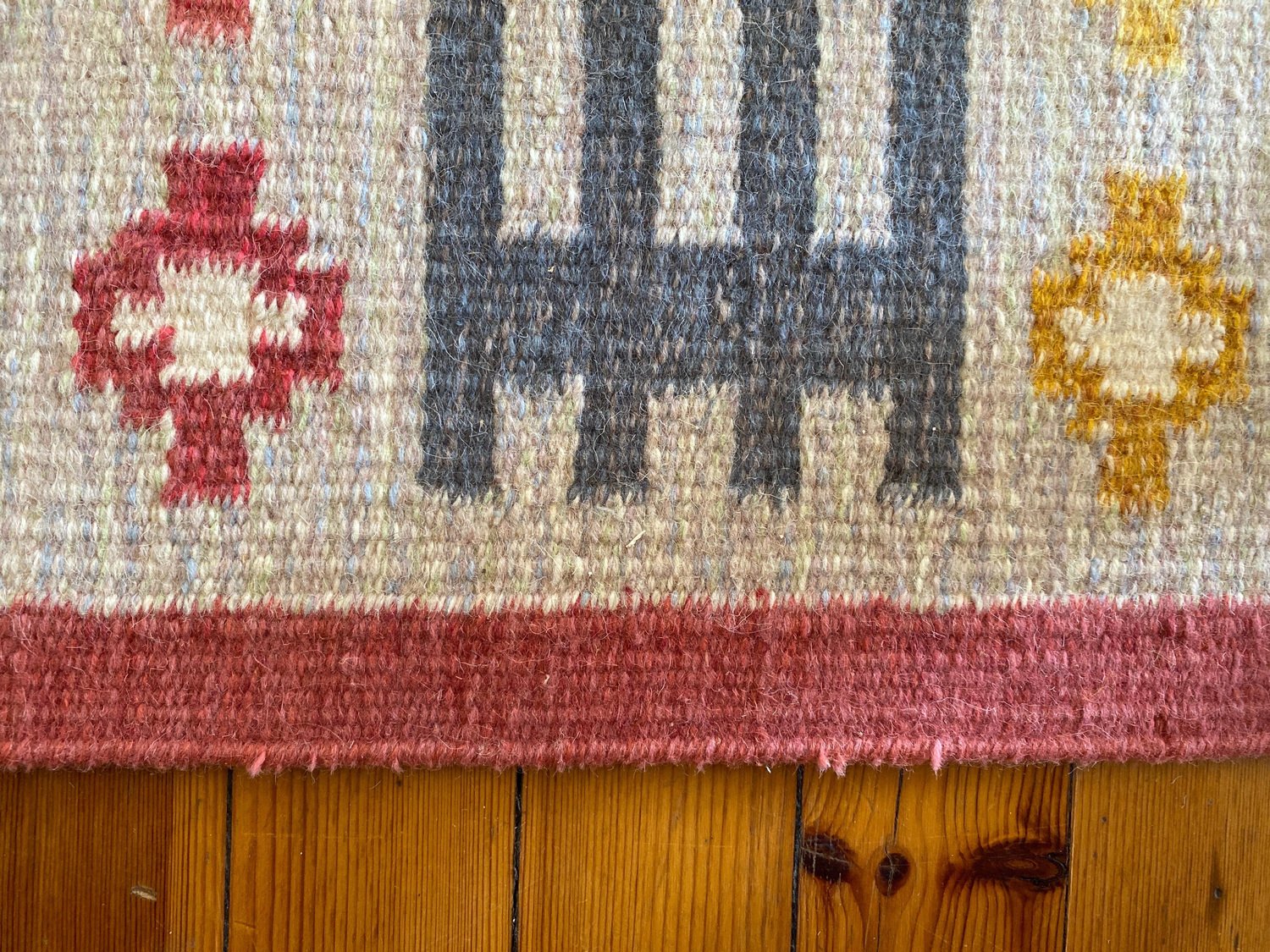 Ein wunderschöner schwedischer flachgewebter Wollteppich von Alice Wallebäck aus den 1960er Jahren mit ihren eingewebten Initialen (AW) in der unteren Ecke. Dieser skandinavisch-moderne Rölakan-Teppich zeigt ein geometrisches Blumenmuster in zwei Lila-, Rosa- und Gelbtönen vor einem weißen Hintergrund. Dieses Muster wird von einer braunen Innenbordüre und einer unifarbenen rosa Außenbordüre umrahmt, die ihm Tiefe und Struktur verleihen. Dieser Teppich wurde aus hochwertiger Wolle und Leinen handgewebt und ist ein Beispiel für die feine Handwerkskunst und Tradition des skandinavischen Designs. Die hochwertigen, geflochtenen Fransen entlang der oberen und unteren Kante verleihen dem Teppich einen charmanten, letzten Schliff. Abmessungen: 245 x 170 cm Monogramm signiert: AW ZUSTAND Dieser Vintage-Teppich ist in gutem Zustand mit Gebrauchsspuren und etwas Sonnenbleiche auf der Vorderseite. Die hochgezogene Ecke auf den Fotos und im Video hebt den Farbunterschied zwischen der sonnengebleichten Vorderseite und der ursprünglichen, dunkleren rosa Unterseite hervor. Bitte beachten Sie, dass die braunen Punkte, die in der Nähe des Monogramms zu sehen sind, von der Stickerei stammen und keine Flecken sind. Der Teppich ist wendbar, allerdings fehlt auf der Rückseite das Monogramm. Allerdings sieht der Teppich mit der Rückseite nach oben wie neu aus. Das Video zeigt die Rückseite nach oben, die Bilder des Teppichs zeigen die Vorderseite nach oben. Die Abnutzung an den Seiten des Teppichs ist in den letzten vier Fotos gezeigt.