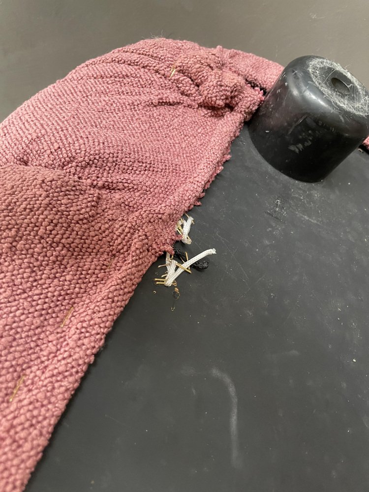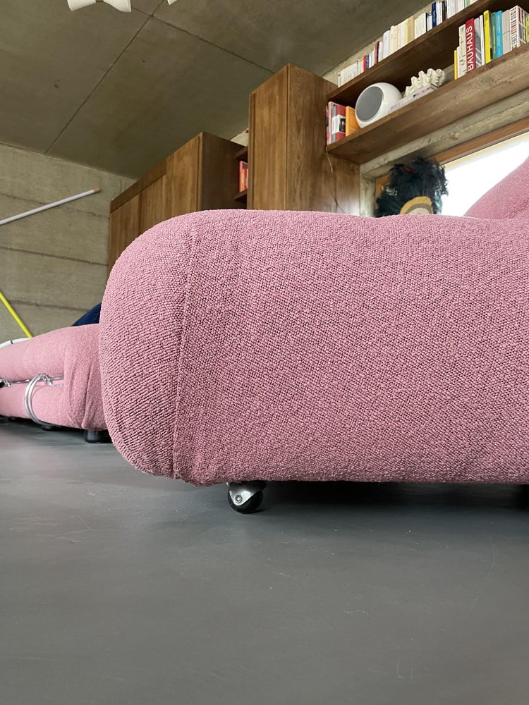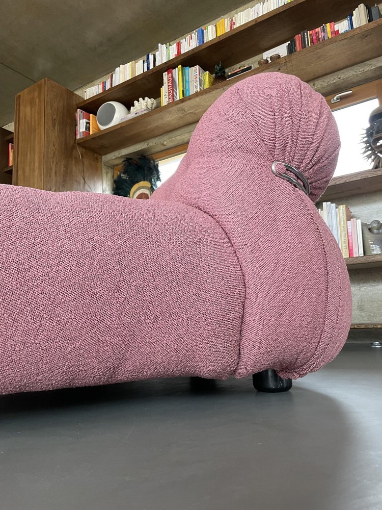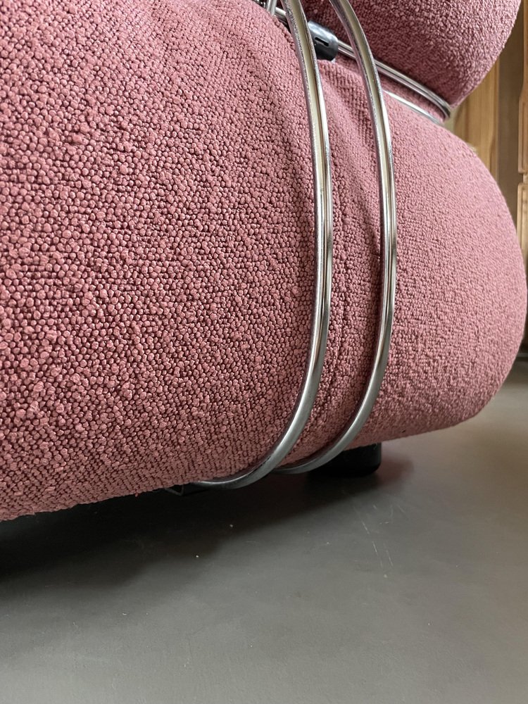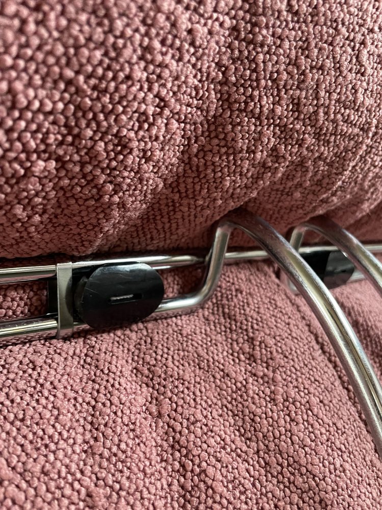 Der Sessel wurde mit einem "fertigen" Stoff aus einer feinen altrosa Farbe bezogen. Der lockige bringt ihm eine gewisse Wärme, und eine sehr interessante Süße des Sitzes.
