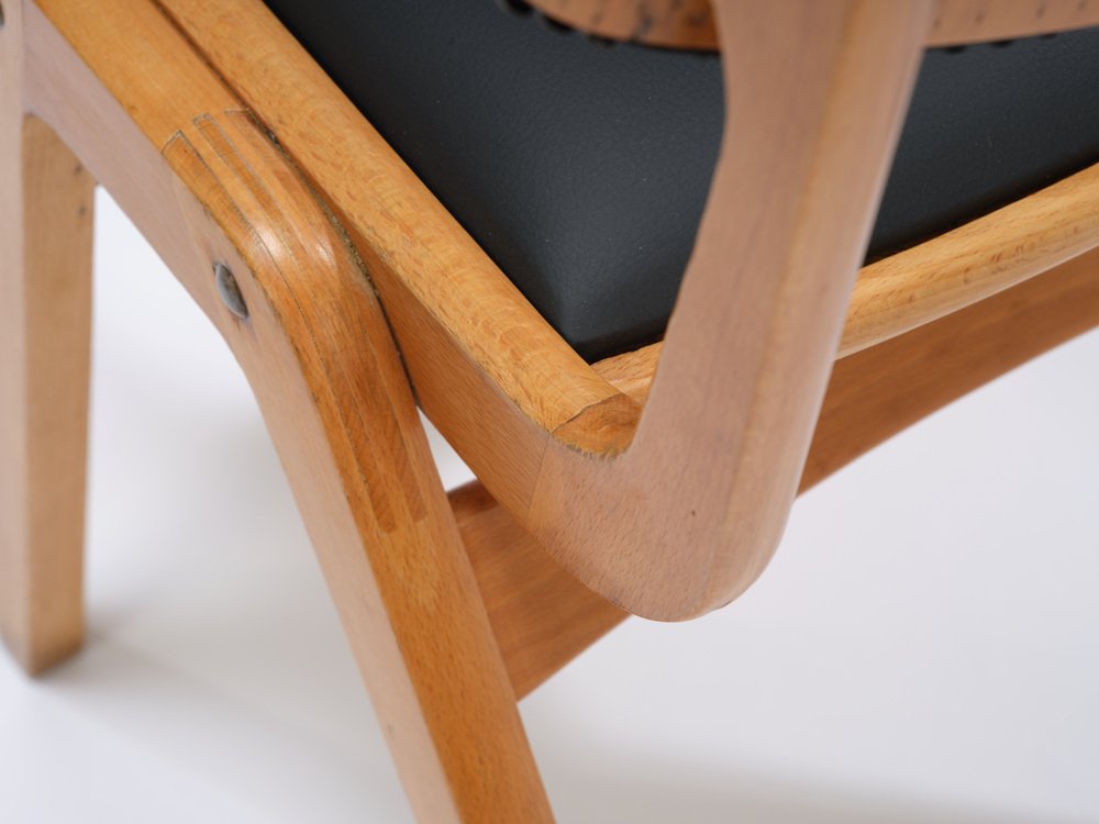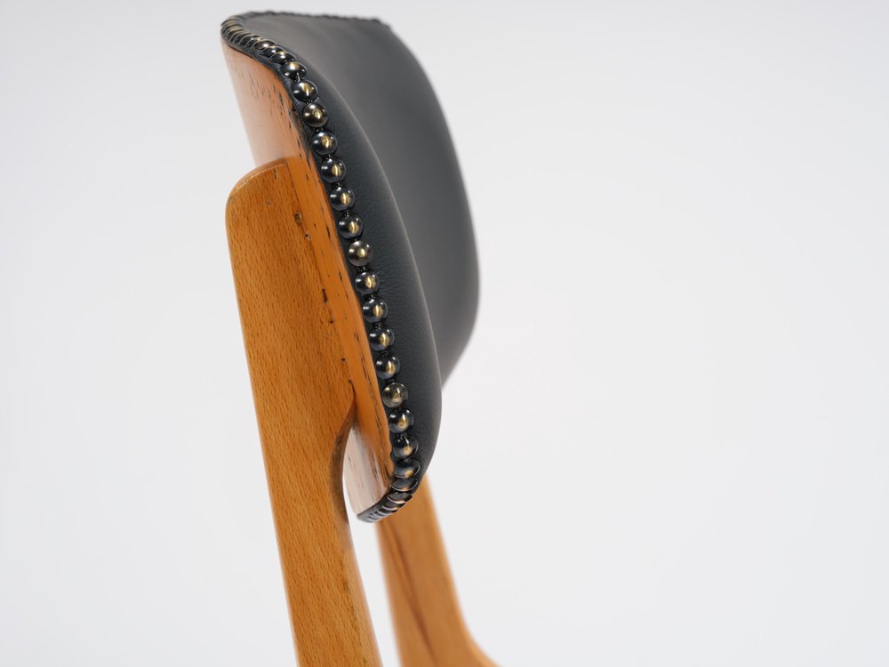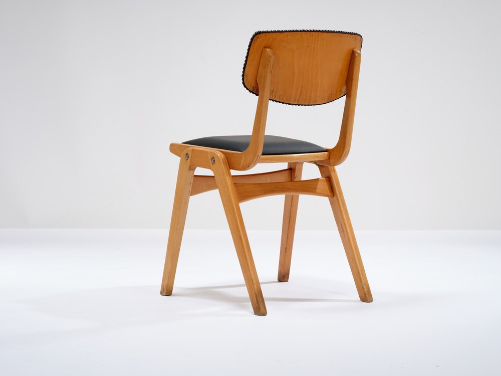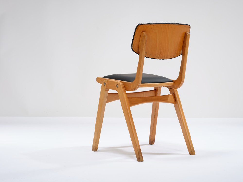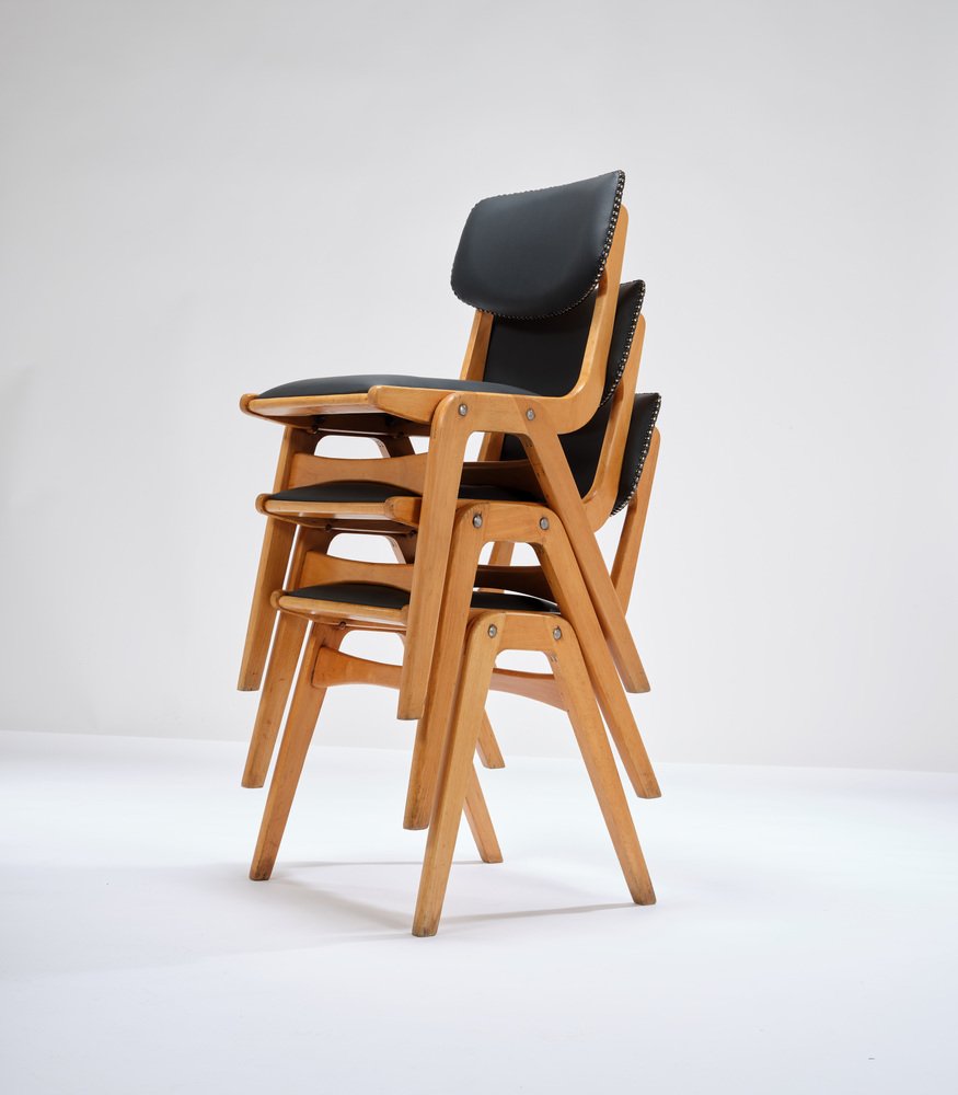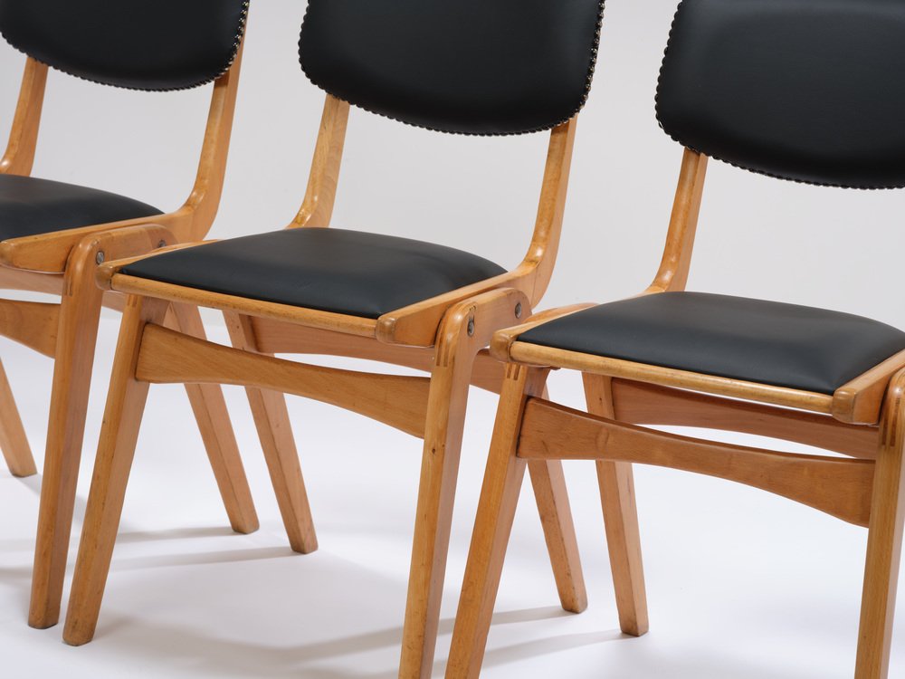 Die Ben-Stühle haben ein einfaches Design und die charakteristischen laminierten A-Rahmen-Beine, die es ermöglichen, sie zu stapeln und bei Nichtgebrauch einfach zu verstauen. Die Sitzpolster sind abnehmbar.