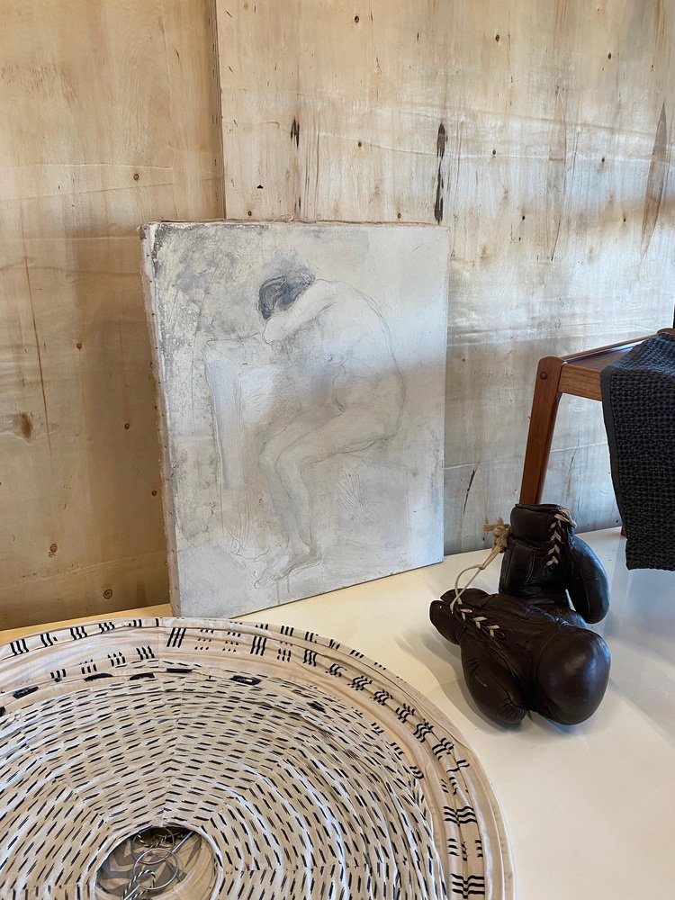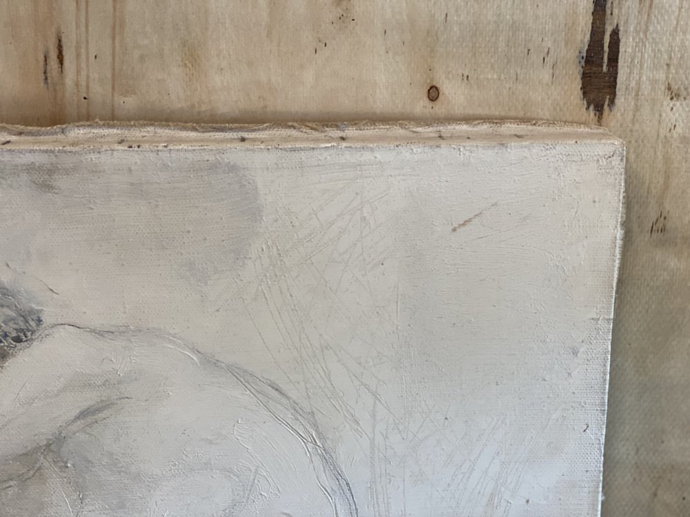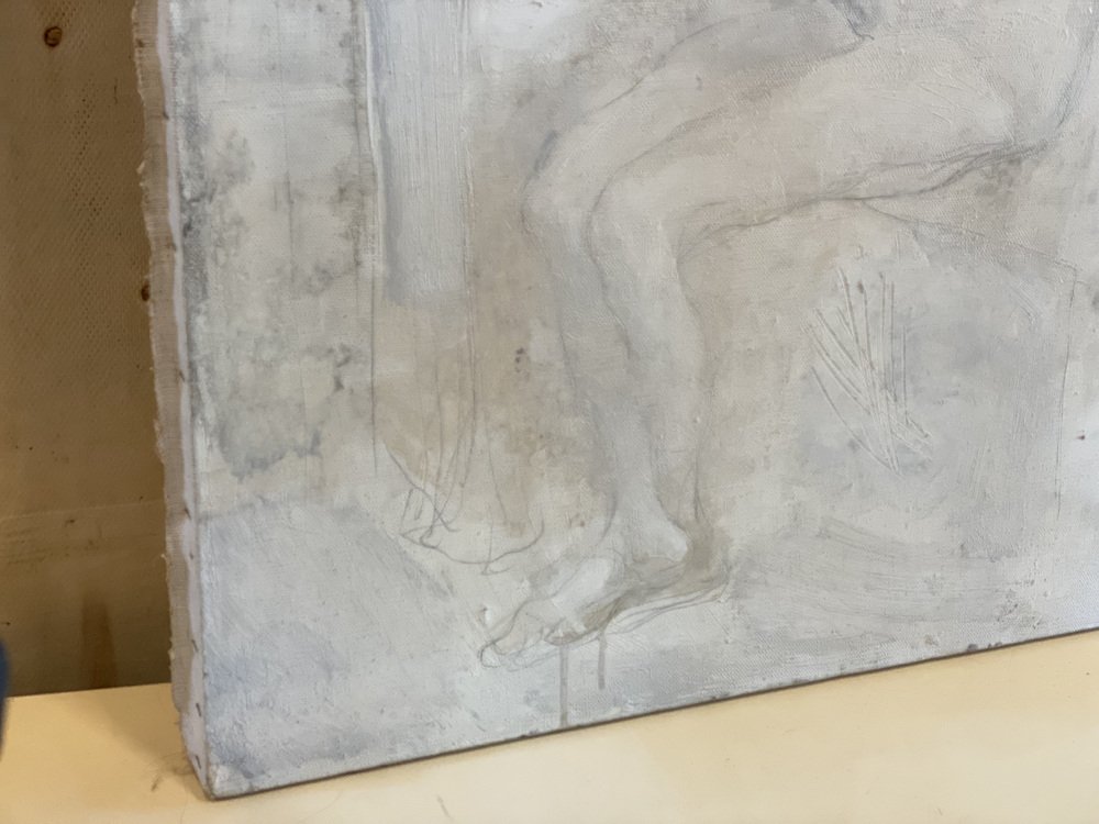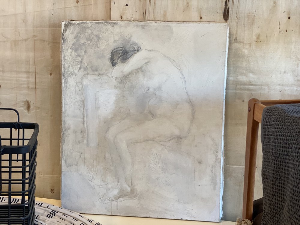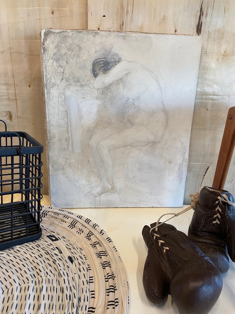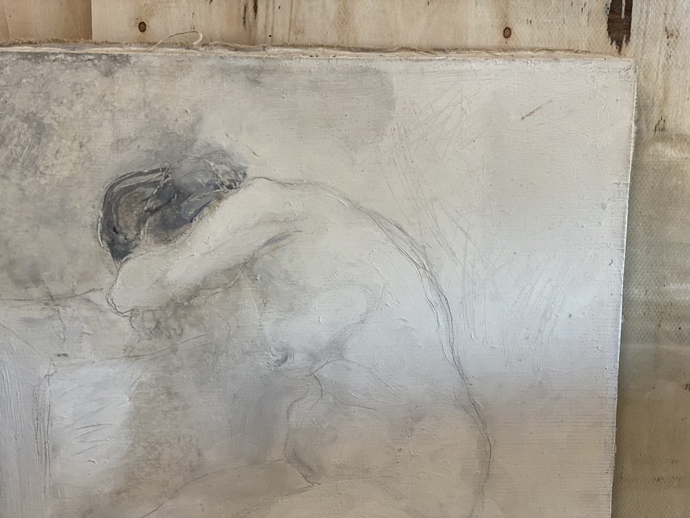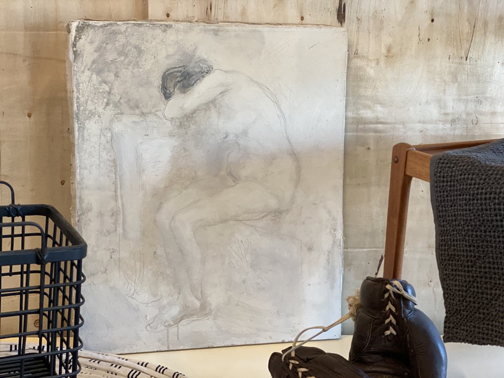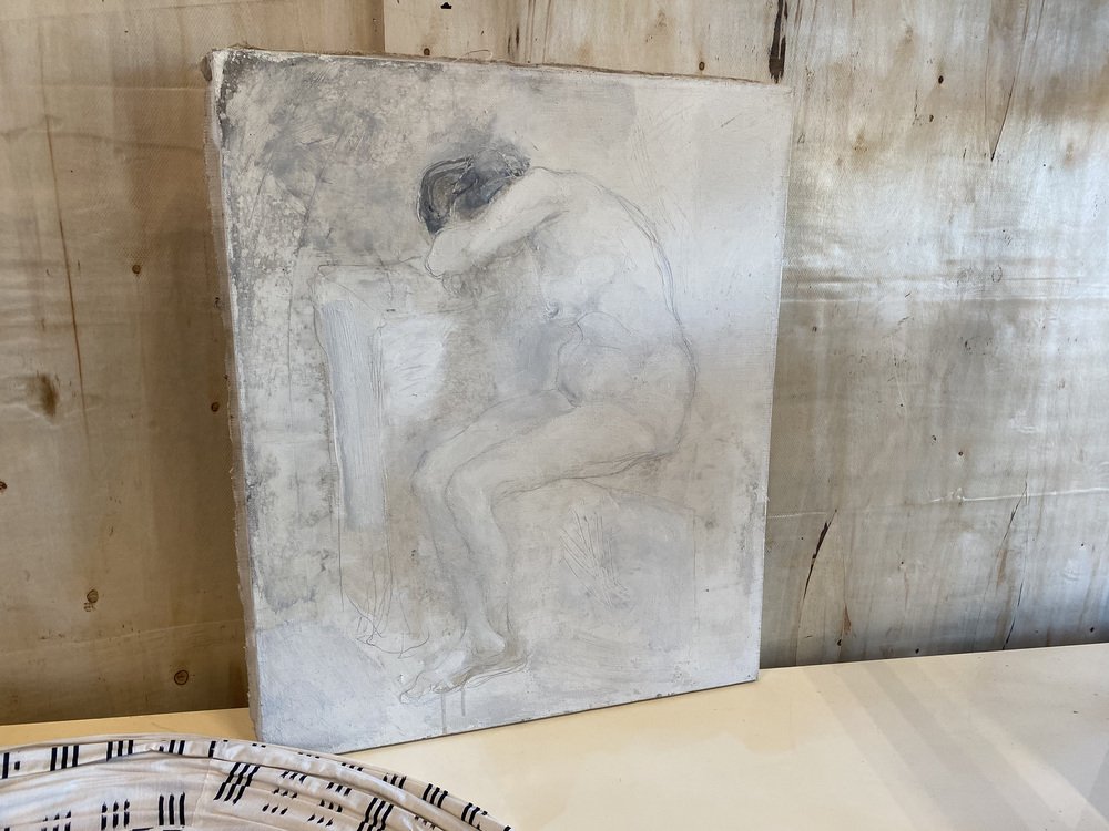 The painting shows a female nude in monochrome colors. It is unframed and signed on the back.