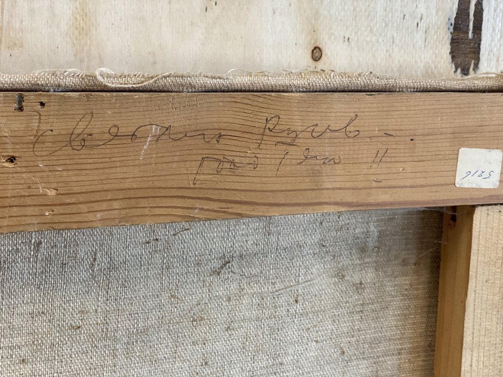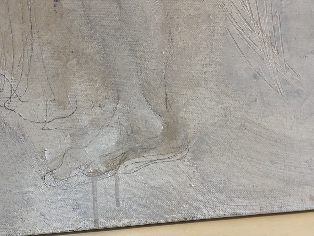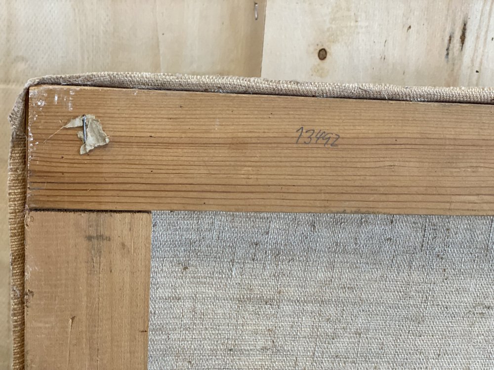 Das Gemälde zeigt einen weiblichen Akt in monochromen Farben. Es ist ungerahmt und rückseitig signiert.