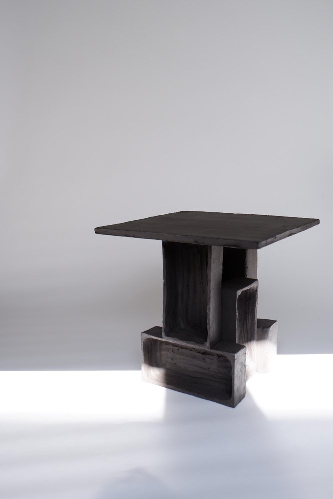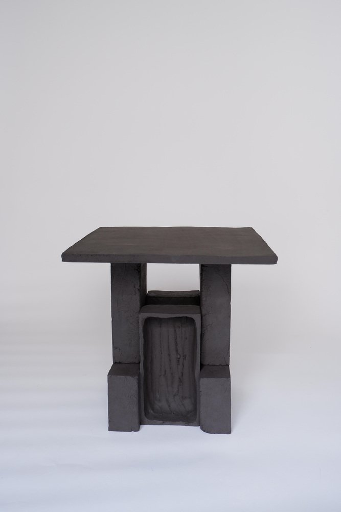 Set Of 2 T03 Coffee Table And Twist Lamp by Ia Kutateladze One Of A Kind. Dimensions: Coffee Table: D 38 x H 37 cm. Twist Lamp: D 20 x W 18 x H 26 cm. Materials: Black clay. Each piece is one of a kind, due to its free hand-building process. The top is always irregular and one of a kind. Possible material variations: raw black, red or white clay. Dimensions may vary. Sculptural, bold but at the same time minimalist, elegantly simple, hand-built table lamp. with two different textured surfaces. Please contact us. All our lamps can be wired according to each country. If sold to the USA it will be wired for the USA for instance. IAAI / Ia Kutateladze is a Georgian multidisciplinary designer based in Berlin. The production is done by her in the studio, where different mediums of design and craft are merged together with experimentation, playfulness and fascination for diverse materials. “To me, design is a palette of boundless imagination, intuitive approach, aesthetic sense and adventurousness expressed through forms. Design excellently transforms everyday life into joyful process of invention. My designs are playful objects of affection, which are results of slight and uncomplicated impressions, observations or interpretations. Sheer simplicity and attention to details, integrated with profound understanding of the surroundings, the past and the future, are at the core of my designs. I would like my designs to be more than functional objects, to have the power to magically interact with people."
