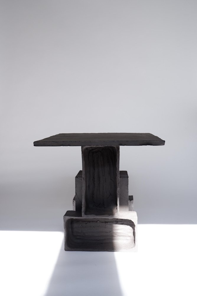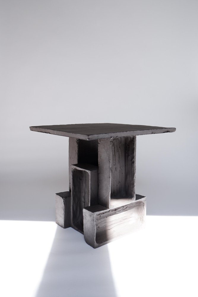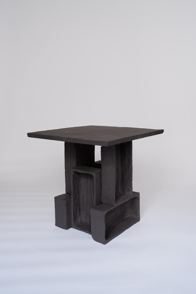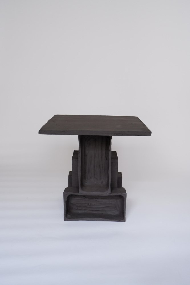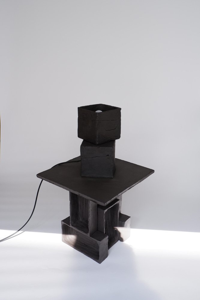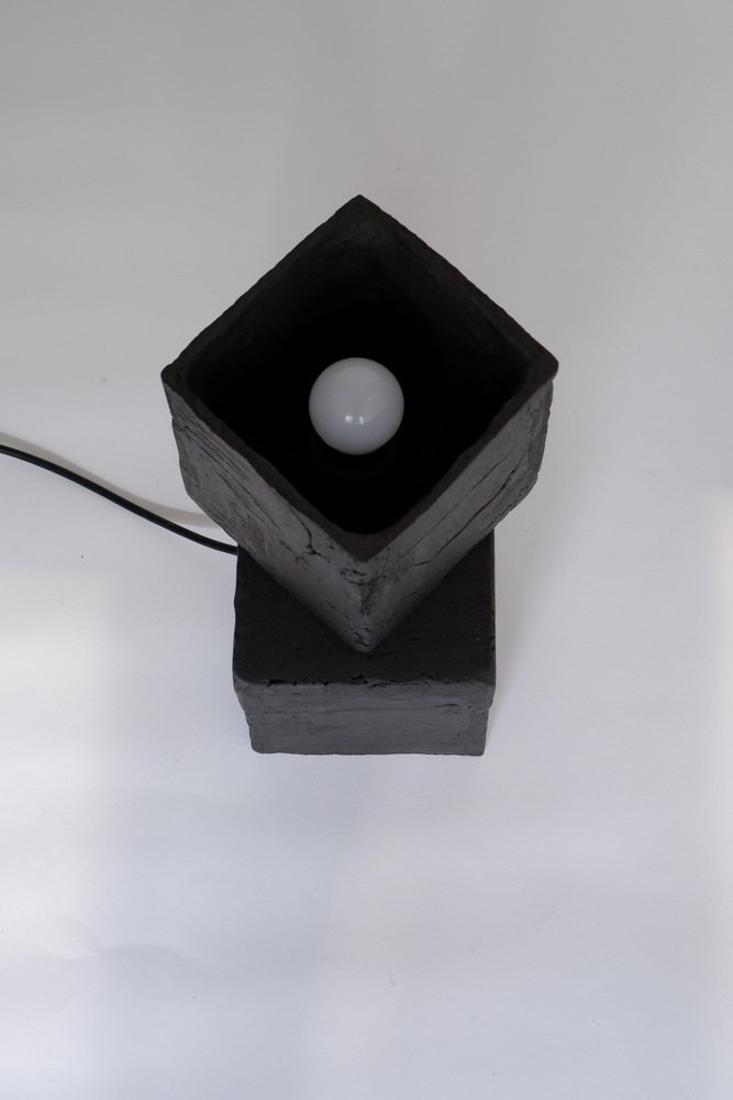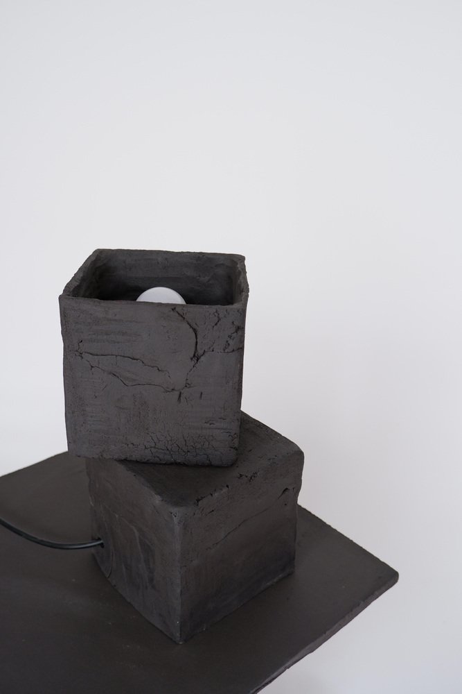 2er-Set T03 Couchtisch und Twist Lampe von Ia Kutateladze One Of A Kind. Abmessungen: Couchtisch: T 38 x H 37 cm. Twist Lampe: T 20 x B 18 x H 26 cm. Materialien: Schwarzer Ton. Jedes Stück ist ein Unikat, da es in freier Handarbeit hergestellt wird. Die Spitze ist immer unregelmäßig und einmalig. Mögliche Materialvarianten: roher schwarzer, roter oder weißer Ton. Die Abmessungen können variieren. Skulpturale, kühne und zugleich minimalistische, elegant-schlichte, handgefertigte Tischleuchte mit zwei unterschiedlich strukturierten Oberflächen. Bitte kontaktieren Sie uns. Alle unsere Lampen können je nach Land verkabelt werden. Bei einem Verkauf in die USA wird sie z.B. für die USA verkabelt. IAAI / Ia Kutateladze ist eine georgische multidisziplinäre Designerin mit Sitz in Berlin. Die Produktion erfolgt bei ihr im Atelier, wo verschiedene Medien des Designs und des Handwerks mit Experimentierfreude, Verspieltheit und der Faszination für diverse Materialien zusammengeführt werden. "Für mich ist Design eine Palette von grenzenloser Vorstellungskraft, intuitiver Herangehensweise, ästhetischem Sinn und Abenteuerlust, die sich in Formen ausdrückt. Design verwandelt das alltägliche Leben in einen freudigen Prozess des Erfindens. Meine Entwürfe sind spielerische Objekte der Zuneigung, die das Ergebnis von leichten und unkomplizierten Eindrücken, Beobachtungen oder Interpretationen sind. Schlichte Einfachheit und Liebe zum Detail, verbunden mit einem tiefen Verständnis für die Umgebung, die Vergangenheit und die Zukunft, sind der Kern meiner Entwürfe. Ich möchte, dass meine Entwürfe mehr als nur funktionale Objekte sind, sie sollen die Kraft haben, auf magische Weise mit den Menschen zu interagieren."