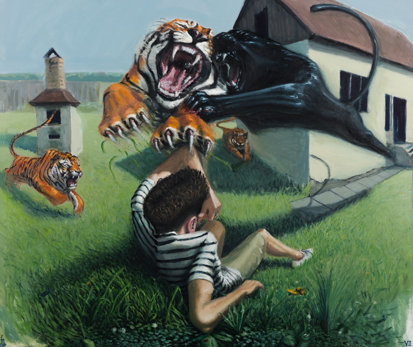 The powerful summer sun was casting its bright light on my head and back while I entered the green yard of my grandmother's house. Maybe it was the hot light making everything slightly gray, or maybe I was getting dizzy from the burning star up above, but I walked pass the house to get behind it for some unclear reason... My eyes were looking down at the grass, as I turned towards the side of the house. I immediately froze in horror because there were 3 crunching big tigers with striking orange eyes staring at me, their new target. They seemed ready to devour every single piece of meat on my body. I made a half step backwards, but my heel did not reach the ground before the closest tiger jumped with its claws and teeth forward, reaching menacingly for my head. I fell on my back and time began to move slower. I was feeling hopeless on the grass, when a black panther suddenly jumped from the front-side of the house directly in the tiger’s face, saving me from certain death.