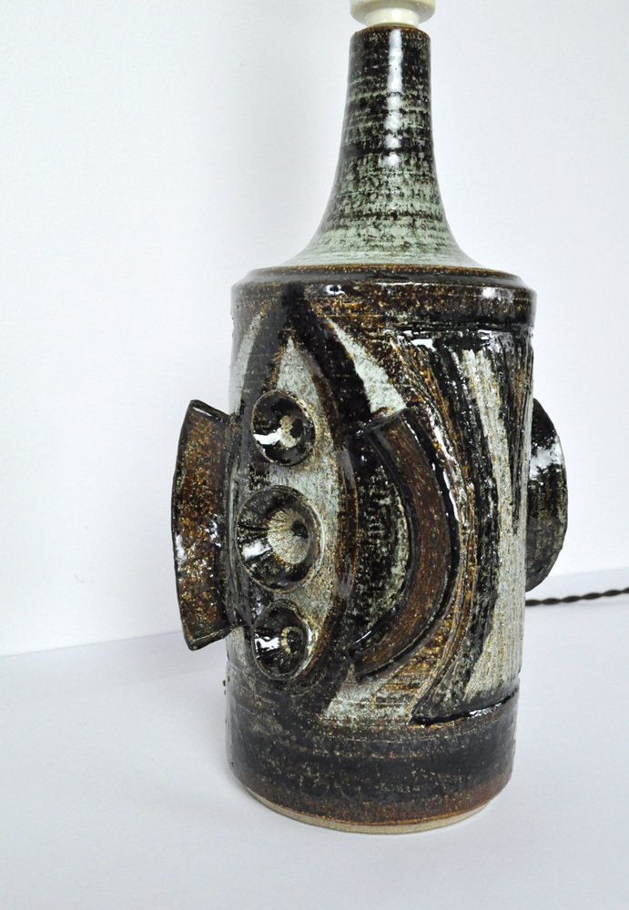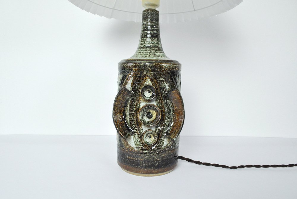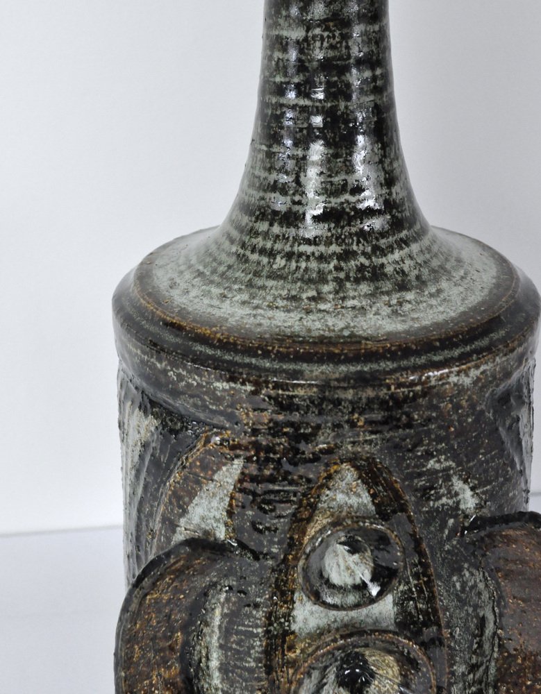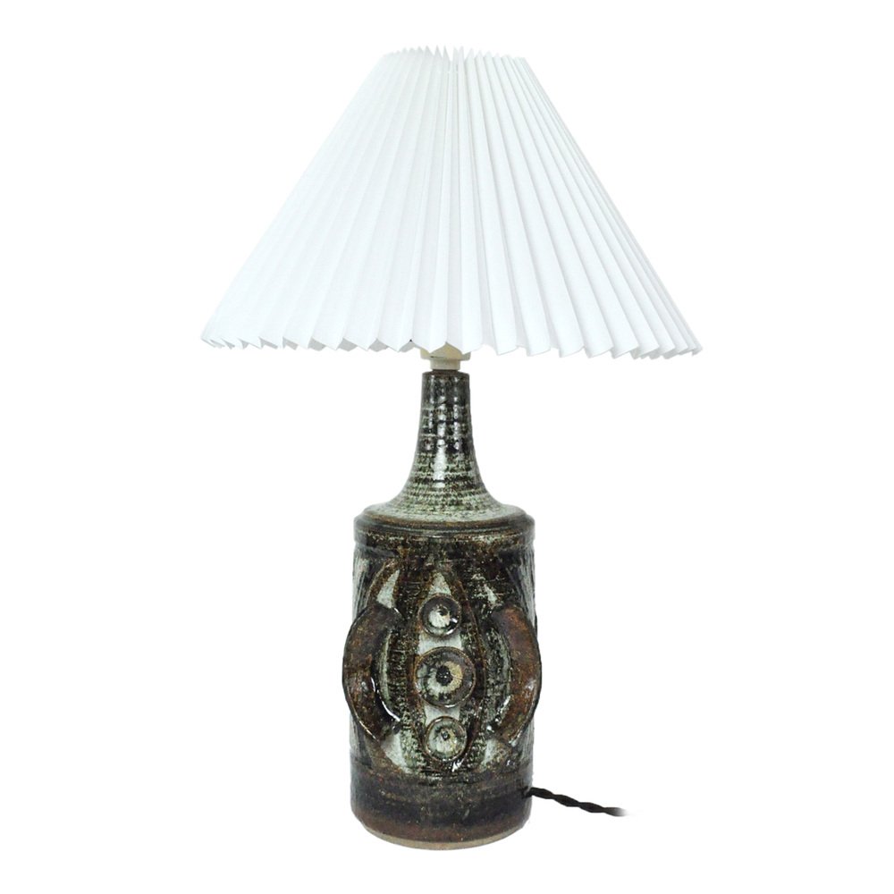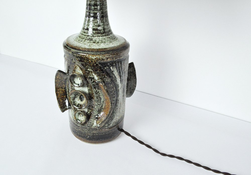 Ceramic Table lamp with a sculpturel abstract expression. Glaze in various tones of grey, turquis, green, brown and black. Designed by Arne Finne Nielsen in 1960s-70s for Søholm, Denmark. Signed by designer and maker. Very fine condition.