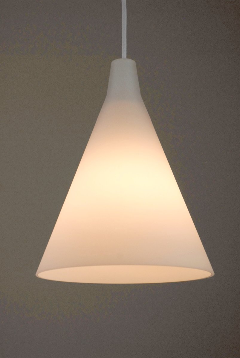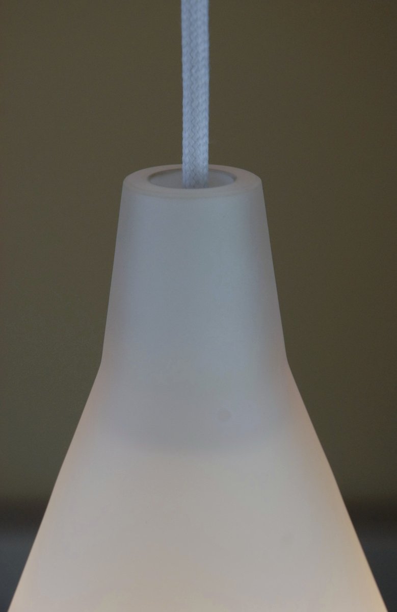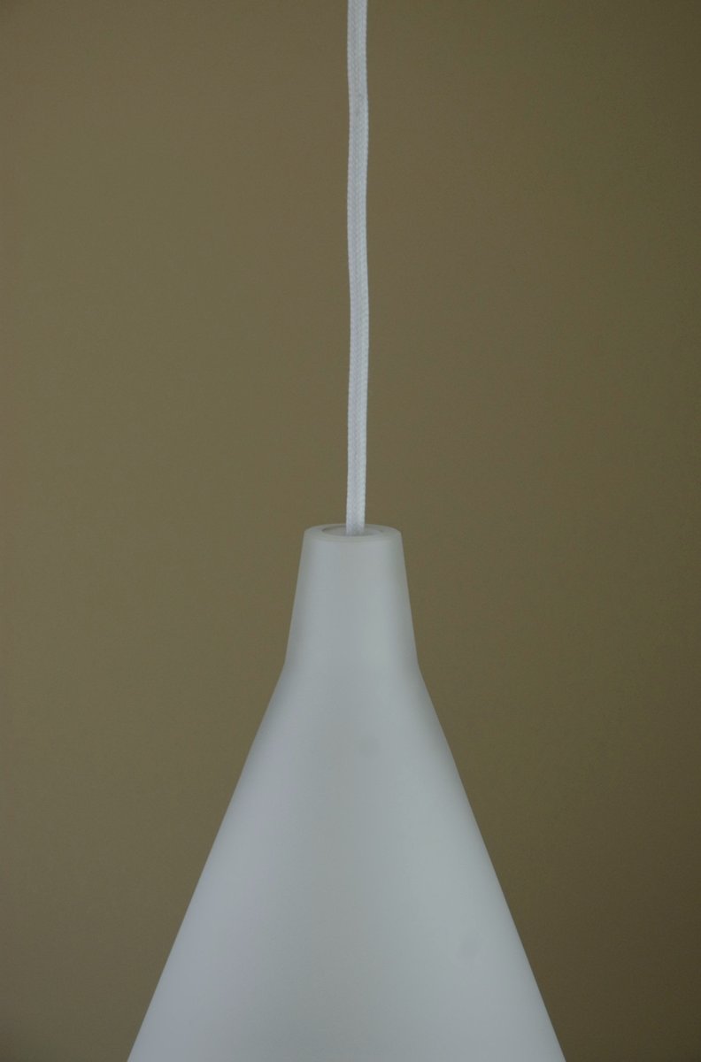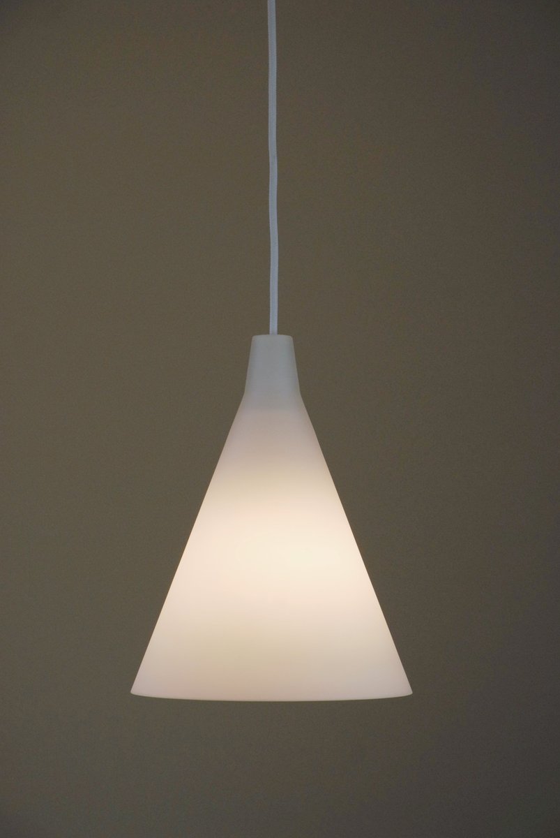 The lamp features a refined conical shade crafted from hand-blown opalescent glass, finished with a soft satin surface. When illuminated, it emits a warm, diffused ambient glow, characteristic of Wirkkala’s approach to light as both a functional and atmospheric element.