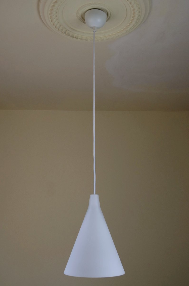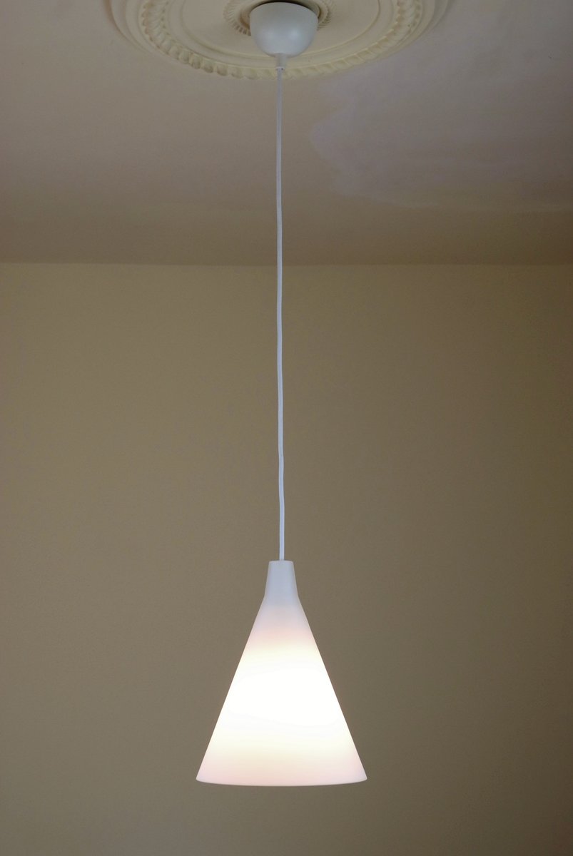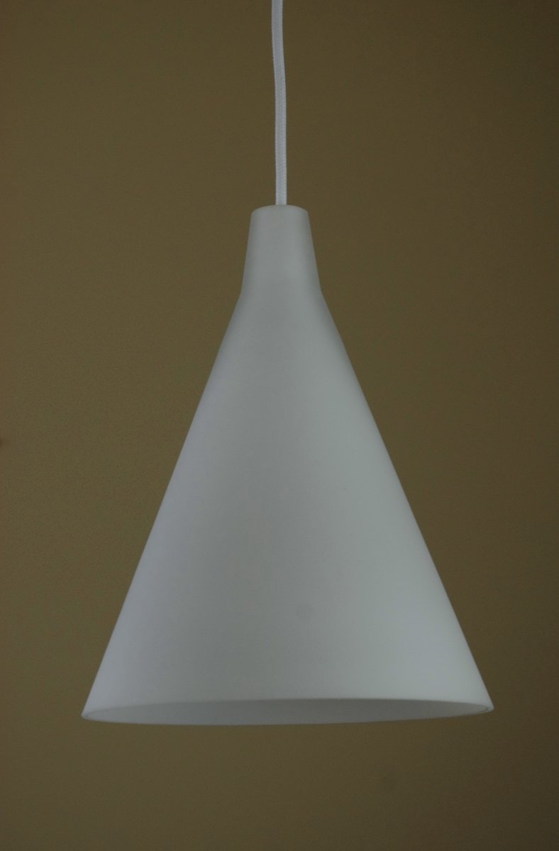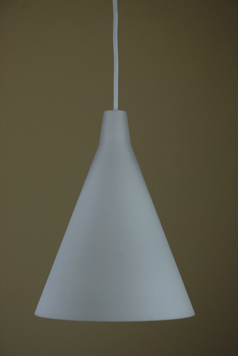 The lamp features a refined conical shade crafted from hand-blown opalescent glass, finished with a soft satin surface. When illuminated, it emits a warm, diffused ambient glow, characteristic of Wirkkala’s approach to light as both a functional and atmospheric element.