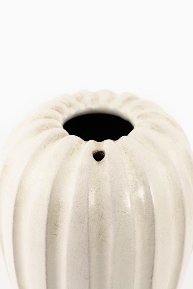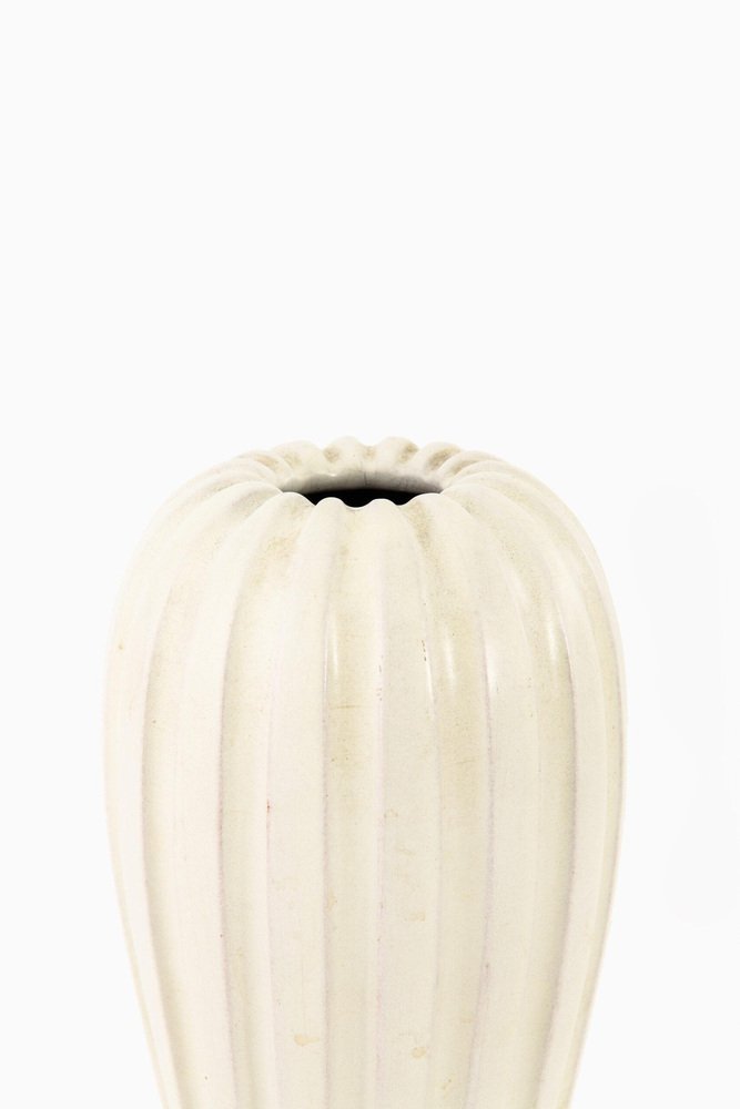 In 1942, Lindstrand left Orrefors to work for Uppsala-Ekeby, a ceramics manufacturer, where he designed groundbreaking pieces with simple lines and strong expressions, such as his Vase in Ceramic (ca. 1950s). After a 10-year tenure with the firm, he entered employment with Kosta glassworks—according to legend, Lindstrand’s Orrefors contract stated he was not allowed to work in the glass industry for 10 years after leaving. At Kosta, Lindstrand designed art glass similar to his Orrefors oeuvre, but he employed more color; among his most well-known pieces are his Höst Vase and his Atlantis Vases (both ca. 1950s), which depicted fishnet lines next to people or schools of fish.