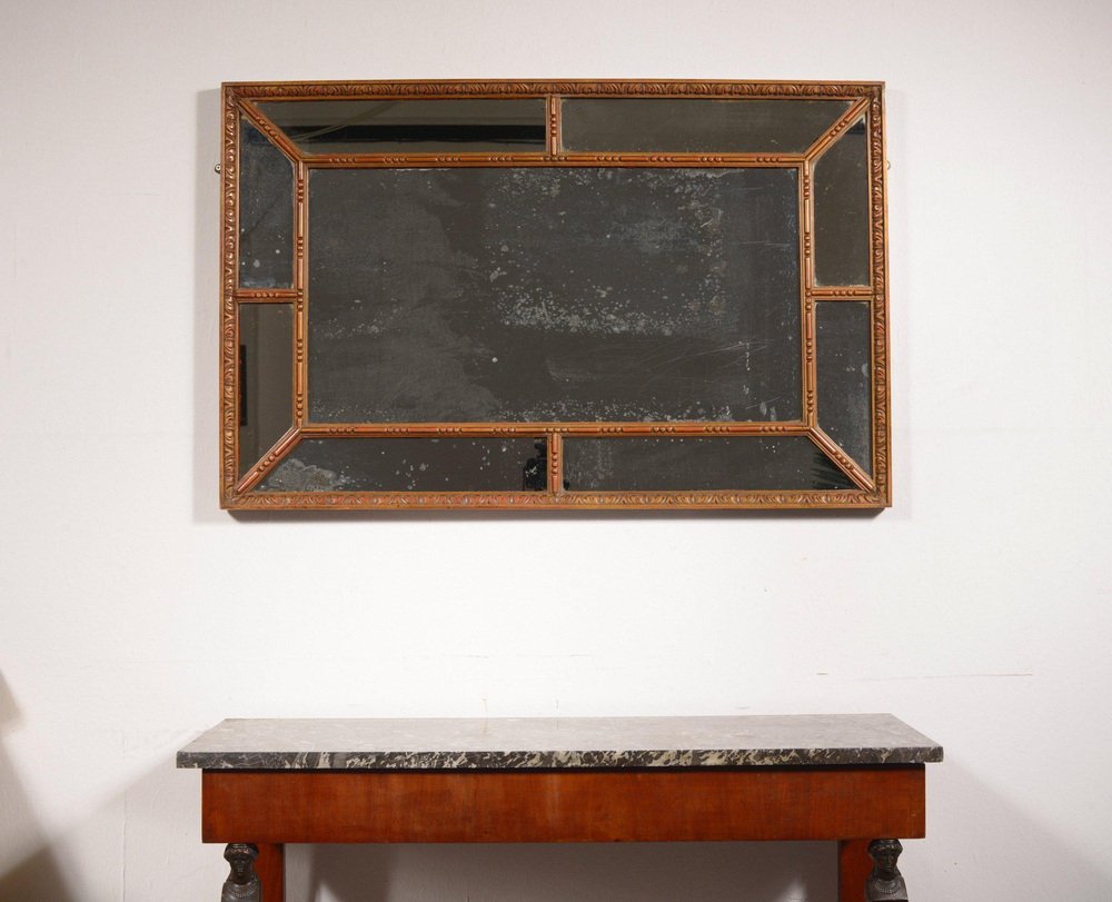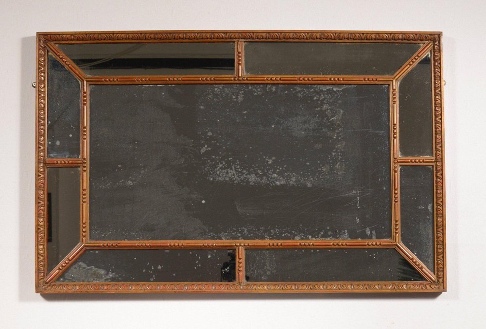 A beautiful Victorian carved gilt wood division mirror, dating to the mid 19th century, having carved line, dot and foliate decoration, with original sparkling silvered mercury glass plates, providing heaps of character. This mirror is a very versatile size and would work in many rooms. Condition: Gilding rather worn and showing the red substrate, which does not detract. Scratches to glass. Overall good, and ready to hang. Dimensions: 69 cm high x 107 cm wide x 4 cm deep.